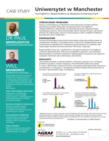 CASE STUDY Uniwersytet w Manchester TurningPoint i ResponseWare na Wydziale Humanistycznym STRESZCZENIE PROBLEMU Grupa e-Learningowa na Wydziale Humanistycznym przeprowadziła pilotażowy program dotyczący oprogramowania TurningPoint i ResponseWare w odpowiedzi na potrzeby personelu akademickiego szukającego systemu, który dostarczyłby takich samych korzyści, jak system pilotów do odpowiedzi, ale przy wykorzystaniu zalet urządzeń mobilnym posiadanych przez studentów. DR PAUL MIDDLEDITCH WYKŁADOWCA MAKROEKONOMII ROZWIĄZANIE Turning Technologies opracowuje technologię edukacyjną skierowaną na zwiększanie interakcji i zaangażowania w nauczaniu bezpośrednim przez umożliwianie wykładowcom zadawania pytań podczas ich wykładu, aby wspomagać dwukierunkową wymianę informacji i dyskusję. ResponseWare łączy się i współdziała z oprogramowaniem TurningPoint i pilotami ResponseCard, które są w posiadaniu wydziału i pracowników. ResponseWare umożliwia studentom odpowiadanie za pomocą ich własnych urządzeń mobilnych jako alternatywy do pilotów. REZULTATY WILL MOINDROT TECHNOLOG DS. NAUCZANIA Wprowadzenie tej technologii na wykłady ma mnóstwo zalet, ale w mojej opinii najważniejsze z nich są te najbardziej zaskakujące albo te, które są wypracowywane przez wykładowców podczas użytkowania systemu. PRZYKŁADY: Sesja wspomagająca dysertację Anonimowo, umożliwiając studentom ocenę swojego zaawansowania i zidentyfikowanie stref problemowych, w których potrzebują pomocy. Ten projekt pokazał, że ResponseWare z łatwością wpisuje się w istniejące praktyki nauczania. Dzięki integracji z PowerPoint® system jest prosty w użyciu. Możliwości uzyskania licencji na wydział wspierają model zakupowy uniwersytetu, a integracja z istniejącymi pilotami ResponseCard pozwala na szerokie zastosowanie tego rozwiązania. Czy uważasz, że użytecznym było użycie twojego własnego urządzenia w sesji? Czy system odpowiedzi zwiększył mój poziom satysfakcji z zajęć? A. Tak B. Nie wiem C. Nie A. Zgadzam się B. Nie zgadzam się Jak według Ciebie w skali od 1 do 10 system zwiększy Twoją satysfakcję z zajęć? Czy jesteś zadowolony ze sposobu otrzymywania informacji zwrotnych wykorzystując do tego swoje własne urządzenie? A. 8-10 B. 4-7 C. 1-3 Warsztaty umiejętności badawczych Patrząc na techniki analizy ilościowej, można używać TurningPoint do zbierania danych generowanych na żywo. Stowarzyszenia studentów Stowarzyszenie inwestowania i handlu zademonstrowało działanie rynku za pomocą gier i symulacji. Sesje rewizyjne Obecnie zaczynamy wprowadzać elementy konkurencji poprzez dzielenie grupy na zespoły. A. Bardzo zadowolony B. Zadowolony C. Neutralny D. Niezadowolony „Wspaniała sprawa. Często używamy naszych telefonów do odpowiedzi, gdy tracimy koncentrację, zainteresowanie lub wykład staje się niezrozumiały. Dlatego też uważam, że użycie naszych własnych urządzeń zwiększy naszą uwagę i zaangażowanie oraz umożliwi sprawdzenie czy nasze zrozumienie tematu jest poprawne.” - Student z Uniwersytetu w Manchester Producent Partner regionalny: Dystrybutor Agraf Sp. z o.o. ul. Nowe Sady 2, 94-102 Łódź Tel. (42) 25 03 185 | [email protected] www.interwrite.pl