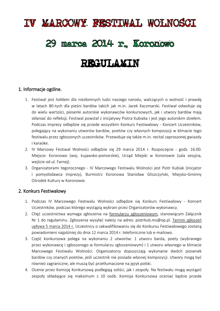 1. Informacje ogólne. 1. Festiwal jest hołdem dla niezłomnych ludzi naszego narodu, walczących o wolność i prawdę w latach 80-tych dla pieśni bardów takich jak m.in. Jacek Kaczmarski. Festiwal odwołuje się do wielu wartości, piosenki autorskie wykonawców konkursowych, jak i utwory bardów mają skłaniać do refleksji. Festiwal powstał z inicjatywy Piotra Kubiaka i jest jego autorskim dziełem. Podczas imprezy odbędzie się przede wszystkim Konkurs Festiwalowy - Koncert Uczestników, polegający na wykonaniu utworów bardów, poetów czy własnych kompozycji w klimacie tego festiwalu przez zgłoszonych uczestników. Przewiduje się także m.in. recital zaproszonej gwiazdy i karaoke. 2. IV Marcowy Festiwal Wolności odbędzie się 29 marca 2014 r. Rozpoczęcie - godz. 16.00. Miejsce: Koronowo (woj. kujawsko-pomorskie), Urząd Miejski w Koronowie (sala sesyjna, wejście od ul. Farnej). 3. Organizatorami tegorocznego - IV Marcowego Festiwalu Wolności jest Piotr Kubiak (inicjator i pomysłodawca imprezy), Burmistrz Koronowa Stanisław Gliszczyński, Miejsko-Gminny Ośrodek Kultury w Koronowie. 2. Konkurs Festiwalowy 1. Podczas IV Marcowego Festiwalu Wolności odbędzie się Konkurs Festiwalowy - Koncert Uczestników, podczas którego wystąpią wybrani przez Organizatorów wykonawcy. 2. Chęć uczestnictwa wymaga zgłoszenia na formularzu zgłoszeniowym, stanowiącym Załącznik Nr 1 do regulaminu. Zgłoszenia wysyłać należy na adres: [email protected]. Termin zgłoszeń upływa 5 marca 2014 r. Uczestnicy o zakwalifikowaniu się do Konkursu Festiwalowego zostaną powiadomieni najpóźniej do dnia 12 marca 2014 r. telefonicznie lub e-mailowo. 3. Część konkursowa polega na wykonaniu 2 utworów: 1 utworu barda, poety (wybranego przez wykonawcę i zgłoszonego w formularzu zgłoszeniowym) i 1 utworu własnego w klimacie Marcowego Festiwalu Wolności. Organizatorzy dopuszczają wykonanie dwóch piosenek bardów czy znanych poetów, jeśli uczestnik nie posiada własnej kompozycji. Utwory mogą być również zagraniczne, ale muszą być przetłumaczone na język polski. 4. Ocenie przez Komisję Konkursową podlegają soliści, jak i zespoły. Na festiwalu mogą wystąpić zespoły składające się maksimum z 10 osób. Komisja Konkursowa oceniać będzie przede wszystkim interpretację, zaangażowanie w wykonywany utwór, poziom przekazu. Decyzje Komisji Konkursowej są ostateczne. 5. Określa się maksymalną liczbę uczestników/zgłoszeń na 12, minimalną na 6. 6. Czas trwania występu jednego wykonawcy ustala się maksymalnie na 10 minut. 7. Podczas imprezy decyduje alfabetyczna kolejność wystąpień (od nazwy wykonawcy). 8. Wykonawca nie ma obowiązku wcześniejszego przesyłania do Organizatora demo swoich nagrań, podlega on zakwalifikowaniu na podstawie rozpoznania twórczości zamieszczanej w internecie. W formularzu zgłoszeniowym należy podać link, gdzie znajdują się materiały mogące potwierdzić dorobek artystyczny (piosenki, czy próby twórcze wykonawcy). 9. W IV Festiwalu nie może wystąpić w części konkursowej zwycięzca III edycji. 10. Wykonując utwór na Marcowym Festiwalu Wolności autor wyraża zgodę na rejestrację występu z wykorzystaniem nagrań w publicznych mediach, internecie. Nagrań z festiwalu dokonują Organizatorzy lub osoby do tego upoważnione przez Organizatorów. 11. Wykonawca konkursowy rezygnuje z roszczeń finansowych, wynikających z praw wykonawczych i pokrewnych - dotyczy to występu na Marcowym Festiwalu Wolności, jego rejestracji z wykorzystaniem nagrań w radiu, TV, internecie czy na płytach. 12. Organizatorzy nie zwracają kosztów przyjazdu na Festiwal. Zapotrzebowanie na noclegi rozpatrywane będą przez Organizatorów indywidualnie. 13. Organizator przewiduje wręczenie trzech nagród głównych za zajęcie I, II i III miejsca w Konkursie Festiwalowym. Wysokość nagród: 1.200,00 zł - I miejsce, 800,00 zł - II miejsce, 400,00 zł - III miejsce (nagrody są kwotami brutto). W przypadku pozyskania partnerów, sponsorów przewiduje się wręczenie innych dodatkowych nagród, upominków czy wyróżnień. 3. Inne Postanowienia 1. Program IV Marcowego Festiwalu Wolności przewiduje: Konkurs Festiwalowy, recital Pana Andrzeja Dyszaka, karaoke. 2. Przystąpienie do udziału w imprezie oznacza przyjęcie niniejszego regulaminu. 3. Do interpretacji niniejszego regulaminu uprawniony jest jedynie Organizator, który zastrzega sobie możliwość zmian w regulaminie i programie imprezy. www.facebook.com/marcowy.festiwal www.koronowo.pl Kontakt: Piotr Kubiak, Pomysłodawca Marcowego Festiwalu Wolności tel. 603 049 067, e-mail: [email protected] Magdalena Tabasz, Urząd Miejski w Koronowie tel. (52) 382-64-04, e-mail: [email protected]
