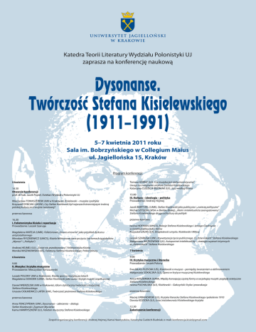 Katedra Teorii Literatury Wydzia³u Polonistyki UJ zaprasza na konferencjê naukow¹ Dysonanse. Twórczość Stefana Kisielewskiego (1911–1991) 5–7 kwietnia 2011 roku Sala im. Bobrzyñskiego w Collegium Maius ul. Jagielloñska 15, Kraków Program konferencji: 5 kwietnia 14.30 Otwarcie konferencji prof. dr hab. Jacek Popiel, Dziekan Wydzia³u Polonistyki UJ Mieczys³aw TOMASZEWSKI (AM w Krakowie), Kisielewski – muzyka i polityka Krzysztof DYBCIAK (UKSW), Czy Stefan Kisielewski by³ najwszechstronniejszym twórc¹ polskiej kultury po II wojnie œwiatowej? przerwa kawowa 16.30 I. Felietonistyka Kisiela i reperkusje Prowadzenie: Leszek Szaruga Magdalena MATEJA (UMK), Felietonowa „mowa umowna” jako przyk³ad dyskursu antytotalitarnego Miros³aw RYSZKIEWICZ (UMCS), Kisiela felietonowe ¿ycie po ¿yciu (na ³amach tygodników „Wprost” i „Polityka”) Andrzej HEJMEJ (UJ), „Œwiat nie przedstawiony”. Felietonistyka Kisiela Monika WISZNIOWSKA (UŒ), Felietony Stefana Kisielewskiego. Próba lektury 6 kwietnia 9.00 II. Muzyka i krytyka muzyczna Prowadzenie: Mieczys³aw Tomaszewski Leszek POLONY (AM w Krakowie), Kisiela spory o muzykê po latach Magdalena DZIADEK (UAM), Stefan Kisielewski jako autor i krytyk muzyki wspó³czesnej Daniel WIERZEJSKI (AM w Krakowie), Idiom stylistyczny twórczoœci muzycznej Stefana Kisielewskiego Urszula CIO£KIEWICZ-LATEK (UW), Twórczoœæ pieœniowa Stefana Kisielewskiego Tomasz GÓRNY (UJ), Czy muzyka jest niehumanistyczna? Uwagi na marginesie artyku³u Stefana Kisielewskiego Katarzyna CUDZICH-BUDNIAK (UJ), Jazz wed³ug Kisiela 15.00 III. Kultura – ideologia – polityka Prowadzenie: Andrzej Hejmej Jacek BARTYZEL (UMK), Stefan Kisielewski jako publicysta i „zwierzê polityczne” Micha³ SZYSZKA (WSA w Bielsku Bia³ej), „Klerk i intelektualista zaanga¿owany”. Stefana Kisielewskiego droga od kultury do polityki przerwa kawowa Iwona HOFMAN (UMCS), Relacje Stefana Kisielewskiego i Jerzego Giedroycia w œwietle publicystyki i listów Krzysztof ZAJAS (UJ), Drapie¿noœæ umys³u. Kisielewski i Mi³osz Leszek SZARUGA (UW), Prywatyzacja ¿ycia publicznego. O „Dziennikach” Stefana Kisielewskiego Ma³gorzata W¥TKOWSKA (UJ), Autoportret intelektualisty – strategia wyznañ intymnych w „Dziennikach” Stefana Kisielewskiego 7 kwietnia 9.00 IV. Krytyka muzyczna i literacka Prowadzenie: Leszek Polony Ewa BI£AS-PLESZAK (UŒ), Kisielewski o muzyce – pomiêdzy tworzeniem a definiowaniem Ma³gorzata SOKALSKA (UJ), Opera w krytyce muzycznej Kisielewskiego Anna KOSZEWSKA (UAM), Miêdzy koncepcj¹ czystej formy a socjologi¹ muzyki: pogl¹dy estetyczne Stefana Kisielewskiego Iwona PUCHALSKA (UJ), Kisielewski – Ga³czyñski: liryka i prowokacja przerwa kawowa Maciej URBANOWSKI (UJ), Krytyka literacka Stefana Kisielewskiego i pokolenie 1910 Dorota KOZICKA (UJ), Lista (nie)obecnoœci Kisielewskiego-krytyka przerwa kawowa Anna TENCZYÑSKA (UW), Dysonanse – zderzenia – dialogi. Stefan Kisielewski i Zygmunt Mycielski Kama HAWRYSZKÓW (UJ), Felieton muzyczny Stefana Kisielewskiego 12.30 Zakoñczenie konferencji Zespó³ organizacyjny konferencji: Andrzej Hejmej, Kama Hawryszków, Katarzyna Cudzich-Budniak; e-mail: [email protected]