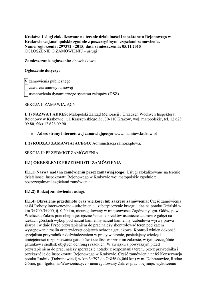 Kraków: Usługi zlokalizowane na terenie działalności Inspektoratu Rejonowego w Krakowie woj.małopolskie zgodnie z poszczególnymi częściami zamówienia. Numer ogłoszenia: 297372 - 2015; data zamieszczenia: 05.11.2015 OGŁOSZENIE O ZAMÓWIENIU - usługi Zamieszczanie ogłoszenia: obowiązkowe. Ogłoszenie dotyczy: V zamówienia publicznego zawarcia umowy ramowej ustanowienia dynamicznego systemu zakupów (DSZ) SEKCJA I: ZAMAWIAJĄCY I. 1) NAZWA I ADRES: Małopolski Zarząd Melioracji i Urządzeń Wodnych Inspektorat Rejonowy w Krakowie , ul. Kraszewskiego 36, 30-110 Kraków, woj. małopolskie, tel. 12 628 09 80, faks 12 628 09 90. • Adres strony internetowej zamawiającego: www.mzmiuw.krakow.pl I. 2) RODZAJ ZAMAWIAJĄCEGO: Administracja samorządowa. SEKCJA II: PRZEDMIOT ZAMÓWIENIA II.1) OKREŚLENIE PRZEDMIOTU ZAMÓWIENIA II.1.1) Nazwa nadana zamówieniu przez zamawiającego: Usługi zlokalizowane na terenie działalności Inspektoratu Rejonowego w Krakowie woj.małopolskie zgodnie z poszczególnymi częściami zamówienia.. II.1.2) Rodzaj zamówienia: usługi. II.1.4) Określenie przedmiotu oraz wielkości lub zakresu zamówienia: Część zamówienia nr 84 Roboty interwencyjne - udrożnienie i zabezpieczenie brzegu i dna na potoku Dzialski w km 3+700-3+900, tj. 0,20 km, nieuregulowany w miejscowości Zagórzany, gm. Gdów, pow. Wieliczka Zakres prac obejmuje: ręczne ścinanie krzaków usunięcie zatorów z gałęzi na rzekach górskich wykop pod narzut kamienny narzut kamienny -zabudowa wyrwy prawa skarpa i w dnie Przed przystąpieniem do prac należy skontrolować teren pod kątem występowania roślin oraz zwierząt objętych ochrona gatunkową. Kontroli winien dokonać specjalista przyrodnik z doświadczeniem w pracy w terenie, posiadający wiedzę i umiejętności rozpoznawania gatunków i siedlisk w szerokim zakresie, w tym szczególnie gatunków i siedlisk objętych ochroną i rzadkich. W związku z powyższym przed przystąpieniem do prac; należy sporządzić notatkę z rozpoznania terenu przez przyrodnika i przekazać ją do Inspektoratu Rejonowego w Krakowie. Część zamówienia nr 85 Konserwacja potoku Rudnik (Dobranowicki) w km 3+792 do 7+856 (4,064 km) w m. Dobranowice, Rudno Górne, gm. Igołomia-Wawrzeńczyce - nieuregulowany Zakres prac obejmuje: wykoszeniu roślinności wodnej składającej się w przeważającej części z roślinności gęstej na skarpach; wygrabieniu ze skarp i, złożeniu w kopy wzdłuż krawędzi potoku. wywiezieniu odpadów i resztek nieulegających szybkiej biodegradacji; wycince odrostów krzewów; Posegregowanie gałęzi i innych odpadów udrożnieniu koryta poprzez usuniecie nanosu, wykonywane z użyciem koparko-odmularki , złożeniem urobku na odkład poza górną krawędzią wykopu, wyprofilowanie skarp i dna cieku. Formowanie z grubsza dna i skarp. Rozplantowanie ziemi po robotach wodno-inżynieryjnych. Zmiana stanowiska roboczego po wykonaniu wymaganego profilu wywiezieniu resztek roślinnych folii, drewna na wysypisko uporządkowanie terenu po zakończeniu prac. Prace należy prowadzić z uwzględnieniem warunków podanych w decyzji RDOŚ (w załączeniu).Przed przystąpieniem do prac należy skontrolować teren pod kątem występowania roślin oraz zwierząt objętych ochrona gatunkową. Kontroli winien dokonać specjalista przyrodnik z doświadczeniem w pracy w terenie, posiadający wiedzę i umiejętności rozpoznawania gatunków i siedlisk w szerokim zakresie, w tym szczególnie gatunków i siedlisk objętych ochroną i rzadkich. W związku z powyższym przed przystąpieniem do prac; należy sporządzić notatkę z rozpoznania terenu przez przyrodnika i przekazać ją do Inspektoratu Rejonowego w Krakowie. Część zamówienia nr 86 1.Roboty interwencyjne - konserwacja potoku Bibiczanka w km 0+4650+540 (nieuregulowany L=75m) w m.Kraków, gm.Kraków, pow.Kraków Zakres prac obejmuje: Ręczne wykoszenie porostów gęstych twardych ze skarp Ręczne wykoszenie porostów gęstych twardych z dna cieków Wygrabianie wykoszonych porostów ze skarp i cieku z wywozem i zagospodarowaniem we własnym zakresie Ręczne ścinanie krzaków i podszyć gęstych wraz z wywozem i zagospodarowaniem we własnym zakresie Przycinka korekcyjna bardzo dużych drzew wierzb ze złamanymi konarami i wiszącymi na innych drzewach wraz z wywozem i zagospodarowaniem we własnym zakresie. Przedmiotowe drzewa sąsiadują z altaną działkową oraz ogrodzeniami Usunięcie przetamowań (gałęzie, konary, śmieci) z dna potoku oraz skarp wraz z wywozem i zagospodarowaniem we własnym zakresie Uporządkowanie terenu po zakończeniu prac 2. Roboty interwencyjne - konserwacja potoku Bibiczanka w km 0+540-1+200 (nieuregulowany L=660m) w m.Kraków, gm.Kraków, pow.Kraków Zakres prac obejmuje: Ręczne wykoszenie porostów gęstych twardych ze skarp Wygrabianie wykoszonych porostów ze skarp i cieku z wywozem i zagospodarowaniem we własnym zakresie Ręczne ścinanie krzaków i podszyć gęstych wraz z wywozem i zagospodarowaniem we własnym zakresie Przycinka korekcyjna dolnych gałęzi drzew wraz z wywozem i zagospodarowaniem we własnym zakresie Usunięcie przetamowań (gałęzie, konary, śmieci) z dna potoku oraz skarp wraz z wywozem i zagospodarowaniem we własnym zakresie Uporządkowanie terenu po zakończeniu prac Część zamówienia nr 87 1.Konserwacja rzeki Sanka w km 7+200-9+450 (1480,00 m uregulowana, 770,00m nieuregulowana) - 2,25km - miejscowość Mników, gmina Liszki, powiat krakowski Zakres prac obejmuje: ręczne wykoszenie, wygrabienie porostów gęstych, twardych ze skarp o szer. do 2m, usuwanie kożucha roślin przy gł.cieku ponad 1,0m ręczne ścinanie krzaków, średniej gęstości, przycięcie piłą lub siekierą drzew o śr.26-35cm, ręczne usuwanie zatorów utrudniających swobodny przepływ wód z koryta potoku o głębokości do 1,0m i szerokości dna 2,0-2,3m usuwanie przeszkody utrudniającej swobodny przepływ wody - Roboty ziemn
