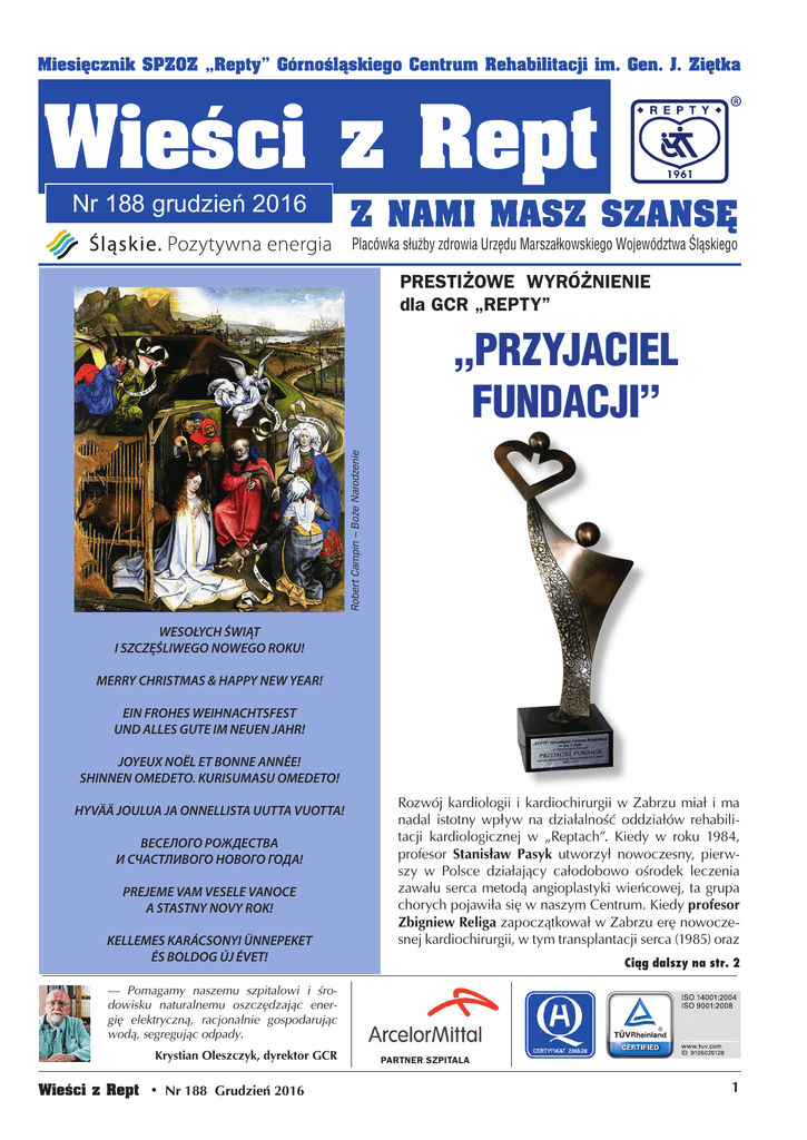 Nr 188 grudzień 2016 Placówka służby zdrowia Urzędu Marszałkowskiego Województwa Śląskiego PRESTIŻOWE WYRÓŻNIENIE dla GCR „REPTY” Robert Campin – Boże Narodzenie „PRZYJACIEL FUNDACJI” WESOŁYCH ŚWIĄT I SZCZĘŚLIWEGO NOWEGO ROKU! MERRY CHRISTMAS & HAPPY NEW YEAR! EIN FROHES WEIHNACHTSFEST UND ALLES GUTE IM NEUEN JAHR! JOYEUX NOЁL ET BONNE ANNÉE! SHINNEN OMEDETO. KURISUMASU OMEDETO! HYVÄÄ JOULUA JA ONNELLISTA UUTTA VUOTTA! ВЕСЕЛОГО РОЖДЕСТВА И СЧАСТЛИВОГО НОВОГО ГОДА! PREJEME VAM VESELE VANOCE A STASTNY NOVY ROK! KELLEMES KARÁCSONYI ÜNNEPEKET ÉS BOLDOG ÚJ ÉVET! Rozwój kardiologii i kardiochirurgii w Zabrzu miał i ma nadal istotny wpływ na działalność oddziałów rehabilitacji kardiologicznej w „Reptach”. Kiedy w roku 1984, profesor Stanisław Pasyk utworzył nowoczesny, pierwszy w Polsce działający całodobowo ośrodek leczenia zawału serca metodą angioplastyki wieńcowej, ta grupa chorych pojawiła się w naszym Centrum. Kiedy profesor Zbigniew Religa zapoczątkował w Zabrzu erę nowoczesnej kardiochirurgii, w tym transplantacji serca (1985) oraz Ciąg dalszy na str. 2 — Pomagamy naszemu szpitalowi i środowisku naturalnemu oszczędzając energię elektryczną, racjonalnie gospodarując wodą, segregując odpady. Krystian Oleszczyk, dyrektor GCR Wieści z Rept • Nr 188 Grudzień 2016 PARTNER SZPITALA 1 Ciąg dalszy ze str. 1 „PRZYJACIEL FUNDACJI” mechanicznego wspomagania krążenia (1987), chorzy po operacjach kardiochirurgicznych rehabilitowani byli (i są kierowani nadal) do „Rept”. Doniesienia o rehabilitacji pacjentów kardiochirurgicznych pracownicy GCR „Repty” prezentowali na sympozjach i kongresach Polskiego Towarzystwa Kardiologicznego. Owocem tych prac były także dwa doktoraty (J. Rybicki, K. Oleszczyk). Współpraca ze Śląskim Centrum Chorób Serca (dawniej Wojewódzkim Ośrodkiem Kardiologii w Zabrzu) jest kontynuowana. Profesor Zbigniew Religa w 1991 roku założył Fundację Rozwoju Kardiochirurgii z siedzibą w Zabrzu. Misją Fundacji jest od początku wspieranie rozwoju polskiej kardiochirurgii oraz wprowadzanie do praktyki klinicznej nowoczesnych technik i technologii w zakresie leczenia serca. Prof. Zbigniew Religa zmarł 8 marca 2009 roku, 21 kwietnia tego roku Fundacja przyjęła nową nazwę: Fundacja Rozwoju Kardiochirurgii im. prof. Zbigniewa Religi. Od roku 2010 w Śląskim Centrum Chorób Serca wykonuje się operacje wszczepienia urządzeń wspomagających pracę lewej komory serca (LVAD – left ventricular assist device). Pomoc techniczną mechanicznego wspomagania krążenia u tych chorych sprawują inżynierowie Fundacji Rozwoju Kardiochirurgii im. prof. Zbigniewa Religi (R. Kustosz, M. Gawlikowski, M. Gło- Uroczyste wręczenie wyróżnienia „Przyjaciel Fundacji”. wacki). Pacjenci z wszczepionymi w Zabrzu pompami wspomagającymi pracę lewej komory serca kierowani są do rehabilitacji w II Oddziale Rehabilitacji Kardiologicznej GCR „Repty”. Unikalne w kraju doświadczenie w dziedzinie rehabilitacji tych chorych przedstawiono w specjalistycznej prasie (Kardiochirurgia i Torakochirurgia Polska) i na licznych krajowych i zagranicznych konferencjach, sympozjach i kongresach. We właściwych sobie zakresach doniesienia prezentowali lekarze, pielęgniarki i fizjoterapeuci. W bieżącym roku Fundacja Rozwoju Kardiochirurgii im. prof. Zbigniewa Religi obchodzi swoje 25-lecie i zgodnie z tradycją, 19 listopada w Zabrzańskim Domu Muzyki i Tańca odbył się uroczysty koncert „Serce za Serce”, tym razem zatytułowany „Śląsk Relidze”. Uroczystość uświetnił występ Zespołu Pieśni i Tańca Śląsk im. Stanisława Hadyny. Z okazji jubileuszu Fundacji wyróżniono osoby i instytucje z nią blisko związane i zasłużone. Wyróżnienia obejmowały kategorie: „Partner”, „Sponsor” i „Przyjaciel Fundacji”. W tej ostatniej wyróżniono GCR „Repty”. Prestiżową statuetkę i dyplom z rąk dyrektora Fundacji dr. Jana Sarny i prezesa Rady Fundacji prof. Andrzeja Karbownika odebrał dyrektor GCR „Repty” dr Krystian Oleszczyk. D.S. CORAZ BLIŻEJ UTWORZENIA SAMORZĄDU FIZJOTERAPEUTÓW Od kilku miesięcy trwają intensywne prace nad powołaniem do istnienia samorządu fizjoterapeutów. W czerwcu ukonstytuował się Komitet Organizacyjny Samorządu Fizjoterapeutów (KOSF), którego zadaniem jest przygotowanie ogólnokrajowych wyborów władz nowej instytucji. W tym celu 5 listopada w całej Polsce odbyły się Zgromadzenia Wojewódzkie. Zarejestrowani fizjoterapeuci wybrali swoich delegatów na I Krajowy Zjazd Fizjoterapeutów, na którym delegaci wybiorą członków Krajowej Izby 2 Fizjoterapeutycznej – organu nadrzędnego całego środowiska fizjoterapeutów. — Łącznie wybrano ponad 300 delegatów w tym 42 z naszego regionu. Nasz ośrodek reprezentować będzie aż sześciu fizjoterapeutów. Będą to: mgr Katarzyna Bugajska-Sysiak, mgr Michał Rau, technik fizjoterapii Jan Okraska, technik fizjoterapii Łukasz Zieliński, a także mgr Mariusz Stachowiak i mgr Paweł Kazimierczak — mówi dr n. k. f. Krzysztof Mehlich, zastępca dyrektora ds. fizjoterapii w GCR „Repty”. — To duża reprezentacja szpitala, która czyni nasz ośrodek silną grupą wyborczą spośród wszystkich placówek zajmujących się rehabilitacją — dodaje. Województwo Śląskie poprzez liczbę delegatów stanowi drugą siłę wyborczą w skali całego kraju. Zjazd odbędzie się na początku 2017 r. – dokładna data wyborów jest w trakcie ustalania. Szczegółowe informacje na temat postępu prac i planowanych wydarzeń można znaleźć na stronie: www.kosf.pl. Grudzień 2016 Nr 188 • Wieści z Rept NAUKOWO I UROCZYŚCIE Tegoroczni laureaci Nagrody Dyrektora. 24 listopada w Górnośląskim Centrum Rehabilitacji „Repty” odbyła się Ogólnopolska Konferencja NaukowoSzkoleniowa „Rehabilitacja skoordynowana osób niepełnosprawnych – lec