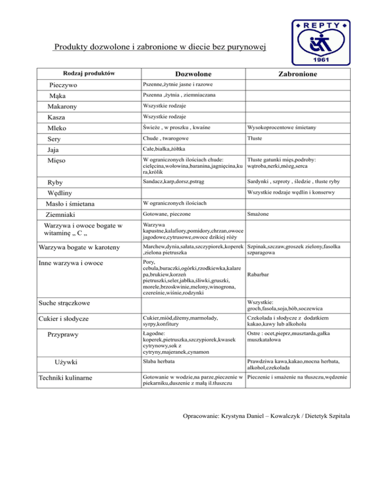 Produkty dozwolone i zabronione w diecie bez purynowej Rodzaj produktów Dozwolone Pieczywo Pszenne,żytnie jasne i razowe Mąka Pszenna ,żytnia , ziemniaczana Zabronione Makarony Wszystkie rodzaje Kasza Wszystkie rodzaje Mleko Świeże , w proszku , kwaśne Wysokoprocentowe śmietany Sery Chude , twarogowe Tłuste Jaja Całe,białka,żółtka Mięso W ograniczonych ilościach chude: Tłuste gatunki mięs,podroby: cielęcina,wołowina,baranina,jagnięcina,ku wątroba,nerki,mózg,serca ra,królik Ryby Sandacz,karp,dorsz,pstrąg Wszystkie rodzaje wędlin i konserwy Wędliny Masło i śmietana W ograniczonych ilościach Ziemniaki Gotowane, pieczone Warzywa i owoce bogate w witaminę „ C „ Sardynki , szproty , śledzie , tłuste ryby Smażone Warzywa kapustne,kalafiory,pomidory,chrzan,owoce jagodowe,cytrusowe,owoce dzikiej róży Warzywa bogate w karoteny Marchew,dynia,sałata,szczypiorek,koperek Szpinak,szczaw,groszek zielony,fasolka ,zielona pietruszka szparagowa Inne warzywa i owoce Pory, cebula,buraczki,ogórki,rzodkiewka,kalare pa,brukiew,korzeń pietruszki,seler,jabłka,śliwki,gruszki, morele,brzoskwinie,melony,winogrona, czereśnie,wiśnie,rodzynki Suche strączkowe Cukier i słodycze Przyprawy Używki Techniki kulinarne Rabarbar Wszystkie: groch,fasola,soja,bób,soczewica Cukier,miód,dżemy,marmolady, syrpy,konfitury Czekolada i słodycze z dodatkiem kakao,kawy lub alkoholu Łagodne: koperek,pietruszka,szczypiorek,kwasek cytrynowy,sok z cytryny,majeranek,cynamon Ostre : ocet,pieprz,musztarda,gałka muszkatałowa Słaba herbata Prawdziwa kawa,kakao,mocna herbata, alkohol,czekolada Gotowanie w wodzie,na parze,pieczenie w Pieczenie i smażenie na tłuszczu,wędzenie piekarniku,duszenie z małą il.tłuszczu Opracowanie: Krystyna Daniel – Kowalczyk / Dietetyk Szpitala