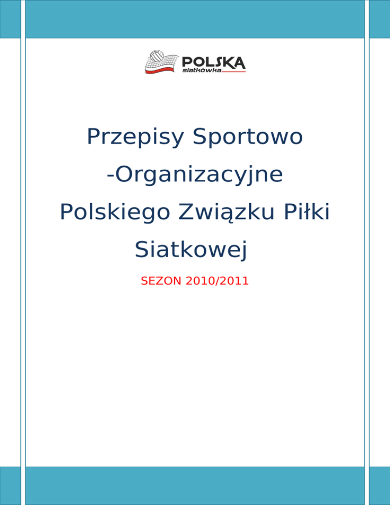 Przepisy Sportowo -Organizacyjne Polskiego Związku Piłki Siatkowej SEZON 2010/2011 Przepisy Sportowo-Organizacyjne Polskiego Związku Piłki Siatkowej SPIS TREŚCI: Dział I. Postanowienia ogólne 1. Rozgrywki centralne Polskiego Związku Piłki Siatkowej. Dział II. Przepisy Organizacyjne Polskiego Związku Piłki Siatkowej 1. Kluby i sekcje piłki siatkowej. 2. Udział Klubów w rozgrywkach. 3. Prawa i obowiązki Klubów. 4. Uprawnienie zawodnika do gry. 5. Prawa i obowiązki zawodnika. 6. Zgłoszenie trenera, masażysty, lekarza. Dział III. Regulamin Zmiany Barw Klubowych 1. Transfer definitywny zawodnika. 2. Okresowe reprezentowanie barw klubowych (wypożyczenie na podstawie certyfikatu). 3. Pozostałe postanowienia dotyczące zmian barw klubowych. Dział IV. Regulamin wydawania Certyfikatów FlVB dla zawodniczek i zawodników do gry w klubach zagranicznych. Dział V. Regulamin zmiany barw klubowych zawodników zagranicznych do klubów polskich. Dział VI. Przepisy Sportowe Polskiego Związku Piłki Siatkowej. 1. Zasady ogólne. 2. Sędziowie. Dział VII. Obowiązki Organizatora i Uczestnika Rozgrywek. 1. Organizator. 2. Obiekty sportowe, bezpieczeństwo zawodów. 3. Uczestnicy Dział VIII. Postanowienia końcowe. SEZON 2010/2011 Strona 2 Przepisy Sportowo-Organizacyjne Polskiego Związku Piłki Siatkowej Dział I. Postanowienia ogólne. 1.Rozgrywki centralne Polskiego Związku Piłki Siatkowej. §1 Zawody Polskiego Związku Piłki Siatkowej odbywają się na szczeblach: a. krajowym, b. wojewódzkim, c. klubowym, miasta, gminy, powiatu Na wszystkich szczeblach rozgrywek obowiązują przepisy sportowoorganizacyjne PZPS. Regulamin organizacyjny może przewidywać dla rozgrywek szczebla centralnego szczególne warunki sportowo-organizacyjne zgodne z wymogami FIVB opisane w dalszej części przepisów. §2 Rozgrywkami centralnymi są: A. MISTRZOSTWA POLSKI SENIOREK I SENIORÓW jako PlusLiga i PlusLiga Kobiet, LIGA I, II oraz rozgrywki wojewódzkie i pozostałe. a.1. Systemy, regulaminy i terminarze PlusLigi, PlusLigi Kobiet oraz I i II ligi są zatwierdzane odpowiednio przez PLPS S.A. oraz przez Zarząd Polskiego Związku Piłki Siatkowej. a.2 Systemy, regulaminy i terminarze lig wojewódzkich pozostałych zatwierdzane są przez Zarządy WZPS. oraz B. MISTRZOSTWA POLSKI JUNIOREK I JUNIORÓW / do lat 19/ prowadzone systemem: b.1 eliminacji w województwie wg regulaminów zatwierdzanych przez Zarządy WZPS, b.2 1/8 finału MP, ćwierćfinałów, półfinałów i finałów na szczeblu krajowym wg regulaminów zatwierdzanych przez Zarząd Polskiego Związku Piłki Siatkowej. C. MISTRZOSTWA POLSKI KADETEK I KADETÓW /do lat 17/ prowadzone systemem: c.1 eliminacji w województwie wg regulaminów zatwierdzanych przez Zarządy WZPS, c.2 1/8 finału MP, ćwierćfinałów, półfinałów i finałów na szczeblu krajowym wg regulaminów zatwierdzanych przez Zarząd Polskiego Związku Piłki Siatkowej. D. OGÓLNOPOLSKA OLIMPIADA MŁODZIEŻY rozgrywanej w ramach reprezentacji województw na podstawie regulaminów zatwierdzanych przez organizatora OOM. SEZON 2010/2011 Strona 3 Przepisy Sportowo-Organizacyjne Polskiego Związku Piłki Siatkowej E. MIĘDZYWOJEWÓDZKIE MISTRZOSTWA MŁODZICZEK I MŁODZIKÓW /do lat 15/ O PUCHAR PREZESA PZPS prowadzone systemem: e.1 eliminacji w województwie wg regulaminów zatwierdzanych przez Zarządy WZPS, e.2 1/8 finału MP, ćwierćfinałów, półfinałów i finałów na szczeblu krajowym wg regulaminów zatwierdzanych przez Zarząd Polskiego Związku Piłki Siatkowej. F. Zawody ogólnopolskie NADZIEJE OLIMPIJSKIE prowadzone systemem: f.1 wyłonienia reprezentacji województw na podstawie zawodów wojewódzkich, f.2 na szczeblu krajowym zawody reprezentacji województw. G. PUCHAR POLSKI KOBIET I MĘŻCZYZN rozgrywany w etapach: g.1 eliminacji wojewódzkich, g.2 rozgrywek na szczeblu centralnym, w której udział biorą: g.2.1 zdobywcy I miejsca na szczeblu województwa, g.2.2 zespoły, które w roku rozpoczęcia edycji PP awansowały do II ligi g.2.3 zespoły II ligi g.2.4 zespoły I ligi g.2.5 zespoły PlusLigi i PlusLigi Kobiet Udział w Pucharze Polski zespołów szczebla centralnego PlusLigi, PlusLigi Kobiet oraz I ligi jest obowiązkowy. Dla zespołów II ligi udział jest dobrowolny. Puchar Polski rozgrywany jest zgodnie z systemem rozgrywek na dany sezon zatwierdzanym przez Zarząd Polskiego Związku Piłki Siatkowej i ogłaszanym osobnym komunikatem. §3 Za początek sezonu 2010/2011 uważa się datę 01.09.2010r. a za koniec sezonu datę 30.06.2011r. Dział II. Przepisy Organizacyjne Polskiego Związku Piłki Siatkowej. 1. Kluby i sekcje klubowych). piłki siatkowej. (Regulamin licencji §4 Wszystkie Kluby chcące uczestniczyć w rozgrywkach organizowanych przez Polski Związek Piłki Siatkowej muszą być członkami Związku na zasadach określonych w Statucie PZPS. Statut PZPS, Przepisy Sportowo – Organizacyjne PZPS, a także wszystkie wydawane Komunikaty mają zastosowanie w stosunku do klubów i sekcji piłki siatkowej zrzeszonych w Wojewódzkich Związkach Piłki Siatkowej. §5 Uczestnictwo klubu sportowego w rozgrywkach PZPS wymaga posiadania przez ten klub licencji. Licencję przyznaje PZPS dla klubów ligi centralnej oraz WZPS z SEZON 2010/2011 Strona 4 Przepisy Sportowo-Organizacyjne Polskiego Związku Piłki Siatkowej upoważnienia PZPS dla klubów lig wojewódzkich oraz klubów biorących udział w rozgrywkach młodzieżowych. Licencja wydawana jest corocznie przed rozpoczęciem każdego sezonu. §6 Nieprzestrzeganie postanowień § 4 i § 5 jest podstawą do zastosowania kar określonych w Komunikacie Organizacyjnym PZPS i Przepisach Dyscyplinarnych PZPS. §7 PZPS może nie udzielić lub cofnąć upoważnienie dla WZPS-u do wydawania licencji dla klubów. W takim przypadku licencję wydaje bezpośrednio PZPS. §8 Wnioski o przyznanie licencji Kluby składają do Komisji do spraw Wydawania Licencji, powołanej przez Zarząd PZPS. §9 Termin 