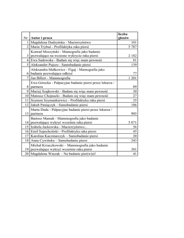 Nr Autor i praca 1 Magdalena Dudzyńska - Macierzyństwo 2 Maria Trybuś - Profilaktyka raka piersi Konrad Moszyński - Mamografia jako badanie 3 pozwalające na wczesne wykrycie raka piersi 4 Ewa Sadowska - Badam się więc mam pewność 5 Aleksander Pujszo - Samobadanie piersi Aleksandra Małkowicz - Figaj - Mamografia jako 6 badanie pozwalające odkryć 7 Jan Billert - Mammografia Ewa Górecka - Palpacyjne badanie piersi przez lekarza / 8 partnera 9 Maciej Szajkowski - Badam się więc mam pewność 10 Mateusz Chojnacki - Badam się więc mam pewność 11 Szymon Szymankiewicz - Profilaktyka raka piersi 12 Jakub Paniączyk - Samobadanie piersi Marta Duda - Palpacyjne badanie piersi przez lekarza / 13 partnera Bartosz Mamak - Mammografia jako badanie 14 pozwalające wykryć wcześnie raka piersi 15 Izabela Jackowska - Macierzyństwo... 16 Emil Szpechciński - Profilaktyka raka piersi 17 Karolina Kaczmarczyk – Samobadanie piersi 18 Anna Cywińska – Samobadanie piersi Michał Krzaczkowski – Mammografia jako badanie 19 pozwalające wykryć wcześnie raka piersi 20 Magdalena Waszak – Na badanie pier(w)si! liczba głosów 101 5 787 2 182 81 139 77 1 201 89 30 27 35 186 905 5 871 56 45 20 243 381 41
