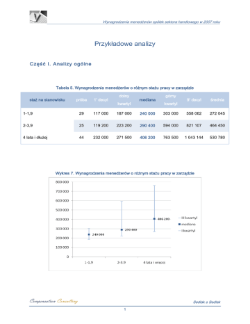 Wynagrodzenia menedżerów spółek sektora handlowego w 2007 roku Przykładowe analizy Część I. Analizy ogólne Tabela 5. Wynagrodzenia menedżerów o różnym stażu pracy w zarządzie staż na stanowisku dolny próba 1’ decyl 1-1,9 29 117 000 187 000 240 000 2-3,9 25 119 200 223 200 4 lata i dłużej 44 232 000 271 500 kwartyl mediana górny 9’ decyl średnia 303 000 558 062 272 045 290 400 594 000 821 107 464 450 406 200 763 500 1 043 144 530 780 kwartyl Wykres 7. Wynagrodzenia menedżerów o różnym stażu pracy w zarządzie Sedlak & Sedlak 1 Wynagrodzenia menedżerów spółek sektora handlowego w 2007 roku Część II. Rankingi i zestawienia Tabela 14. Średnie wynagrodzenie menedżerów w poszczególnych spółkach (fragment tabeli) średnie wynagrodzenie menedżera spółka (menedżerowie, którzy przepracowali pełny 2007) średnie wynagrodzenie menedżera (wszyscy menedżerowie) 7 Efekt SA 639 000 353 250 8 Eurocash SA 621 042 621 042 9 Prosper SA 612 000 368 008 Tabela 15. Fundusze wynagrodzeń zarządu w poszczególnych spółkach (fragment tabeli) spółka fundusz wynagrodzeń zarządu 2007 7 Alma Market SA 2 888 000 8 TIM SA 2 868 144 9 W.Kruk SA 2 647 000 Sedlak & Sedlak 2 Wynagrodzenia menedżerów spółek sektora handlowego w 2007 roku Tabela 19. Ranking wynagrodzeń menedżerów (fragment tabeli) imię i nazwisko funkcja pełny wynagrodzenie nazwa firmy 2007* 2007 AO** pełny wynagrodzenie 2006* 2006 34 Jacek Dauenhauer W. PGF SA tak 459 000 35 Mariusz Wojdon W. Alma Market SA tak 456 000 tak 480 000 36 Robert Kierzek W. Inter Cars SA tak 456 000 tak 384 000 37 Marek Piechocki P. LPP SA tak 450 000 tak 360 000 AO** A/O A/O * pełny 07 – czy menedżer przepracował pełny rok obrotowy ** A/O – akcje/opcje na akcje, które menedżer otrzymał oprócz wynagrodzenia gotówkowego Tabela 20. Zestawienie wynagrodzeń menedżerów w poszczególnych spółkach (fragment tabeli) nazwa spółki NG2 SA funkcja imię i nazwisko pełny wynagrodzenie 2007* 2007 AO** pełny wynagrodzenie 2006* 2006 P. Dariusz Miłek tak 264 928 tak 264 000 W. Lech Chudy tak 223 649 tak 225 000 W. Mariusz Gnych tak 223 446 tak 224 000 W. Teresa Zioła tak 223 200 tak 224 000 * pełny 07 – czy menedżer przepracował pełny rok obrotowy ** A/O – akcje/opcje na akcje, które menedżer otrzymał oprócz wynagrodzenia gotówkowego Sedlak & Sedlak 3 AO**