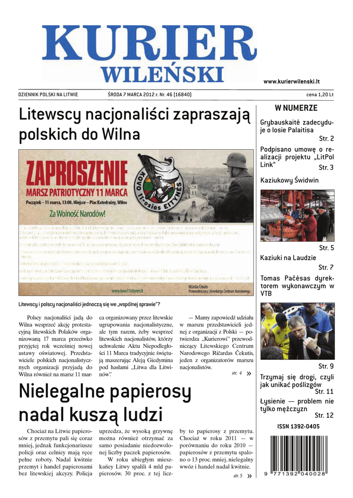 www.kurierwilenski.lt DZIENNIK POLSKI NA LITWIE ŚRODA 7 MARCA 2012 r. Nr. 46 (16840) cena 1,20 Lt Litewscy nacjonaliści zapraszają polskich do Wilna W NUMERZE Grybauskaitė zadecyduje o losie Palaitisa Str. 2 Podpisano umowę o realizacji projektu „LitPol Link” Str. 3 Kaziukowy Świdwin Str. 5 Kaziuki na Laudzie Str. 7 Tomas Pačėsas dyrektorem wykonawczym w VTB Litewscy i polscy nacjonaliści jednoczą się we „wspólnej sprawie”? Polscy nacjonaliści jadą do Wilna wesprzeć akcję protestacyjną litewskich Polaków organizowaną 17 marca przeciwko przyjętej rok wcześniej nowej ustawy oświatowej. Przedstawiciele polskich nacjonalistycznych organizacji przyjadą do Wilna również na marsz 11 mar- ca organizowany przez litewskie ugrupowania nacjonalistyczne, ale tym razem, żeby wesprzeć litewskich nacjonalistów, którzy uchwalenie Aktu Niepodległości 11 Marca tradycyjnie świętują maszerując Aleją Giedymina pod hasłami „Litwa dla Litwinów”. — Mamy zapowiedź udziału w marszu przedstawicieli jednej z organizacji z Polski — potwierdza „Kurierowi” przewodniczący Litewskiego Centrum Narodowego Ričardas Čekutis, jeden z organizatorów marszu nacjonalistów. str. 4 Nielegalne papierosy nadal kuszą ludzi Chociaż na Litwie papierosów z przemytu pali się coraz mniej, jednak funkcjonariusze policji oraz celnicy mają ręce pełne roboty. Nadal kwitnie przemyt i handel papierosami bez litewskiej akcyzy. Policja uprzedza, że wysoką grzywnę można również otrzymać za samo posiadanie niedozwolonej liczby paczek papierosów. W roku ubiegłym mieszkańcy Litwy spalili 4 mld papierosów. 30 proc. z tej licz- » by to papierosy z przemytu. Chociaż w roku 2011 — w porównaniu do roku 2010 — papierosów z przemytu spalono o 13 proc. mniej, nielegalny wwóz i handel nadal kwitnie. str. 5 » Str. 9 Trzymaj się drogi, czyli jak unikać poślizgów Str. 11 Łysienie — problem nie tylko mężczyzn Str. 12 ISSN 1392-0405 gOGŁOSZENIA KURIER WILEŃSKI NŚroda, 7 marca 2012 r. SPRZEDAŻ ´¼ĄYFbÍç8¼b8Á 8YĄÍÊ ÈFOÊO| Pomniki nagrobne, ogrodzenia. Produkujemy, stawiamy. Bardzo przychylne ceny, nowe modele. Aušros g. 14, Rudamina. Tel. 8 678 33833 Europejska Fundacja Praw Człowieka pragnie poinformować, że dzięki życzliwości Firmy LanguageCourse możemy zaoferować dla Państwa bezpłatną naukę języków obcych w Internecie! Nauka odbywa się za pomocą programu „Super Learning Vocabulary Trainer”, który oferuje darmową naukę słownictwa ponad 9 języków obcych takich jak angielski, niemiecki, francuski, hiszpański, włoski czy rosyjski. Aby korzystać z programu, wystarczy mieć kody dostępu, które są w posiadaniu EFPCz. Liczba kodów jest ograniczona, dlatego oferta jest ważna do ich wyczerpania, ale nie później niż 10 marca 2012 roku. ´FÊÍ8¼b±b´È8b¼±ÍÊ8bY´¼ĄÁY Á±´ÁÍ8±8´Í8Ê88´ÍýÈý´¼±ĄU|¼¼U¹¹8Á 8¡bn|±¡bÁ¹¡ USŁUGI Ewidencja buchalteryjna od dokumentów wstępnych do sprawozdawczości finansowej, doradztwo. Tel. +370 640 26602 Fotoceramika. Kolorowe i czarno-białe zdjęcia do pomników. Vilnius, Asanavičiūtės 20/2, tel. 8 650 89050 Bądź pierwszy i odbierz swój dostęp do bezpłatnej nauki! Europejska Fundacja Praw Człowieka Hotel zatrudni kucharkę oraz pokojówkę. Przewóz ładunków i towarów: rolniczych (ziarno), budowlanych, węgla kamiennego i in. ,b¡g¸ps·gV À¸p¸g¸ ,8YÈÊ8ĄO8b´ÍOÍbbÈÈb3bOb pod biuro, sklep, magazyn lub na inną działalność oraz 2 pokoje mieszkalne. ,b¡g¸gpÎsÎgÎ Informuojame, kad nuo 2012-03-15 iki 2012-0415 d. vyks žemės sklypo kad. Nr. 4142/0400:0493, esančio Karklėnų k., Šatrininkų sen., Vilniaus r. kaimo plėtros (ūkio vidinės) žemėtvarkos projekto ūkininko sodybos formavimui derinimas. Kviečiame gretimo žemės sklypo, kad. Nr.4142/0400:0501, savininką Stanislav Andruškevič į šio projekto derinimą. Kontaktinė inf.: UAB „Krianta“, Žalgirio g.131, Vilnius, tel.862093711, [email protected]. (Zam. 1612)