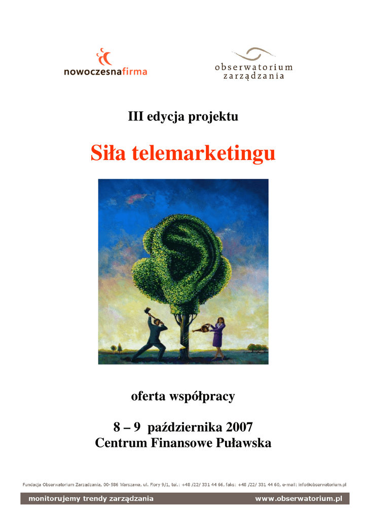 III edycja projektu Siła telemarketingu oferta współpracy 8 – 9 października 2007 Centrum Finansowe Puławska Oferta Siła Telemarketingu 2007 - strona 2 Fundacja Obserwatorium Zarządzania we współpracy z Portalem wiedzy dla biznesu - Nowoczesna Firma oraz firmą badawczą TNS OBOP przystępuje do realizacji III edycji projektu Siła Telemarketingu poświęconego rozwojowi telefonicznego kontaktu z klientem. III edycja „Siły telemarketingu” odpowiada na bieżące ale strategiczne wyzwania związane ze zmianami na rynku pracy oraz możliwościami profesjonalizacji branży przy pomocy środków UE. Oczywiście stale aktualne są pytania dotyczące odbioru społecznego działań telemarketingowych, metod zwiększania ich efektywności, profesjonalizmu oraz nowoczesnych metod zarządzania. Projekt skierowany jest do osób profesjonalnie zajmujących się wykorzystaniem telefonu w komunikacji i sprzedaży. Adresatami projektu są przedstawiciele przedsiębiorstw (menedżerowie działów sprzedaży, obsługi klienta) jak również pracownicy firm outsorcingowych tj. contact i call center. Projekt składa się z dwóch działań: • Badania i Raportu – przeprowadzona zostanie kolejna edycja corocznych reprezentatywnych badań społeczeństwa oraz panelowego badania biznesu w zakresie zmian i potrzeb rynku telemarketingowego. Raport to narzędzie do prognozowania, planowania, rekomendacji rynkowych i podejmowania decyzji przez decydentów. • Konferencji – branżowego spotkania profesjonalistów zajmujących się tematyką komunikacji marketingowej z wykorzystaniem kontaktu telefonicznego. Konferencja to miejsce pokazania najlepszych praktyk prezentowanych przez ekspertów projektu i zaproszonych gości, prezentacja aktualnych wyników badań oraz 2 dodatkowe całodniowe warsztaty. Mamy nadzieję, że Siła Telemarketingu tak jak w poprzednich latach zaangażuje wiele osób ze środowiska, stanie się punktem wyjścia do dyskusji praktyków i ekspertów z branży oraz rekomendacji konkretnych działań i rozwiązań aktualnych problemów. Premiera Projektu: 8 – 9 października 2007 - Centrum Finansowe Puławska Grupa docelowa: • Decydenci średniego i wyższego szczebla działów Marketingu, Obsługi Klienta, Badań i Rozwoju oraz Sprzedaży w przedsiębiorstwach mieszczących się na terenie całej Polski. • Kadra zarządzająca szeroko rozumianych firm telemarketingowych, • Reprezentanci dostawców usług i rozwiązań dedykowanych dla branży. Badanie - jest coroczne, ogólnopolskie, obejmie reprezentantów przedsiębiorstw i społeczeństwa. W tym celu Obserwatorium Zarządzania podjęło współpracę z firma badawczą TNS OBOP: Zebranie danych do reprezentatywnego badania nastąpi w sierpniu 2007. Badanie będzie przeprowadzane przy współpracy z TNS OBOP. Badanie ma na celu pozyskanie informacji oraz aktualnych danych m.in. w zakresie: • Jakie cele firmy oraz menedżerowie stawiają przy wykorzystaniu telemarketingu? • Jaka jest stopa zwrotu z wydatków na działania telemarketingowe? • Jak często i w jakim zakresie wykorzystywany jest telemarketing? • Jakie czynniki mają największy wpływ na odbiór społeczny działań telemarketingowych? • Kiedy kampania telemarketingowa jest efektywna? • Co decyduje o efektywności działań telemarketingowych? Badanie będzie realizowane wśród dwóch grup docelowych: • reprezentatywnej grupy osób w wieku od 15 lat (Sondaż ‘omnibus’) Badanie prowadzone wśród ogółu osób w wieku 15 i więcej lat będzie prowadzone na reprezentatywnej próbie losowo-kwotowej. Badanie będzie stanowiło część sondażu ‘omnibus’. Dzięki niemu będziemy w stanie oszacować stan rozwoju, zasięg, opinie społeczeństwa, wartość sprzedaży telemarketingu w Polsce i porównać z danymi z lat ubiegłych. Oferta Siła Telemarketingu 2007 - strona 3 • ogółu firm w formie panelu badanego metoda „user centric”. Celem tej części badania będzie określenie roli i wagi sprzedaży i obsługi klienta w firmach, nakładów obecnych i przyszłych, obecnych problemów i postrzegania najbliższej przyszłości. Raport z badania Po zakończeniu zbierania danych Obserwatorium Zarządzania wraz z grupą ekspertów przygotuje raport końcowy z badania. Raport będzie dystrybuowany płatnie. Dla mediów i uczestników zostanie przygotowany bezpłatny wyciąg z najważniejszych wyników badania. Dystrybucja raportu odbędzie się wśród decydentów marketingu, obsługi klienta i sprzedaży w przedsiębiorstwach na terenie całej Polski. Konferencja Obserwatorium Zarządzania zorganizuje i przeprowadzi konferencję w dniu 8 – 9 października, na której zaproszeni goście zaprezentują „najlepsze praktyki” - działania obrazujące metody zarządzania zasobami ludzkimi, poszukiwania środków UE wspierających inwestycje w firmie, zwiększające skuteczność działań i stanowiące o sukcesie rynkowym organizacji. Ponadto Kapituła Projektu podsumuje przeprowadzone badania oraz przedstawi wnioski, opinie z nich wypływające i rekomendacje dotyczące przyszłości. Konferencja ma na celu inspirację w działań, integrację środowiska, poinformowanie o ważnych sprawach dla branży. Drugiego dnia zostaną przeprowadzone całodniowe warsztaty mające na celu przekazanie doświadczeń i faktyczne podniesienie kompetencji w zakresie rekrutacji i motywacji działów telemarketingowych jak i pokazanie profesjonalnego podejścia do budowania działów telemarketingowych w firmach. Ramowy plan konferencji, 8 – 9 października 2007, Warszawa, Centrum Finansowe Puławska 8 października konferencja do 10:00 10:00 – 11:00 11:00 – 12:00 Rejestracja uczestników, poranna kawa Wystąpienie Keynote speakera Przedstawienie przedmiotu przeprowadzonych badań oraz wniosków z nich płynących. Prezentacja wybranych trendów – wynikających z analizy uzyskanych w badaniach danych + dyskusja i opinie ekspertów Przerwa na