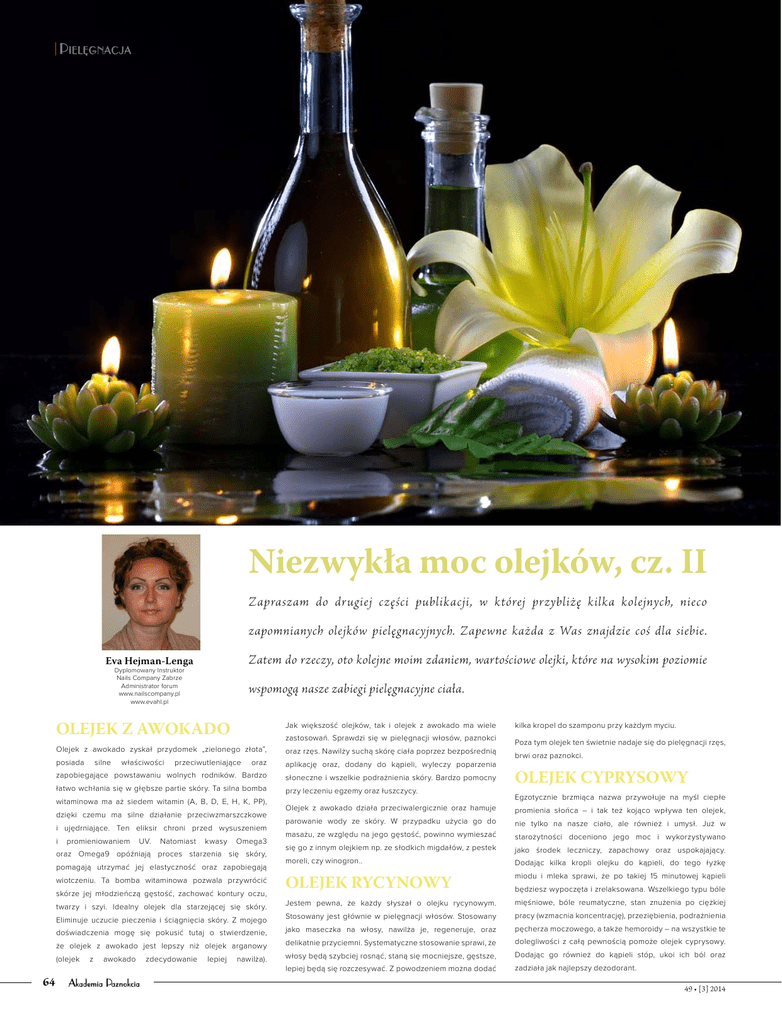 P ielęgnacja Niezwykła moc olejków, cz. II Zapraszam do drugiej części publikacji, w której przybliżę kilka kolejnych, nieco zapomnianych olejków pielęgnacyjnych. Zapewne każda z Was znajdzie coś dla siebie. Zatem do rzeczy, oto kolejne moim zdaniem, wartościowe olejki, które na wysokim poziomie Eva Hejman-Lenga Dyplomowany Instruktor Nails Company Zabrze Administrator forum www.nailscompany.pl www.evahl.pl wspomogą nasze zabiegi pielęgnacyjne ciała. OLEJEK Z AWOKADO Jak większość olejków, tak i olejek z awokado ma wiele zastosowań. Sprawdzi się w pielęgnacji włosów, paznokci Poza tym olejek ten świetnie nadaje się do pielęgnacji rzęs, Olejek z awokado zyskał przydomek „zielonego złota”, oraz rzęs. Nawilży suchą skórę ciała poprzez bezpośrednią posiada oraz aplikację oraz, dodany do kąpieli, wyleczy poparzenia zapobiegające powstawaniu wolnych rodników. Bardzo słoneczne i wszelkie podrażnienia skóry. Bardzo pomocny łatwo wchłania się w głębsze partie skóry. Ta silna bomba przy leczeniu egzemy oraz łuszczycy. OLEJEK CYPRYSOWY Olejek z awokado działa przeciwalergicznie oraz hamuje promienia słońca – i tak też kojąco wpływa ten olejek, parowanie wody ze skóry. W przypadku użycia go do nie tylko na nasze ciało, ale również i umysł. Już w masażu, ze względu na jego gęstość, powinno wymieszać starożytności doceniono jego moc i wykorzystywano się go z innym olejkiem np. ze słodkich migdałów, z pestek jako środek leczniczy, zapachowy oraz uspokajający. moreli, czy winogron.. Dodając kilka kropli olejku do kąpieli, do tego łyżkę OLEJEK RYCYNOWY miodu i mleka sprawi, że po takiej 15 minutowej kąpieli skórze jej młodzieńczą gęstość, zachować kontury oczu, twarzy i szyi. Idealny olejek dla starzejącej się skóry. Jestem pewna, że każdy słyszał o olejku rycynowym. mięśniowe, bóle reumatyczne, stan znużenia po ciężkiej Eliminuje uczucie pieczenia i ściągnięcia skóry. Z mojego Stosowany jest głównie w pielęgnacji włosów. Stosowany pracy (wzmacnia koncentrację), przeziębienia, podrażnienia doświadczenia mogę się pokusić tutaj o stwierdzenie, jako maseczka na włosy, nawilża je, regeneruje, oraz pęcherza moczowego, a także hemoroidy – na wszystkie te że olejek z awokado jest lepszy niż olejek arganowy delikatnie przyciemni. Systematyczne stosowanie sprawi, że dolegliwości z całą pewnością pomoże olejek cyprysowy. (olejek włosy będą szybciej rosnąć, staną się mocniejsze, gęstsze, Dodając go również do kąpieli stóp, ukoi ich ból oraz lepiej będą się rozczesywać. Z powodzeniem można dodać zadziała jak najlepszy dezodorant. silne właściwości przeciwutleniające witaminowa ma aż siedem witamin (A, B, D, E, H, K, PP), dzięki czemu ma silne działanie przeciwzmarszczkowe i ujędrniające. Ten eliksir chroni przed wysuszeniem i promieniowaniem UV. Natomiast kwasy Omega3 oraz Omega9 opóźniają proces starzenia się skóry, pomagają utrzymać jej elastyczność oraz zapobiegają wiotczeniu. Ta bomba witaminowa pozwala przywrócić 64 kilka kropel do szamponu przy każdym myciu. z awokado Akademia Paznokcia zdecydowanie lepiej nawilża). brwi oraz paznokci. Egzotycznie brzmiąca nazwa przywołuje na myśl ciepłe będziesz wypoczęta i zrelaksowana. Wszelkiego typu bóle 49 • [3] 2014 P ielęgnacja Poza tym olejek cyprysowy, świetnie nadaje się do aromaterapeutycznych – do wody wystarczy dodać 4 - 6 Podsumowując, olejki doskonale nawilżają zarówno skórę pielęgnacji przetłuszczającej się skóry – działa ściągająco, kropli olejku. Poza tym olejek ten jest silnym afrodyzjakiem. delikatną, wymagającą jak i całe ciało. Poza tym silnie ujędrniająco oraz antyseptycznie. Po takiej pielęgnacji Ważne: olejku tego nie powinny używać kobiety w ciąży. Nie regenerują, zawierają dużo bezcennych witamin, kwasów skóra nabierze aksamitnego blasku. Pomoże również powinno się go używać na ciało bez rozcieńczenia, a przed tłuszczowych i antyoksydantów. Wspomagają procesy przy cerze z rozszerzonymi porami oraz z problemami pierwszym użyciem wykonać próbę uczuleniową. leczenia. Swoją jakością niewiele różnią się od drogich trądzikowymi. Z powodzeniem można go wykorzystać w OLEJEK JAŚMINOWY kosmetyków z tzw. górnej półki. A przecież każdy z tych kuracji przeciwzmarszczkowej, oraz pomoże w zwalczaniu stanów zapalnych skóry, czy przy pielęgnacji pękających olejków, za niewielką cenę, możemy dostać w aptece czy Olejek jaśminowy pozyskiwany jest w wyniku ekstrakcji sklepie zielarskim. Poza tym można je wykorzystać w naczyń krwionośnych lub obrzękach. kwiatów jaśminu wonnego, który uprawiany jest w Indiach. aromaterapii czy w kominkach zapachowych. Olejek ten rewelacyjnie nadaje się także do masażu – Jako ciekawostkę podam, że z 1 tony kwiatów można jednak nie należy go stosować bez rozcieńczenia. Do wyprodukować zaledwie 1 kg olejku – zatem tu leży główna Zapamiętaj masażu najlepiej rozpuścić 3-6 kropli olejku w 10 ml oleju przyczyna wysokiej ceny specyfiku oraz fakt, że najczęściej • Kupując jakikolwiek olejek należy się upewnić, aby data podstawowego (z olejem migdałowym czy z olejem z oliwek sprzedaje się go w połączeniu z naturalnym olejkiem jojoba. ważności była odpowiednio długa (olejki są bardzo i nasion winogron). Olejek Jakby było mało, można go również z dużym powodzeniem wykorzystać w inhalacjach w przypadku kaszlu czy zapalenia oskrzeli. Olejek użyty w ten sposób, z uwagi na właściwości antyseptyczne, wspomaga leczenie antybiotykami. Pomaga również przy bólach menstruacyjnych, łagodzi objawy menopauzy oraz nadmiernego napięcia. Do takiej inhalacji wystarczy 1-2 krople olejku, natomiast parę należy wdychać jest jaśminowy stosowany w posiada właściwości kosmetologii oraz w lecznicze, przemyśle perfumeryjnym