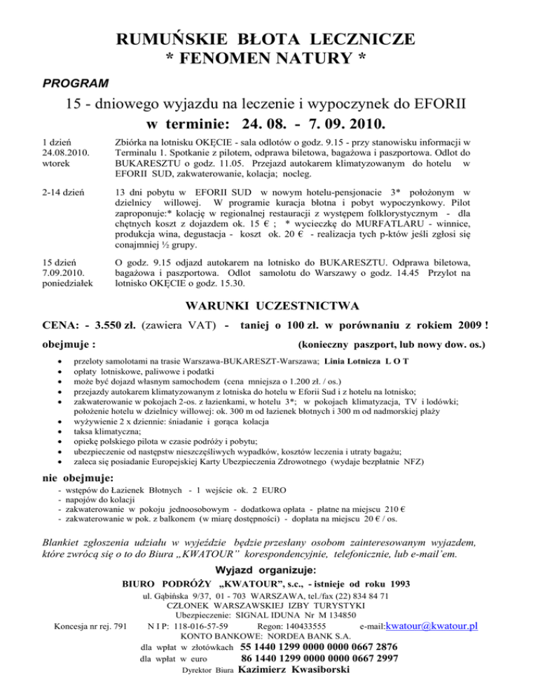 RUMUŃSKIE BŁOTA LECZNICZE * FENOMEN NATURY * PROGRAM 15 - dniowego wyjazdu na leczenie i wypoczynek do EFORII w terminie: 24. 08. - 7. 09. 2010. 1 dzień 24.08.2010. wtorek Zbiórka na lotnisku OKĘCIE - sala odlotów o godz. 9.15 - przy stanowisku informacji w Terminalu 1. Spotkanie z pilotem, odprawa biletowa, bagażowa i paszportowa. Odlot do BUKARESZTU o godz. 11.05. Przejazd autokarem klimatyzowanym do hotelu w EFORII SUD, zakwaterowanie, kolacja; nocleg. 2-14 dzień 13 dni pobytu w EFORII SUD w nowym hotelu-pensjonacie 3* położonym w dzielnicy willowej. W programie kuracja błotna i pobyt wypoczynkowy. Pilot zaproponuje:* kolację w regionalnej restauracji z występem folklorystycznym - dla chętnych koszt z dojazdem ok. 15 € ; * wycieczkę do MURFATLARU - winnice, produkcja wina, degustacja - koszt ok. 20 € - realizacja tych p-któw jeśli zgłosi się conajmniej ½ grupy. 15 dzień 7.09.2010. poniedziałek O godz. 9.15 odjazd autokarem na lotnisko do BUKARESZTU. Odprawa biletowa, bagażowa i paszportowa. Odlot samolotu do Warszawy o godz. 14.45 Przylot na lotnisko OKĘCIE o godz. 15.30. WARUNKI UCZESTNICTWA CENA: - 3.550 zł. (zawiera VAT) obejmuje : taniej o 100 zł. w porównaniu z rokiem 2009 ! (konieczny paszport, lub nowy dow. os.) przeloty samolotami na trasie Warszawa-BUKARESZT-Warszawa; Linia Lotnicza L O T opłaty lotniskowe, paliwowe i podatki może być dojazd własnym samochodem (cena mniejsza o 1.200 zł. / os.) przejazdy autokarem klimatyzowanym z lotniska do hotelu w Eforii Sud i z hotelu na lotnisko; zakwaterowanie w pokojach 2-os. z łazienkami, w hotelu 3*; w pokojach klimatyzacja, TV i lodówki; położenie hotelu w dzielnicy willowej: ok. 300 m od łazienek błotnych i 300 m od nadmorskiej plaży wyżywienie 2 x dziennie: śniadanie i gorąca kolacja taksa klimatyczna; opiekę polskiego pilota w czasie podróży i pobytu; ubezpieczenie od następstw nieszczęśliwych wypadków, kosztów leczenia i utraty bagażu; zaleca się posiadanie Europejskiej Karty Ubezpieczenia Zdrowotnego (wydaje bezpłatnie NFZ) nie obejmuje: - wstępów do Łazienek Błotnych - 1 wejście ok. 2 EURO napojów do kolacji zakwaterowanie w pokoju jednoosobowym - dodatkowa opłata - płatne na miejscu 210 € zakwaterowanie w pok. z balkonem (w miarę dostępności) - dopłata na miejscu 20 € / os. Blankiet zgłoszenia udziału w wyjeździe będzie przesłany osobom zainteresowanym wyjazdem, które zwrócą się o to do Biura „KWATOUR” korespondencyjnie, telefonicznie, lub e-mail’em. Wyjazd organizuje: BIURO PODRÓŻY „KWATOUR”, s.c., - istnieje od roku 1993 Koncesja nr rej. 791 ul. Gąbińska 9/37, 01 - 703 WARSZAWA, tel./fax (22) 834 84 71 CZŁONEK WARSZAWSKIEJ IZBY TURYSTYKI Ubezpieczenie: SIGNAL IDUNA Nr M 134850 N I P: 118-016-57-59 Regon: 140433555 e-mail:[email protected] KONTO BANKOWE: NORDEA BANK S.A. dla wpłat w złotówkach 55 1440 1299 0000 0000 0667 2876 dla wpłat w euro 86 1440 1299 0000 0000 0667 2997 Dyrektor Biura Kazimierz Kwasiborski RUMUŃSKIE BŁOTA LECZNICZE *FENOMEN NATURY* Wyjazd leczniczo - wypoczynkowy do EFORII SUD: samolot + autokar w terminie: 24. 08. - 7. 09. 2010. - 15 dni Z G Ł O S Z E N I E udziału w wyjeździe NAZWISKO . . . . . . . . . . . . . . . . . . . . . . . . . . . . . . . . . . . . . . . . . . . . . . . . . . . . . . . . . . . . . IMIĘ . . . . . . . . . . . . . . . . . . . . . . . . . . . . . . . . . .. . . . DATA UR . . . . . . . . . . . . . . . . . . ADRES . . . . . . . . . . . . . . . . . . . . . . . . . . . . . . . . . . . . . . . . . . . . ulica nr domu kod miasto TEL kom . . . . . . . . . . . . . . . . . Stacjonarny . . . . . . . . . . . . . . . . . e-mail: . . . . . . . . . . . . . . . . . . . . . N PASZPORTU lub DOWODU OS. . . . . . . . . . . . . . . . . . . . . . . . . . . . . . . . . . . . . . . . . . . . ZAWÓD, TYTUŁ . . . . . . . . . . . . . . . . . . . . . . . . . . . . . . . . . . . . . . . . . . . . . . . . . . . . . . . . . . . . DATA ZGŁOSZENIA i WPŁATY ZALICZKI/CAŁOŚCI . . . . . . . . . . . . . . . / . . . . . . . . . . . . Całość należy wpłacić na konto bankowe Biura „KWATOUR” w terminie do dnia 20. 07. 2010. Proszę o zakwaterowanie w pokoju dwuosobowym - jednoosobowym (niepotrzebne skreślić) W pokoju dwuosobowym proszę o zakwaterowanie z . . . . . . . . . . . . . . . . . . . . . . . . . W przypadku zgłoszenia jednej osoby i nieznalezienia współlokatora/współlokatorki dopłatę związaną z zakwaterowaniem w pok. jednoosobowym wniosę na miejscu po przyjeździe do hotelu. Osoby w wieku powyżej 60 lat powinny mieć zaświadczenie lekarskie o braku przeciwwskazań do takiego wyjazdu. Warunki rezygnacji: do dn. 20.07. potrącenie - 500 zł., do dn. 1.08. - 1.500 zł., po dn. 10.08.2010. - 2.500 zł. Można zawrzeć ubezpieczenie od kosztów rezygnacji. Rezygnację należy złożyć pisemnie. Biuro „KWATOUR” nie odpowiada za ewentualne szkody powstałe w wyniku zdarzeń zaliczanych jako siły wyższe. Znany jest mi program, warunki uczestnictwa i rezygnacji. DATA i PODPIS: Aby zostać uczestnikiem wyjazdu należy wypełniony blankiet zgłoszenia wysłać na adres Biura Podróży „KWATOUR” (pocztą, faksem lub e-mail’em), a w Banku dokonać wpłaty zaliczki: 1.300 zł (lub całości). Spowoduje to wpisanie na listę uczestników. Ilość miejsc ograniczona - decyduje kolejność zgłoszeń i wpłaty zaliczki. Wyjazd organizuje: BIURO PODRÓŻY „KWATOUR”, s.c., - istnieje od roku 1993 Koncesja nr rej. 791 ul. Gąbińska 9/37, 01 - 703 WARSZAWA, tel./fax (22) 834 84 71 CZŁONEK WARSZAWSKIEJ IZBY TURYSTYKI Ubezpieczenie: SIGNAL IDUNA Nr M 134850 N I P: 118-016-57-59 Regon: 140433555 e-mail:[email protected] KONTO BANKOWE: NORDEA BANK S.A. dla wpłat w złotówkach 55 1440 1299 0000 0000 0667 2876 dla wpłat w euro 86 1440 1299 0000 0000 0667 2997 Dyrektor Biura Kazimierz Kwasiborski