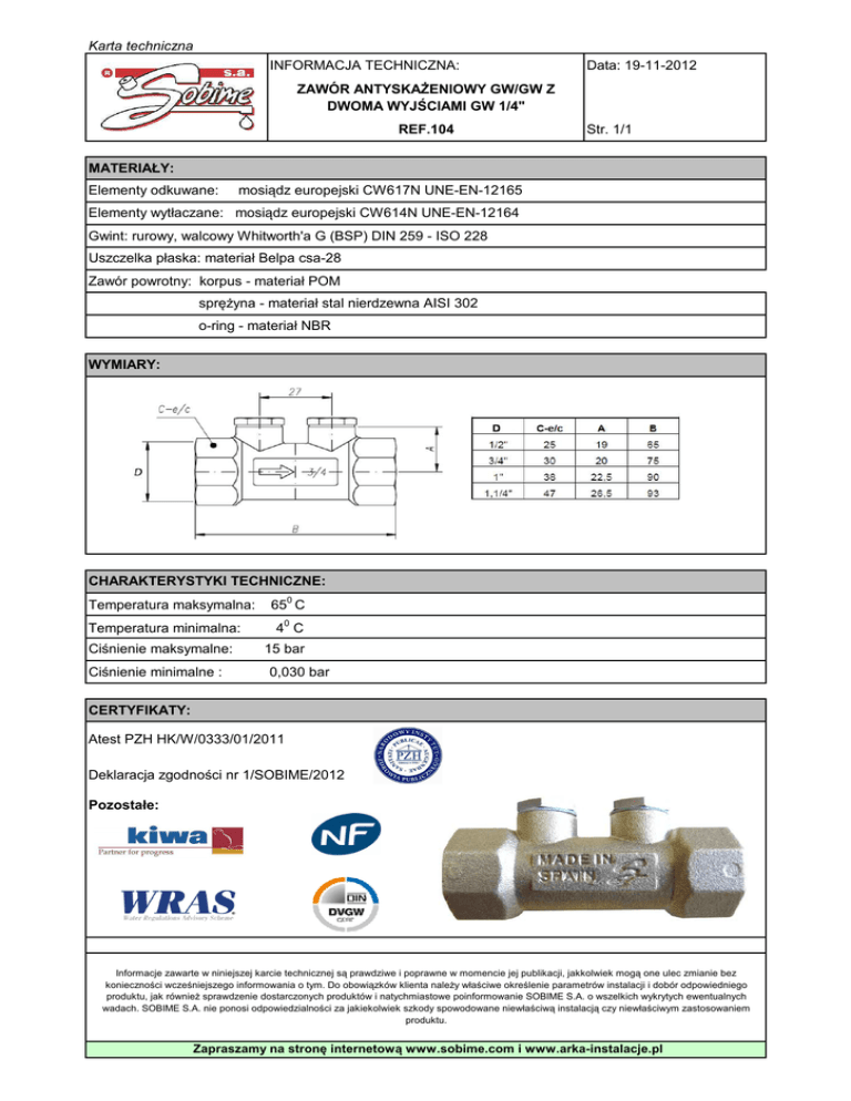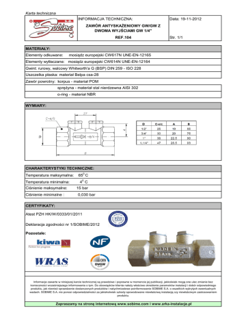 Karta techniczna INFORMACJA TECHNICZNA: Data: 19-11-2012 ZAWÓR ANTYSKAŻENIOWY GW/GW Z DWOMA WYJŚCIAMI GW 1/4" REF.104 Str. 1/1 MATERIAŁY: Elementy odkuwane: mosiądz europejski CW617N UNE-EN-12165 Elementy wytłaczane: mosiądz europejski CW614N UNE-EN-12164 Gwint: rurowy, walcowy Whitworth'a G (BSP) DIN 259 - ISO 228 Uszczelka płaska: materiał Belpa csa-28 Zawór powrotny: korpus - materiał POM sprężyna - materiał stal nierdzewna AISI 302 o-ring - materiał NBR WYMIARY: CHARAKTERYSTYKI TECHNICZNE: Temperatura maksymalna: Temperatura minimalna: Ciśnienie maksymalne: Ciśnienie minimalne : 0 65 C 40 C 15 bar 0,030 bar CERTYFIKATY: Atest PZH HK/W/0333/01/2011 Deklaracja zgodności nr 1/SOBIME/2012 Pozostałe: Informacje zawarte w niniejszej karcie technicznej są prawdziwe i poprawne w momencie jej publikacji, jakkolwiek mogą one ulec zmianie bez konieczności wcześniejszego informowania o tym. Do obowiązków klienta należy właściwe określenie parametrów instalacji i dobór odpowiedniego produktu, jak również sprawdzenie dostarczonych produktów i natychmiastowe poinformowanie SOBIME S.A. o wszelkich wykrytych ewentualnych wadach. SOBIME S.A. nie ponosi odpowiedzialności za jakiekolwiek szkody spowodowane niewłaściwą instalacją czy niewłaściwym zastosowaniem produktu. Zapraszamy na stronę internetową www.sobime.com i www.arka-instalacje.pl