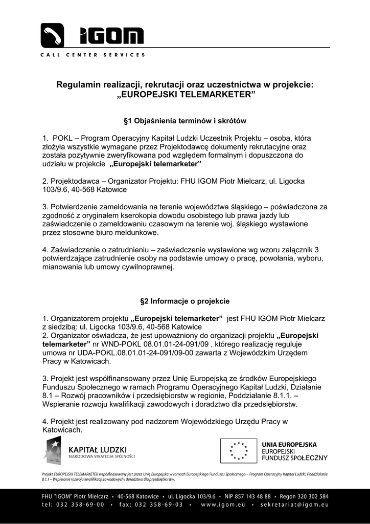 Regulamin realizacji, rekrutacji oraz uczestnictwa w projekcie: „EUROPEJSKI TELEMARKETER” §1 Objaśnienia terminów i skrótów 1. POKL – Program Operacyjny Kapitał Ludzki Uczestnik Projektu – osoba, która złożyła wszystkie wymagane przez Projektodawcę dokumenty rekrutacyjne oraz została pozytywnie zweryfikowana pod względem formalnym i dopuszczona do udziału w projekcie „Europejski telemarketer” 2. Projektodawca – Organizator Projektu: FHU IGOM Piotr Mielcarz, ul. Ligocka 103/9.6, 40-568 Katowice 3. Potwierdzenie zameldowania na terenie województwa śląskiego – poświadczona za zgodność z oryginałem kserokopia dowodu osobistego lub prawa jazdy lub zaświadczenie o zameldowaniu czasowym na terenie woj. śląskiego wystawione przez stosowne biuro meldunkowe. 4. Zaświadczenie o zatrudnieniu – zaświadczenie wystawione wg wzoru załącznik 3 potwierdzające zatrudnienie osoby na podstawie umowy o pracę, powołania, wyboru, mianowania lub umowy cywilnoprawnej. §2 Informacje o projekcie 1. Organizatorem projektu „Europejski telemarketer” jest FHU IGOM Piotr Mielcarz z siedzibą: ul. Ligocka 103/9.6, 40-568 Katowice 2. Organizator oświadcza, że jest upoważniony do organizacji projektu „Europejski telemarketer” nr WND-POKL 08.01.01-24-091/09 , którego realizację reguluje umowa nr UDA-POKL.08.01.01-24-091/09-00 zawarta z Wojewódzkim Urzędem Pracy w Katowicach. 3. Projekt jest współfinansowany przez Unię Europejską ze środków Europejskiego Funduszu Społecznego w ramach Programu Operacyjnego Kapitał Ludzki, Działanie 8.1 – Rozwój pracowników i przedsiębiorstw w regionie, Poddziałanie 8.1.1. – Wspieranie rozwoju kwalifikacji zawodowych i doradztwo dla przedsiębiorstw. 4. Projekt jest realizowany pod nadzorem Wojewódzkiego Urzędu Pracy w Katowicach. 5. Szczegółowe informacje o projekcie dostępne są w Biurze Projektu, w FHU IGOM Piotr Mielcarz, ul. Ligocka 103, 40-568 Katowice w godz. 9.00 do 15.00 od poniedziałku do piątku, na stronie internetowej www.igom.eu, e-mail: [email protected] oraz telefonicznie pod numerem tel.: 793 800 217 6. Pracownicy zatrudnieni w jednym miejscu pracy (u jednego pracodawcy) stanowią nie więcej niż 20% uczestników szkolenia realizowanego w ramach projektu, czyli nie więcej niż 40 osób. 7. Rekrutacja do projektu jest otwarta i prowadzona jest w okresie od 1.02.2010r. do zamknięcia listy lub do 15.03.2010r. Formularze zgłoszeniowe będą zbierane także po zamknięciu grup szkoleniowych, co umożliwi stworzenie listy rezerwowej. 8. Do chwili osiągniecie zakładanego w projekcie wskaźnika, priorytetowo objęte są osoby +45. §3 Przedmiot projektu 1. Celem nadrzędnym projektu jest podniesienie konkurencyjności pracowników na rynku pracy oraz zwiększenie jakości pracy osób zatrudnionych w telemarketingu jak również poszukujących takiego zatrudnienia zwłaszcza przez podniesienie ich umiejętności językowych i psychospołecznych. 2. Projekt wychodzi naprzeciw potrzebom związanym z koniecznością dostarczenia uczestnikom wiedzy teoretycznej i praktycznej z zakresu telemarketingu oraz znajomości języków obcych (zwłaszcza angielskiego i niemieckiego). Znajomość języków obcych jest kompetencją kluczową, często warunkującą zatrudnienie, zwłaszcza w kontekście otwarcia rynku na kraje europejskie. Zdobyte umiejętności językowe pozwolą na prowadzenie działalności telemarketingowej również na rzecz firm działających poza granicami kraju. Głównym założeniem przedsięwzięcia jest podniesienie konkurencyjności na rynku pracy grupy 200 pracujących osób dorosłych zamieszkałych w województwie śląskim zatrudnionych w telemarketingu oraz osób zainteresowanych znalezieniem takiego zatrudnienia. Uczestnicy projektu nabędą lub poszerzą swoje umiejętności w zakresie specjalistycznego języka angielskiego w swojej branży oraz nabędą i dostosują umiejętności do wymogów stawianych pracownikom telemarketingowym. Kompetencje te zostaną potwierdzone egzaminami zewnętrznymi: TOEIC (Test of English for International Communication, najczęściej przeprowadzany na świecie egzamin językowy) lub WiDaF (Deutsch als Fremdsprache in der Wirtschaft) oraz certyfikatami potwierdzającymi umiejętności zawodowe. Dodatkowe zajęcia dla osób powyżej 45 roku życia prowadzone będą z wykorzystaniem modelu intermentoringu. 3. Specjalistyczne szkolenia językowe Celem działania jest przekazanie uczestnikom projektu praktycznych umiejętności posługiwania się językiem angielskim lub niemieckim ukierunkowanym na słownictwo związane z pracą w telemarketingu. Uzupełnieniem modułu podstawowego jest możliwość skorzystania z konsultacji z lektorami jak również internetowe lekcje („e-learning”). Zakończeniem modułu językowego jest egzamin TOEIC lub WiDaF dla wszystkich uczestników. 4. Szkolenia z zakresu telemarketingu W ramach tego bloku szkoleniowego realizowane będą następujące moduły szkoleniowe: Moduł 1 - Szkolenie z zakresu specjalistycznych aplikacji używanych w telemarketingu (10 godzin) Moduł 2 – Psychologiczne podstawy telemarketingu (4 godziny) Moduł 3 – Prowadzenie rozmowy handlowej (8 godzin) Moduł 4 – Komunikacja interpersonalna-rozmowa telefoniczna (8 godzin) Moduł 5 – Skuteczne negocjacje handlowe (8 godzin) Moduł 6 – Skuteczne negocjacje handlowe z uwzględnieniem innych kultur (8 godzin) Moduł 7 - Warsztaty z telemarketingu (10 godzin) Zajęcia prowadzone będą z wykorzystaniem najnowszych technik informacyjnych, programów użytkowych i będą miały za zadanie zapoznanie uczestników z technikami nowoczesnego telemarketingu i pozwolą sprawnie funkcjonować w zawodzie telemarketera. 5. UDZIAŁ W PROJEKCIE JEST DLA UCZESNIKA PROJEKTU BEZPŁATNY. 6. W ramach projektu Organizator zapewni: - każdy uczestnik projektu weźmie udział w specjalistycznym szkoleniu językowym, - każdemu z uczestników zostaną 