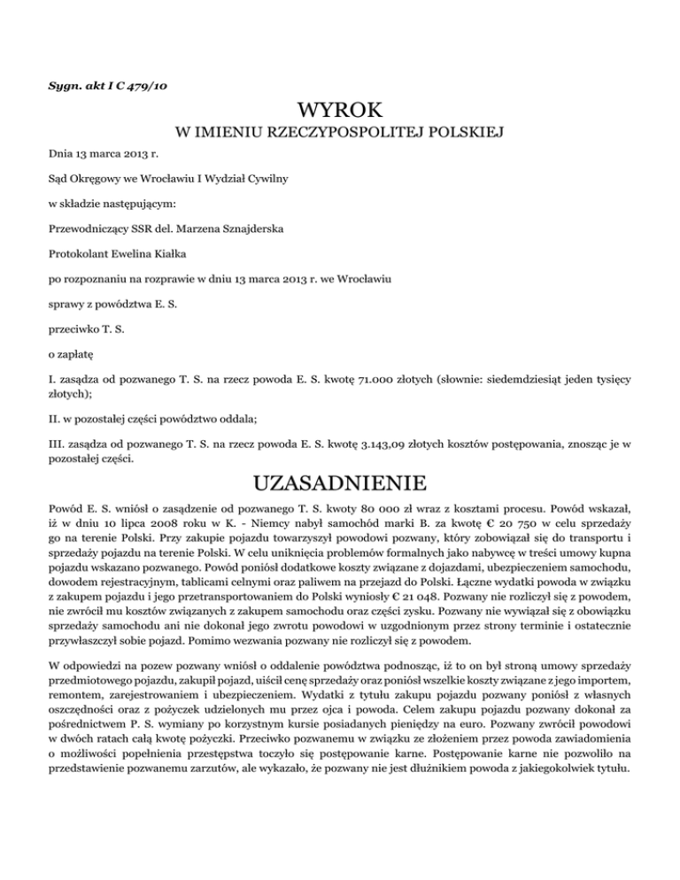 Sygn. akt I C 479/10 WYROK W IMIENIU RZECZYPOSPOLITEJ POLSKIEJ Dnia 13 marca 2013 r. Sąd Okręgowy we Wrocławiu I Wydział Cywilny w składzie następującym: Przewodniczący SSR del. Marzena Sznajderska Protokolant Ewelina Kiałka po rozpoznaniu na rozprawie w dniu 13 marca 2013 r. we Wrocławiu sprawy z powództwa E. S. przeciwko T. S. o zapłatę I. zasądza od pozwanego T. S. na rzecz powoda E. S. kwotę 71.000 złotych (słownie: siedemdziesiąt jeden tysięcy złotych); II. w pozostałej części powództwo oddala; III. zasądza od pozwanego T. S. na rzecz powoda E. S. kwotę 3.143,09 złotych kosztów postępowania, znosząc je w pozostałej części. UZASADNIENIE Powód E. S. wniósł o zasądzenie od pozwanego T. S. kwoty 80 000 zł wraz z kosztami procesu. Powód wskazał, iż w dniu 10 lipca 2008 roku w K. - Niemcy nabył samochód marki B. za kwotę € 20 750 w celu sprzedaży go na terenie Polski. Przy zakupie pojazdu towarzyszył powodowi pozwany, który zobowiązał się do transportu i sprzedaży pojazdu na terenie Polski. W celu uniknięcia problemów formalnych jako nabywcę w treści umowy kupna pojazdu wskazano pozwanego. Powód poniósł dodatkowe koszty związane z dojazdami, ubezpieczeniem samochodu, dowodem rejestracyjnym, tablicami celnymi oraz paliwem na przejazd do Polski. Łączne wydatki powoda w związku z zakupem pojazdu i jego przetransportowaniem do Polski wyniosły € 21 048. Pozwany nie rozliczył się z powodem, nie zwrócił mu kosztów związanych z zakupem samochodu oraz części zysku. Pozwany nie wywiązał się z obowiązku sprzedaży samochodu ani nie dokonał jego zwrotu powodowi w uzgodnionym przez strony terminie i ostatecznie przywłaszczył sobie pojazd. Pomimo wezwania pozwany nie rozliczył się z powodem. W odpowiedzi na pozew pozwany wniósł o oddalenie powództwa podnosząc, iż to on był stroną umowy sprzedaży przedmiotowego pojazdu, zakupił pojazd, uiścił cenę sprzedaży oraz poniósł wszelkie koszty związane z jego importem, remontem, zarejestrowaniem i ubezpieczeniem. Wydatki z tytułu zakupu pojazdu pozwany poniósł z własnych oszczędności oraz z pożyczek udzielonych mu przez ojca i powoda. Celem zakupu pojazdu pozwany dokonał za pośrednictwem P. S. wymiany po korzystnym kursie posiadanych pieniędzy na euro. Pozwany zwrócił powodowi w dwóch ratach całą kwotę pożyczki. Przeciwko pozwanemu w związku ze złożeniem przez powoda zawiadomienia o możliwości popełnienia przestępstwa toczyło się postępowanie karne. Postępowanie karne nie pozwoliło na przedstawienie pozwanemu zarzutów, ale wykazało, że pozwany nie jest dłużnikiem powoda z jakiegokolwiek tytułu. Sąd ustalił następujący stan faktyczny: Powód E. S. postanowił wraz z pozwanym T. S. będącym jego bratem, zająć się w celach zarobkowych zakupem luksusowych samochodów osobowych na terytorium Niemiec i ich odsprzedażą na terenie Polski. dowód: zeznania świadka M. Z., k. 72 – 75, zeznania świadka B. S., k. 162 – 164, przesłuchanie powoda, k. 234 – 237 Pierwszym zakupionym pojazdem w ramach wspólnego przedsięwzięcia stron był nabyty za kwotę € 20 750 w dniu 10 lipca 2008 roku w K. samochód osobowy marki B. (...). Cena uiszczona w całości została przez powoda z otrzymanej odprawy z tytułu rozwiązania umowy o pracę w przedsiębiorstwie (...) w wysokości € 130 000. Pojazd miał zostać przetransportowany do Polski i sprzedany przez pozwanego. W celu uproszczenia procedur związanych z rejestracją i odsprzedażą samochodu, w umowie sprzedaży jako nabywca wskazany został pozwany. dowód: umowa z 10.07.2008 r., k. 4, zeznania świadka M. Z., k. 72 – 75, zeznania świadka R. S., k. 75 – 78, 202 – 204, zeznania świadka R. K., k. 222 – 224, przesłuchanie powoda, k. 234 – 237 W okresie zakupu przedmiotowego pojazdu pozwany nie dysponował środkami finansowymi umożliwiającymi zapłatę jego ceny. dowód: zeznania świadka M. Z., k. 72 – 75, zeznania świadka R. S., k. 75 – 78, 202 – 204 Pozwany zwrócił powodowi jedynie koszty zakupu biletu lotniczego związanego z podróżą do Niemiec oraz kwotę 9 000 zł z tytułu zakupu przedmiotowego pojazdu. Kwota 7 000 zł uiszczona została na rachunek bankowy powoda, a kwota 2 000 zł przekazana bezpośrednio powodowi w gotówce. dowód: zeznania świadka B. S., k. 162 – 164, notatka urzędowa z 14.05.2009 r., akta Ds. (...), k. 1, protokół przyjęcia ustnego zawiadomienia o przestępstwie i przesłuchania w charakterze świadka osoby zawiadamiającej, akta Ds. (...), k. 2 – 6, rozliczenia kosztów, akta Ds. (...), k. 9, 22, zeznania świadka B. S., k. 162 – 164, protokół przesłuchania powoda, akta Ds. (...), k. 37 – 39 Powód złożył dnia 14 maja 2009 roku zawiadomienie o podejrzeniu popełnienia przestępstwa oszustwa przez pozwanego. Postanowieniem z dnia 31 marca 2010 roku, zatwierdzonym przez Prokuratora Prokuratury Rejonowej w T., Komenda Powiatowa Policji w T. umorzyła dochodzenie prowadzone pod sygnaturą akt Ds. (...). Postanowienie z dnia 31 marca 2010 roku utrzymane zostało w mocy postanowieniem Sądu Rejonowego w T. z dnia 29 czerwca 2010 roku wydanym w sprawie toczącej się pod sygnaturą akt II Kp (...) dowód: zeznania świadka M. Z., k. 72 – 75, notatka urzędowa z 14.05.2009 r., akta Ds. (...), k. 1, protokół przyjęcia ustnego zawiadomienia o przestępstwie i przesłuchania w charakterze świadka osoby zawiadamiającej, akta Ds. (...), k. 2 – 6, postanowienie z 31.03.2010 r., akta Ds. (...), k. 100, postanowienie z 29.06.2010 r., akta Ds. (...), k. 109 Sąd zważył, co następuje: Powództwo w znacznej części zasługiwało na uwzględnienie. Bezspornym w niniejszej sprawie pozostawał fakt istnienia porozumienia pomiędzy braćmi będącymi stronami niniejszego postępowania w przedmiocie wspólnego prowadzenia działalności zarobkowej polegającej na zakupie na terenie Niemiec luksusowych samocho