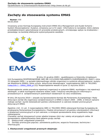 Zachęty do stosowania systemu EMAS Opublikowane na Zrównoważone Budownictwo (http://www.zb.itb.pl) Zachęty do stosowania systemu EMAS Numer: XVI 03.03.2010 Inicjowany przez Komisję Europejską instrument EMAS (Eco Management and Audot Scheme – System Ekozarządzania i Audytu), omawiany już w IV części Informatora to narzędzie, które ułatwia przedsiębiorstwom optymalizację ich procesów produkcyjnych, zmniejszając wpływ na środowisko i pozwalając na bardziej efektywne wykorzystywanie zasobów. W dniu 22 grudnia 2009 r. opublikowano w Dzienniku Urzędowym Unii Europejskiej ROZPORZĄDZENIE (WE) NR 1221/2009 PARLAMENTU EUROPEJSKIEGO I RADY z dnia 25 listopada 2009 r. w sprawie dobrowolnego udziału organizacji w systemie ekozarządzania i audytu we Wspólnocie (EMAS), które uchyla dotychczas obowiązujące rozporządzenie (WE) nr 761/2001 [załącznik 1 – EMAS_2009_pl [1]]. Rozporządzenie weszło w życie 11 stycznia 2010 r. Rozporządzenie ustala procedurę rejestracji organizacji w systemie EMAS, wynikające z tej rejestracji obowiązki, a także wymagania stawiane wobec osób i instytucji weryfikujących informacje o prowadzonych w zarejestrowanych podmiotach działaniach na rzecz środowiska. W dniu 29 stycznia 2010 r. ukazało się Sprawozdanie Komisji dla Parlamentu Europejskiego i Rady dotyczące zachęt dla organizacji zarejestrowanych w EMAS w latach 2004 – 2006, w którym opisano rodzaje zachęt i wyniki doświadczeń państw członkowskich w zakresie działań promocyjnych dotyczących EMAS. Zgodnie z Art. 11 ust. 3 rozporządzenia (WE) nr 761/2001 EMAS zobowiązał Komisję Europejską do przekazania Parlamentowi Europejskiemu i Radzie otrzymanych od państw członkowskich informacji o działaniach promocyjnych w tym zakresie, a niniejsze sprawozdanie służy wypełnieniu tego zobowiązania. Charakter zachęt stosowanych przez władze krajowe różni się i zależy od przyjętych celów. W sprawozdaniu zidentyfikowano dwie główne grupy zachęt: 1) Elastyczność uregulowań prawnych 2) Zachęty promocyjne poprzez: zamówienia publiczne, wsparcie finansowe, techniczne i informacyjne. 1. Elastyczność uregulowań prawnych obejmuje: Page 1 of 5 Zachęty do stosowania systemu EMAS Opublikowane na Zrównoważone Budownictwo (http://www.zb.itb.pl) ulgi regulacyjne, liberalizację, która obejmuje zmiany w samych przepisach. Elastyczność uregulowań prawnych ma na celu: uproszczenie i zredukowanie ilości przepisów, tam gdzie jest ich nadmiar, usunięcie przeszkód proceduralnych, ograniczenie potrzeby przedkładania organom regulacyjnym zbędnych i powtarzalnych dokumentów, zachęcanie do odpowiedzialnego postępowania podmiotów gospodarczych. W zakresie elastyczności uregulowań prawnych odnotowano niewielką poprawę sytuacji przede wszystkim w takich państwach jak Niemcy, Słowacja, Hiszpania i Wielka Brytania, przy jednoczesnym braku stosowania zachęt w postaci wsparcia informacyjnego w kilkunastu państwach członkowskich. Największą listę dokumentów legislacyjnych w dziedzinie ochrony środowiska opracowały przede wszystkim Niemcy oraz Austria, Belgia, Dania, Włochy, Portugalia, Holandia, Słowacja, Słowenia, Hiszpania i Wielka Brytania. Natomiast państwa takie jak Cypr, Czechy, Francja i Litwa rozpoczęły prace zmierzające do zapewnienia za pomocą uregulowań prawnych określonych korzyści organizacjom zarejestrowanym w EMAS. W większości przypadków ograniczono obowiązek sprawozdawczy lub udostępniono uproszczone procedury składania wniosków o pozwolenie w dziedzinie zintegrowanego zapobiegania zanieczyszczeniom i ich kontroli (IPPC), gospodarowania odpadami, zezwoleń na składowanie odpadów, gospodarki wodnej i emisji. Zachęty związane z IPPC przeważają na Cyprze, Litwie, Słowacji, Hiszpanii i w Wielkiej Brytanii. 2. Zachęty promocyjne Z zachęt promocyjnych korzystać można w następujących głównych obszarach: wsparcie informacyjne, wsparcie finansowe, wsparcie techniczne, zamówienia publiczne. Główne rodzaje udzielanego w państwach członkowskich wsparcia informacyjnego to: programy informacyjne przygotowane specjalnie dla podmiotów gospodarczych, małych przedsiębiorstw produkcyjnych i zakładów rzemieślniczych, związków zawodowych, władz publicznych oraz społeczeństwa, kampanie informacyjne adresowane do określonych grup interesu i opinii publicznej, wspomagane przez kampanie telewizyjne, artykuły i publikacje w prasie specjalistycznej oraz gazetach lokalnych, kampanie promocyjne upowszechniające wiedzę na temat EMAS, konferencje oraz warsztaty mające na celu zachęcanie do aktywnego udziału oraz wymiana doświadczeń i najlepszych praktyk związanych z EMAS. Można zaobserwować tendencję wzrostową w zakresie wsparcia informacyjnego w latach 2004 – 2006. Wszystkie państwa członkowskie posiadają przynajmniej jedną stronę internetową informującą o EMAS. W państwach takich jak Czechy, Estonia czy Holandia EMAS traktowano jako część szerszego zagadnienia np. zrównoważonego rozwoju lub innych systemów zarządzania środowiskiem. Natomiast w Grecji, we Włoszech, na Łotwie, w Portugalii, na Słowacji, w Słowenii i Hiszpanii organizowano konferencje lub zapewniono materiały informacyjne nt. systemu i koniecznych kroków do zarejestrowania organizacji w EMAS. W Austrii, na Cyprze, w Finlandii, Niemczech, Rumunii, Hiszpanii, Holandii i Wielkiej Brytanii organizowano regularnie (w większości przypadków – coroczne) spotkania dotyczące powyższych zagadnień. Mniej powszechnym rodzajem stosowanego wsparcia były organizowanie krajowych Page 2 of 5 Zachęty do stosowania systemu EMAS Opublikowane na Zrównoważone Budownictwo (http://www.zb.itb.pl) konkursów o tematyce EMAS, tworzenie telewizyjnych krótkometrażowych filmów promocyjnych (Polska i Portugalia) oraz produkcja „gadżetów” związanych z EMAS (Polska). Mimo, że zachęty w zakresie wsparcia informacyjnego