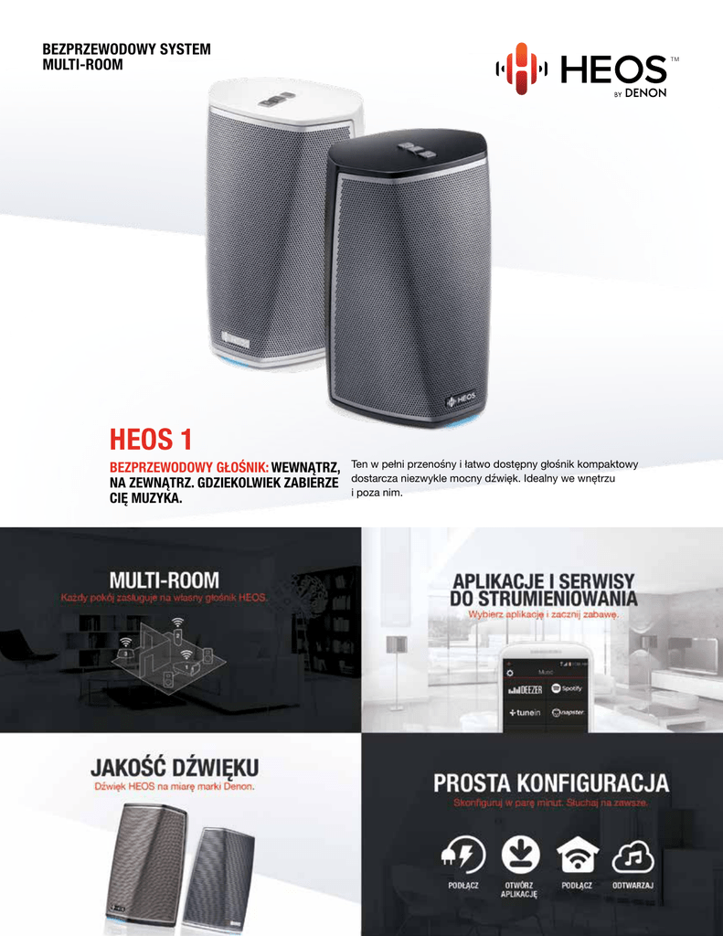BEZPRZEWODOWY SYSTEM MULTI-ROOM HEOS 1 BEZPRZEWODOWY GŁOŚNIK: WEWNĄTRZ, NA ZEWNĄTRZ. GDZIEKOLWIEK ZABIERZE CIĘ MUZYKA. TM Ten w pełni przenośny i łatwo dostępny głośnik kompaktowy dostarcza niezwykle mocny dźwięk. Idealny we wnętrzu i poza nim. APLIKACJA HEOS PROSTY I ŁATWY W OBSŁUDZE INTERFACE Strumieniuj z ulubionych serwisów muzycznych lub słuchaj bezpośrednio z telefonu, tabletu lub pamięci USB. Z HEOS masz wszelkie możliwości i dostęp gdzie chcesz. KEY FEATURES: POKOJE: Nadaj każdemu z odtwarzaczy HEOS nazwę w zależności od pomieszczenia, w którym HEOS by Wejdź na HEOSbyDenon.com aby sprawdzić najnowsze dostępne stoi. Grupuj pokoje aby grać we Denon w Twoim regionie serwisy. wszystkich ten sam utwór w trybie „party”. Rozdziel pokoje aby grać różne utwory w każdym z nich. *Dostępność serwisów muzycznych może być uzależniona od regionu. Nie wszystkie serwisy mogą być dostępne w NIECH GRA MUZYKA: Błyskawicznie decyduj jaka muzyka jest odtwarzana w każdym pomieszczeniu, oglądaj grafikę okładek lub sprawdź kolejkę żeby wiedzieć co będzie następne. Twórz i zapisuj playlisty. momencie zakupu. Niektóre serwisy mogą być dodawane lub usuwane w zależności od decyzji operatorów serwisów lub innych. Wejdź na www.HEOSbyDenon.com aby sprawdzić informacje i ogłoszenia. KLUCZOWE CECHY: HEOS 1 oferuje niezwykle bogaty dźwięk z kompaktowego, przenośnego głośnika. Strumieniuj muzykę z chmury lub plików lokalnych za pomocą aplikacji HEOS dla iOS, Android™ i Kindle ™. 2 aktywne przetworniki, w tym nisko-średniotonowy i precyzyjna kopułka wysokotonowa. Obudowa HEOS 1 jest uszczelniona i odporna na wilgoć, co czyni go idealny do stosowania w wilgotnym środowisku, takim jak łazienka. HEOS 1 wyposażony jest w zaawansowane przetwarzanie DSP (Digital Signal Processing), niestandardową korekcję dźwięku oraz dwukanałowy cyfrowy wzmacniacz klasy D, co zapewnia naturalną równowagę tonalną. • Słuchaj ulubionej muzyki w dowolnym pomieszczeniu w do domu • Dźwięk zoptymalizowany przez precyzyjne akustyczne algorytmy przetwarzania powstałe w najlepszych studiach nagraniowych • Użyj 2 głośników HEOS 1 dla doskonale zsynchronizowanego stereo • Gniazdo USB i analogowe wejście liniowe jack • Port LAN RJ-45 do bezpośredniego podłączenia do sieci • Przyciski głośniej, ciszej, wł./wył. • Zasilacz sieciowy • Opcjonalny Go Pack: akumulator litowo-jonowy (do 6 godzin odtwarzania), adapter USB do bezprzewodowego strumieniowania Bluetooth®, silikonowa osłona przed zachlapaniem wodą SPECYFIKACJA TECHNICZNA DŹWIĘK ŹRÓDŁA MUZYKI Amplifier: 2-kanałowy wzmacniacz cyfrowy klasy D Obsługiwane serwisy muzyczne: Spotify® (Connect), TuneIn, Deezer, Napster, Tidal i wkrótce wiele nowych.* Speakers: Dwudrożny system głośnikowy z 2 aktywnymi przetwornikami - nisko-średniotonowym o szerokim zakresie i miękką kopułką wysokotonową. Muzyka zapisana w telefonie/ tablecie: Muzyka z iTunes zapisana lokalnie w urządzeniu iOS, pliki muzyczne na urządzeniach Android lub Kindle Fire™. NAS (Network Attached Storage): Odtwarzaj z sieci domowej DLNA SIEĆ Połączenia bezprzewodowe: Standard 802.11a/b/g/n, 2.4GHz i 5GHz Połączenia przewodowe: Pojedynczy port RJ-45 jack do kablowego podłączenia do sieci Pamięć USB: podłączona do HEOS 1 lub innego odtwarzacza HEOS Wejście Aux: źródło analogowe podłączone do HEOS 1 lub innego odtwarzacza HEOS Pobieranie muzyki: niezabezpieczone DRM pliki do pobrania z dowolnego serwisu ** Radio internetowe: strumieniowanie Obsługiwane formaty audio: MP3 i WMA, w tym pliki WMA zakupione do pobrania, a także AAC (MPEG4) i FLAC (bezstratny) wraz z plikami WAV. Obsługuje częstotliwość próbkowania 32 kHz, 44,1 kHz i 48 kHz. *W zależności od dostępności w Twojej okolicy **W zależności od obsługiwanego formatu audio MP3, AAC i WMA Obsługiwane pliki graficzne: JPG, PNG, BMP i GIF OGÓLNE Przyciski i wskaźniki: Wymiary (wys x szer x gł): Zasilanie: AC 100~240V, Zawartość opakowania: • Głośnik HEOS 1 • Głośność w górę / w dół (+,-) AC 50~60Hz, automatycznie 189 x 129 x 128 mm • Zasilacz • Wyciszenie | Wskaźnik LED przełączany zasilacz Wykończenie produktu: • Kabel inst. 3,5 mm wyciszenia Waga: 1.9 kg czarne lub białe • Kabel Ethernet • Kolorowy wskaźnik stanu (LED) Temperatura pracy: • Instrukcja obsługi • Podłączenie do sieci (z tyłu) 5°C to 35°C • Reset (z tyłu) Uwaga: W związku z tym, że dążymy do ciągłej poprawy jakości naszych produktów, specyfikacje mogą ulec zmianie bez powiadomienia. HEOSbyDenon.com