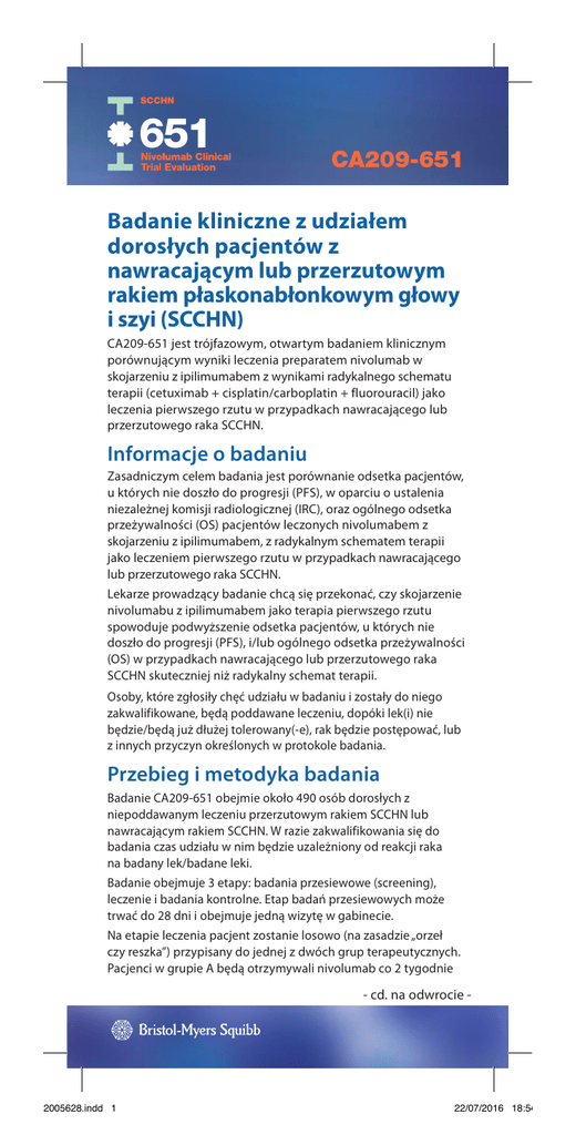 SCCHN 651 CA209-651 Badanie kliniczne z udziałem dorosłych pacjentów z nawracającym lub przerzutowym rakiem płaskonabłonkowym głowy i szyi (SCCHN) CA209-651 jest trójfazowym, otwartym badaniem klinicznym porównującym wyniki leczenia preparatem nivolumab w skojarzeniu z ipilimumabem z wynikami radykalnego schematu terapii (cetuximab + cisplatin/carboplatin + fluorouracil) jako leczenia pierwszego rzutu w przypadkach nawracającego lub przerzutowego raka SCCHN. Informacje o badaniu Zasadniczym celem badania jest porównanie odsetka pacjentów, u których nie doszło do progresji (PFS), w oparciu o ustalenia niezależnej komisji radiologicznej (IRC), oraz ogólnego odsetka przeżywalności (OS) pacjentów leczonych nivolumabem z skojarzeniu z ipilimumabem, z radykalnym schematem terapii jako leczeniem pierwszego rzutu w przypadkach nawracającego lub przerzutowego raka SCCHN. Lekarze prowadzący badanie chcą się przekonać, czy skojarzenie nivolumabu z ipilimumabem jako terapia pierwszego rzutu spowoduje podwyższenie odsetka pacjentów, u których nie doszło do progresji (PFS), i/lub ogólnego odsetka przeżywalności (OS) w przypadkach nawracającego lub przerzutowego raka SCCHN skuteczniej niż radykalny schemat terapii. Osoby, które zgłosiły chęć udziału w badaniu i zostały do niego zakwalifikowane, będą poddawane leczeniu, dopóki lek(i) nie będzie/będą już dłużej tolerowany(-e), rak będzie postępować, lub z innych przyczyn określonych w protokole badania. Przebieg i metodyka badania Badanie CA209-651 obejmie około 490 osób dorosłych z niepoddawanym leczeniu przerzutowym rakiem SCCHN lub nawracającym rakiem SCCHN. W razie zakwalifikowania się do badania czas udziału w nim będzie uzależniony od reakcji raka na badany lek/badane leki. Badanie obejmuje 3 etapy: badania przesiewowe (screening), leczenie i badania kontrolne. Etap badań przesiewowych może trwać do 28 dni i obejmuje jedną wizytę w gabinecie. Na etapie leczenia pacjent zostanie losowo (na zasadzie „orzeł czy reszka”) przypisany do jednej z dwóch grup terapeutycznych. Pacjenci w grupie A będą otrzymywali nivolumab co 2 tygodnie - cd. na odwrocie - 172005628.indd 1 22/07/2016 18:54 oraz ipilimumab co 6 tygodni dożylnie (obydwa leki dożylnie). Pacjenci w grupie B otrzymają cetuximab dożylnie, cisplatin lub carboplatin w pierwszym dniu, oraz fluorouracil co 3 tygodnie przez okres obejmujący do 6 cykli, a następnie cetuximab co tydzień. Stan zdrowia osób objętych badaniem będzie w dalszym ciągu monitorowany po zakończeniu otrzymywania leku będącego przedmiotem badania. Pierwsza wizyta kontrolna odbędzie się w gabinecie lekarza około 30 dni po zaprzestaniu przyjmowania badanego leku/badanych leków, a następnie 90 dni po pierwszej wizycie kontrolnej. Kolejne wizyty będą miały miejsce mniej więcej co 3 miesiące (w gabinecie lub telefonicznie). Kwalifikacja Aby zakwalifikować się do badania, należy spełniać następujące warunki: •Ukończone co najmniej 18 lat •Stwierdzony rak SCCHN z ogniskiem tylko w jednym z następujących obszarów: jama ustna, gardło środkowe, gardło dolne lub krtań •Stwierdzona choroba przerzutowa lub nawracająca, która nie reaguje na terapię mającą na celu wyleczenie, przy czym pacjent nie był dotychczas poddawany ogólnoustrojowemu leczeniu raka w charakterze podstawowej terapii choroby nawracającej lub przerzutowej •Pacjent ma dostateczną ilość tkanki nowotworowej do przeprowadzenia analizy PD-L1 •U pacjenta nie występuje(-ą): nawracający lub przerzutowy rak jamy gardłowo-nosowej, rak płaskonabłonkowy o nieznanym ognisku pierwotnym, rak płaskonabłonkowy o ognisku zlokalizowanym w skórze lub śliniance, lub o histologii niepłaskonabłonkowej (np. czerniak błony śluzowej); aktywne przerzuty do mózgu; rakowe zapalenie opon mózgowych; wcześniejsze leczenie dowolnymi przeciwciałami lub lekiem ukierunkowanym na kostymulację limfocytów T lub szlaków kontrolnych; wcześniejszy aktywny nowotwór złośliwy w ostatnich 2 latach (inny niż rak lokalnie wyleczalny); potwierdzona lub podejrzewana choroba autoimmunologiczna; zapalenie wątroby typu B lub C, HIV lub AIDS W celu uzyskania dalszych informacji o tym badaniu klinicznym prosimy zwrócić się do swojego lekarza. Państwa udział i poświęcony czas może być cennym darem dla innych chorych na raka. 172004703-POL 07/2016 [5628] 172005628.indd 2 22/07/2016 18:54