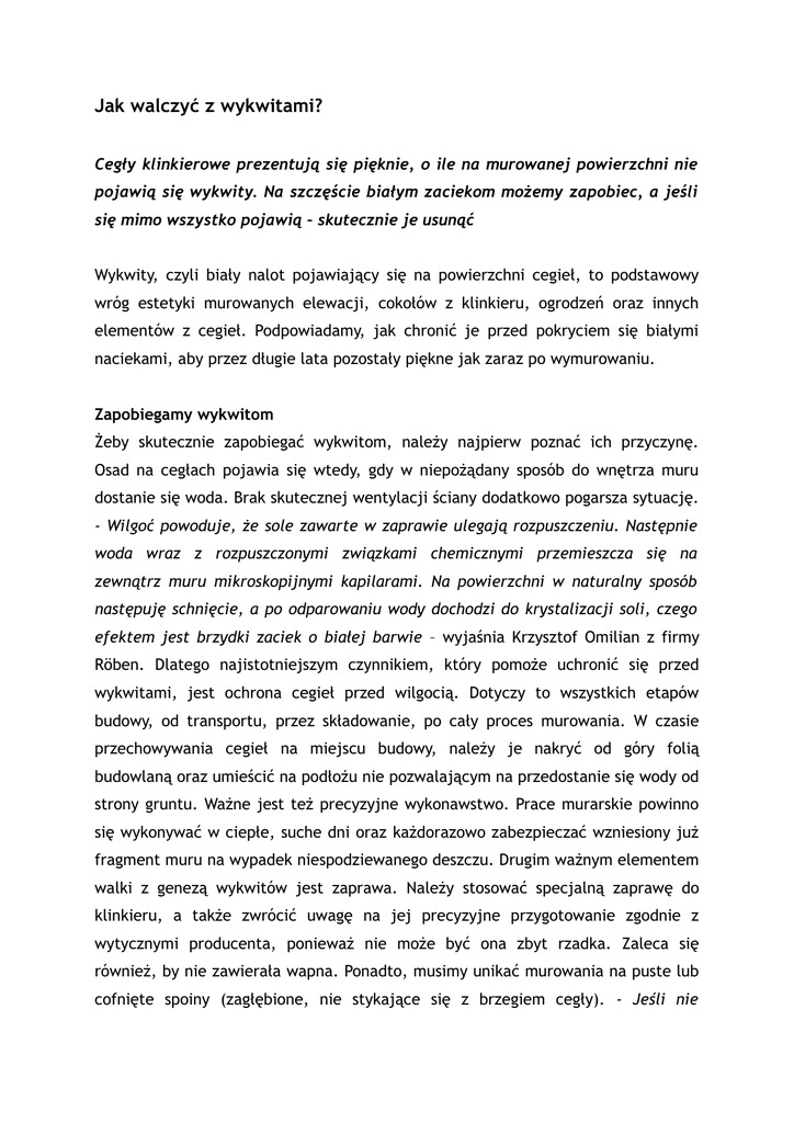 Jak walczyć z wykwitami? Cegły klinkierowe prezentują się pięknie, o ile na murowanej powierzchni nie pojawią się wykwity. Na szczęście białym zaciekom możemy zapobiec, a jeśli się mimo wszystko pojawią – skutecznie je usunąć Wykwity, czyli biały nalot pojawiający się na powierzchni cegieł, to podstawowy wróg estetyki murowanych elewacji, cokołów z klinkieru, ogrodzeń oraz innych elementów z cegieł. Podpowiadamy, jak chronić je przed pokryciem się białymi naciekami, aby przez długie lata pozostały piękne jak zaraz po wymurowaniu. Zapobiegamy wykwitom Żeby skutecznie zapobiegać wykwitom, należy najpierw poznać ich przyczynę. Osad na cegłach pojawia się wtedy, gdy w niepożądany sposób do wnętrza muru dostanie się woda. Brak skutecznej wentylacji ściany dodatkowo pogarsza sytuację. - Wilgoć powoduje, że sole zawarte w zaprawie ulegają rozpuszczeniu. Następnie woda wraz z rozpuszczonymi związkami chemicznymi przemieszcza się na zewnątrz muru mikroskopijnymi kapilarami. Na powierzchni w naturalny sposób następuję schnięcie, a po odparowaniu wody dochodzi do krystalizacji soli, czego efektem jest brzydki zaciek o białej barwie – wyjaśnia Krzysztof Omilian z firmy Röben. Dlatego najistotniejszym czynnikiem, który pomoże uchronić się przed wykwitami, jest ochrona cegieł przed wilgocią. Dotyczy to wszystkich etapów budowy, od transportu, przez składowanie, po cały proces murowania. W czasie przechowywania cegieł na miejscu budowy, należy je nakryć od góry folią budowlaną oraz umieścić na podłożu nie pozwalającym na przedostanie się wody od strony gruntu. Ważne jest też precyzyjne wykonawstwo. Prace murarskie powinno się wykonywać w ciepłe, suche dni oraz każdorazowo zabezpieczać wzniesiony już fragment muru na wypadek niespodziewanego deszczu. Drugim ważnym elementem walki z genezą wykwitów jest zaprawa. Należy stosować specjalną zaprawę do klinkieru, a także zwrócić uwagę na jej precyzyjne przygotowanie zgodnie z wytycznymi producenta, ponieważ nie może być ona zbyt rzadka. Zaleca się również, by nie zawierała wapna. Ponadto, musimy unikać murowania na puste lub cofnięte spoiny (zagłębione, nie stykające się z brzegiem cegły). - Jeśli nie zastosujemy się do tej zasady, w niewypełnionych miejscach będzie gromadzić się woda opadowa. Z czasem może się ona przedostać w głąb muru, powodując powstawanie wykwitów, a nawet osłabienie całej konstrukcji – ostrzega Krzysztof Omilian. W przypadku elewacji, powinno się dodatkowo zapewnić cyrkulację powietrza wewnątrz konstrukcji ściany. Odprowadzanie wilgoci uniemożliwi wypłukiwanie soli. Konieczne jest również zabezpieczenie warstwy osłonowej przed przedostawaniem się wody do jej wnętrza, głównie dzięki szczelnym połączeniom murarskim oraz fachowo wykonanym obróbkom blacharskim. Usuwanie białego nalotu Jeśli na murze mimo wszystko pojawią się wykwity, nie można tego zignorować. By przywrócić cegłom estetyczną powierzchnię, trzeba zacząć od usunięcia przyczyny, która mogła spowodować powstanie nacieków. W murze mogły się np. ukruszyć fugi, co powoduje przedostawanie się wilgoci do wnętrza muru. Po uszczelnieniu tych miejsc i zabezpieczeniu ściany przed wilgocią, można rozpocząć usuwanie wykwitów. W pierwszej kolejności zaleca się mechaniczne oczyszczanie cegieł poprzez szczotkowanie na sucho. Wyczyściwszy w ten sposób mur, należy go zmyć ciepłą wodą przy użyciu myjki ciśnieniowej. Jeśli nalot nie zostanie w pełni usunięty, można zastosować specjalistyczne preparaty dedykowane usuwaniu wykwitów. Są one dostępne w większości hurtowni budowlanych. Przed zastosowaniem środka należy w słoneczny, suchy dzień zmyć cegły wodą i odczekać, aż dobrze wyschną. Podobnie jak w przypadku wszelkich innych środków chemicznych, przed użyciem preparatu zaleca się zrobienie próby na mało widocznym fragmencie muru. Następnie na powierzchnię muru nanosi się preparat, ściśle trzymając się wytycznych zawartych w instrukcji, która uwzględnia także zalecenia pogodowe. Jeśli sami nie chcemy lub nie możemy walczyć z wykwitami, z pomocą przyjdzie specjalistyczną ekipa.