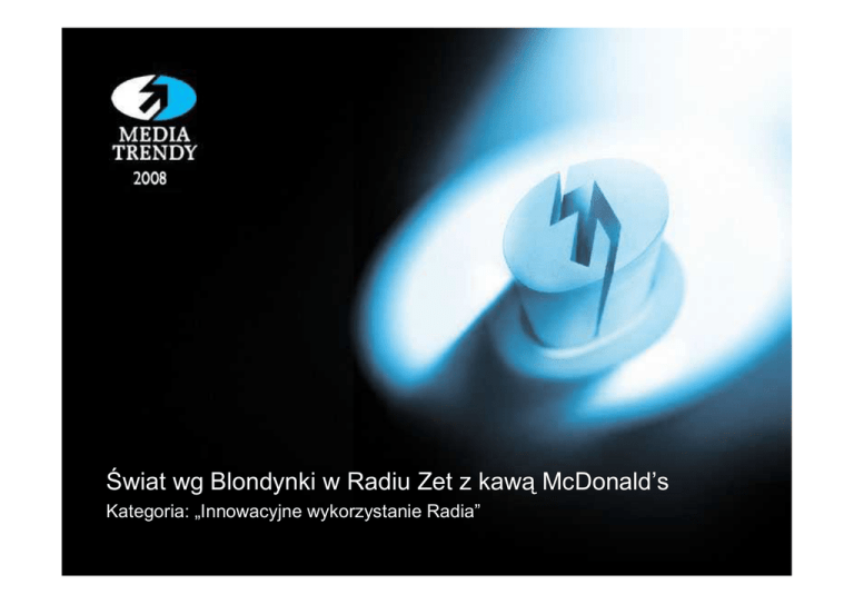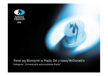 Świat wg Blondynki w Radiu Zet z kawą McDonald’s Kategoria: „Innowacyjne wykorzystanie Radia” Czy wiecie Państwo…? 1a Komentarz lektora 1b Czy wiecie Państwo… …Co to jest guajojo? …Który król pijał kawę z Musztardą i Szampanem? …Dlaczego pijąc kawę w Brazylii nigdy nie trzeba prosić o dolewkę? …Jak przyrządzić kawę Kilimandżaro? Zagadki z deszczowego lasu 2a Edited by Foxit Reader Copyright(C) by Foxit Software Company,2005-2007 For Evaluation Only. Komentarz lektora 2b …Żeby odpowiedzieć na te pytania wcale nie trzeba było ruszać się z domu… Wystarczyło włączyć Radio Zet gdzie od października do grudnia 2007 roku program Beaty Pawlikowskiej Świat wg Blondynki został wzbogacony o cykl 7 audycji poświęconych kawie i tradycjom jej picia na świecie. Posłuchajcie… ścieżka dźwiękowa nr 1-tło slajd 2a Kampania wizerunkowa w radio 3a Cel kampanii: Poprawienie wizerunku jakości kawy w McDonald’s ( kawa z Certyfikatem Rain Forest Alliance) Wsparcie kampanii launchowej nowej kawy w McDonald’s Grupa celowa: Mieszkańcy miast, ceniący doskonały smak świeżo mielonej kawy, osoby pijące kawę poza domem Wyzwanie: Realizacja kampanii wizerunkowej w radio Rozwiązanie: Stworzenie słuchaczom Radia Zet inspirującej i pachnącej kawą atmosfery poprzez cykl audycji znanej podróżniczki Beaty Pawlikowskiej Komentarz lektora 3b Jesienią 2007 McDonald’s wprowadził do swojej oferty nową kawę. Nowy, doskonały smak świeżo mielonych ziaren miał zmienić postrzeganie kawy w McDonald’s i zachęcić mieszkańców miast do chwili relaksu z kubkiem kawy. Celem komunikacji marketingowej było podkreślenie najwyższej jakości nowego produktu a w szczególności faktu, że kawa w McDonald’s pochodzi z upraw posiadających Certyfikat Rainforest Alliance Podjęliśmy się wyjątkowo trudnego zadania: Realizacji kampanii wizerunkowej w radio. Wydawałoby się- NIEMOŻLIWE A jednak nam się udało…. Niekonwencjonalne formaty radiowe 4a Zagadki z Deszczowego Lasu – cykl specjalnie stworzony dla McDonald’s Niekonwencjonalne formaty radiowe, które pozwoliły na stworzenie wspaniałej kawowej atmosfery Zapowiedzi programu zachęcające do słuchania opowieści pachnących kawą Kawowe Konkursy SMSowe dla słuchaczy Radia Zet prowadzone przez Beatę Pawlikowską z nagrodami fundowanymi przez McDonald’s Kawowe Jingle towarzyszące każdej audycji Cykl audycji, które tworzyły pożądany wizerunek nowej kawy w McDonald’s Komentarz lektora 4b Cykl Zagadki z Deszczowego Lasu został stworzony specjalnie na potrzeby promocji nowej kawy w restauracjach McDonald’s W ramach audycji Świat wg Blondynki wykorzystaliśmy niekonwencjonalne formaty radiowe, które pozwoliły na stworzenie wspaniałej kawowej atmosfery przez 7 niedzielnych poranków. W ramach audycji pojawiły się Zapowiedzi programu zachęcające do słuchania opowieści pachnących kawą w Radiu Zet Kawowe Jingle towarzyszące każdej audycji Specjalne wydania Siłowni umysłowej czyli konkursy SMSowe związane z tematyką kawy dla słuchaczy Radia Zet prowadzone przez Beatę Pawlikowską. (Jedną z nagród w konkursie był m.in.udział w wyprawie do dżungli amazońskiej z Beatą Pawlikowską) Audycja Radiowa pachnąca kawą 5a Edited by Foxit Reader Copyright(C) by Foxit Software Company,2005-2007 For Evaluation Only. Komentarz lektora 5b Wyjątkowość pomysłu polegała na stworzeniu inspirującego, egzotycznego otoczenia dla komunikacji nowej kawy w McDonald’s. I to co najważniejsze, sama audycja podróżniczki pozwoliła słuchaczom przenieść się do świata pachnącego południowoamerykańską kawą. Posłuchajcie (Ścieżka dźwiękowa nr 2, tło slajd 5a) Efekty 6a Efekty: Pozytywne opinie konsumentów na temat nowej kawy i komunikacji marketingowej potwierdzone w badaniach focusowych Zaangażowanie słuchaczy w cykl audycji Zagadki z Deszczowego Lasu ( liczba SMSów) Komentarz lektora 6b Kampania nowej kawy McDonald’s zyskała wiele pozytywnych opinii wśród odbiorców, którzy wprost mówili, że nie spodziewali się tak niestandardowej a jednocześnie subtelnej komunikacji po marce McDonald’s Dzięki interaktywnej formule radiowej audycji oraz atrakcyjnym nagrodom w konkursach udało nam się nawiązać dialog z konsumentami o czym świadczy duża liczba nadsyłanych SMSów oraz wysyłane przez słuchaczy drogą mailową opinie na temat prezentowanych przepisów na egzotyczną kawę