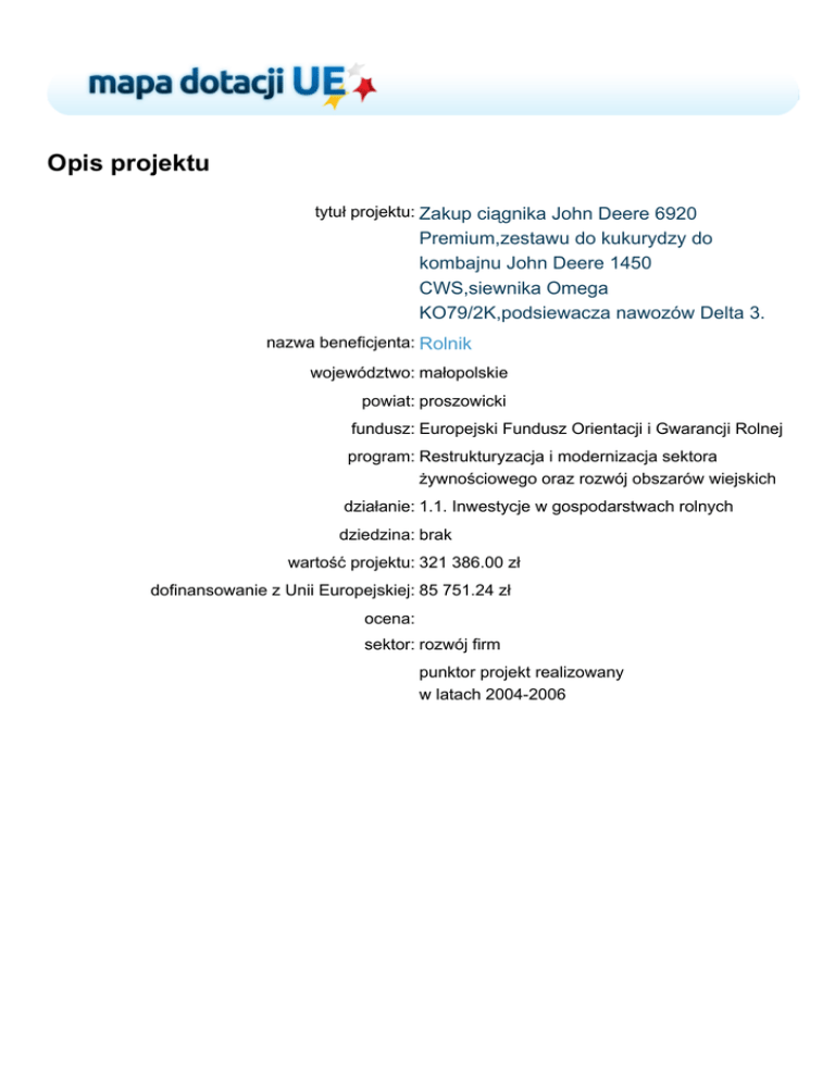 Opis projektu tytuł projektu: Zakup ciągnika John Deere 6920 Premium,zestawu do kukurydzy do kombajnu John Deere 1450 CWS,siewnika Omega KO79/2K,podsiewacza nawozów Delta 3. nazwa beneficjenta: Rolnik województwo: małopolskie powiat: proszowicki fundusz: Europejski Fundusz Orientacji i Gwarancji Rolnej program: Restrukturyzacja i modernizacja sektora żywnościowego oraz rozwój obszarów wiejskich działanie: 1.1. Inwestycje w gospodarstwach rolnych dziedzina: brak wartość projektu: 321 386.00 zł dofinansowanie z Unii Europejskiej: 85 751.24 zł ocena: sektor: rozwój firm punktor projekt realizowany w latach 2004-2006