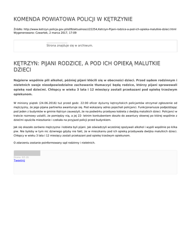 KOMENDA POWIATOWA POLICJI W KĘTRZYNIE Źródło: http://www.ketrzyn.policja.gov.pl/o09/aktualnosci/22254,Ketrzyn-Pijani-rodzice-a-pod-ich-opieka-malutkie-dzieci.html Wygenerowano: Czwartek, 2 marca 2017, 17:09 Strona znajduje się w archiwum. KĘTRZYN: PIJANI RODZICE, A POD ICH OPIEKĄ MALUTKIE DZIECI Najpierw wspólnie pili alkohol, później pijani kłócili się w obecności dzieci. Przed sądem rodzinnym i nieletnich swoje nieodpowiedzialne zachowanie tłumaczyć będą rodzice, którzy pijani sprawowali opiekę nad dziećmi. Chłopcy w wieku 3 lata i 12 miesięcy zostali przekazani pod opiekę trzeźwym opiekunom. W miniony piątek (24.06.2016) tuż przed godz. 22:00 oficer dyżurny kętrzyńskich policjantów otrzymał zgłoszenie od mężczyzny, że jego pijana partnerka awanturuje się. Pod wskazany adres pojechali policjanci. Funkcjonariusze podjeżdżając pod jeden z budynków w gminie Kętrzyn zauważyli, że na podwórku przebywa kobieta z dwójką malutkich dzieci. Policjanci w trakcie rozmowy ustalili, że pomiędzy nią, a jej 22- letnim konkubentem doszło do awantury słownej po której wspólnie z dziećmi opuściła mieszkanie i czekała na przyjazd policji przed budynkiem. Jak się okazało zarówno mężczyzna i kobieta byli pijani. Jak oświadczyli wcześniej spożywali alkohol i wypili wspólnie po kilka piw. Nie byłoby w tym nic dziwnego gdyby nie fakt, że w mieszkaniu pod ich opieką przebywała dwójka malutkich dzieci. Chłopcy w wieku 3 lata i 12 miesięcy zostali przekazani pod opiekę trzeźwym opiekunom. O zdarzeniu zostanie poinformowany sąd rodzinny i nieletnich. Ocena: 0/5 (0) Tweetnij