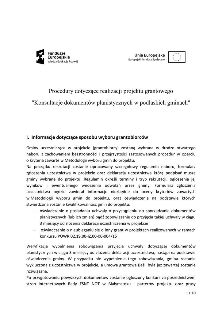 Procedury dotyczące realizacji projektu grantowego "Konsultacje dokumentów planistycznych w podlaskich gminach" I. Informacje dotyczące sposobu wyboru grantobiorców Gminy uczestniczące w projekcie (grantobiorcy) zostaną wybrane w drodze otwartego naboru z zachowaniem bezstronności i przejrzystości zastosowanych procedur w oparciu o kryteria zawarte w Metodologii wyboru gmin do projektu. Na początku rekrutacji zostanie opracowany szczegółowy regulamin naboru, formularz zgłoszenia uczestnictwa w projekcie oraz deklaracja uczestnictwa którą podpisać muszą gminy wybrane do projektu. Regulamin określi terminy i tryb rekrutacji, ogłoszenia jej wyników i ewentualnego wnoszenia odwołań przez gminy. Formularz zgłoszenia uczestnictwa będzie zawierał informacje niezbędne do oceny kryteriów zawartych w Metodologii wyboru gmin do projektu, oraz oświadczenia na podstawie których stwierdzona zostanie kwalifikowalność gmin do projektu: − oświadczenie o posiadaniu uchwały o przystąpieniu do sporządzania dokumentów planistycznych (lub ich zmian) bądź zobowiązanie do przyjęcia takiej uchwały w ciągu 3 miesięcy od złożenia deklaracji uczestniczenia w projekcie − oświadczenie o nieubieganiu się o inny grant w projektach realizowanych w ramach konkursu POWR.02.19.00-IZ.00-00-004/15 Weryfikacja wypełnienia zobowiązania przyjęcia uchwały dotyczącej dokumentów planistycznych w ciągu 3 miesięcy od złożenia deklaracji uczestnictwa, nastąpi na podstawie oświadczenia gminy. W przypadku nie wypełnienia tego zobowiązania, gmina zostanie wykluczona z uczestnictwa w projekcie, a umowa grantowa (jeśli była już zawarta) zostanie rozwiązana. Po przygotowaniu powyższych dokumentów zostanie ogłoszony konkurs za pośrednictwem stron internetowych Rady FSNT NOT w Białymstoku i parterów projektu oraz prasy 1 z 10 regionalnej i portalu Wrota Podlasia. W trakcie rekrutacji nie będzie sprawdzane, czy potencjalny grantobiorca nie jest wykluczony z możliwości otrzymania środków, gdyż wszyscy grantobiorcy to jst, które nie podlegają takiemu wykluczeniu. W projekcie uczestniczyć mogą tylko gminy z terenu woj. podlaskiego. Zgodnie z Metodologią wyboru gmin do projektu, preferowane będą gminy o małym stopniu pokrycia dokumentami planistycznymi z uwzględnieniem prowadzonej działalności inwestycyjnej, obejmujące granicami administracyjnymi powierzchniowe formy ochrony przyrody, oraz takie dla których występują przedłużające się procedury planistyczne lub specyficzna tematyka dokumentu planistycznego. Wskaźniki projektu będą monitorowane na bieżąco w ramach wydzielonego zadania projektowego na podstawie dokumentacji realizacyjnej projektu. W sytuacji zagrożenia realizacji IPK przez gminę, zostanie ona wykluczona z projektu i zastąpiona przez inną z listy rezerwowej utworzonej w trakcie rekrutacji. W przypadku braku gmin na liście rezerwowej, ogłoszony będzie dodatkowy nabór. Kryteria zawarte w Metodologii wyboru gmin do projektu: KRYTERIA DOSTĘPU (obligatoryjne) (Ocena spełniania kryteriów polega na przypisaniu im wartości logicznych „tak” albo „nie”) 1. gmina posiada uchwałę o przystąpieniu do sporządzania dokumentów planistycznych (lub ich zmian) bądź zobowiązała się do przyjęcia takiej uchwały w ciągu 3 miesięcy od złożenia deklaracji uczestniczenia w projekcie 2. gmina posiada obowiązujące studium uwarunkowań i kierunków zagospodarowania przestrzennego 3. zauważalna jest przynajmniej minimalna aktywność gminy w zakresie planowania przestrzennego, wyrażona wypełnianiem przez organy gminy obowiązku wynikającego z art. 32 ust. 1 upizp. Kryterium jest spełnione w przypadku gdy gmina posiada uchwałę o której mówi art. 32 ust. 2 upizp (uchwałę w sprawie aktualności studium i planów miejscowych) bądź zobowiąże się do przyjęcia takiej uchwały w ciągu 3 miesięcy od złożenia deklaracji uczestniczenia w projekcie. 4. samorząd gminny posiada narzędzia prawne umożliwiające przeprowadzenie konsultacji społecznych zgodnie z Art. 5a ustawy z dnia 8 marca 1990 r. o samorządzie gminnym (Dz. U. z 2013 r. poz. 594 z późn. zm.) Kryterium jest spełnione, gdy gmina posiada uchwałę określającą zasady i tryb przeprowadzania konsultacji w przypadkach innych spraw ważnych dla gminy bądź zobowiąże się do przyjęcia takiej uchwały w ciągu 6 miesięcy od złożenia deklaracji uczestniczenia w projekcie. KRYTERIA STRATEGICZNE (różnicujące) 1. zapewnienie reprezentatywnego udziału poszczególnych typów gmin (wiejskie, miejskowiejskie, miejskie) – na zasadzie proporcjonalności w stosunku do ich rzeczywistej ilości w województwie podlaskim 2 z 10 kryterium: typ gminy (kryterium fakultatywne, do zastosowania w przypadku dużej ilości wniosków, w szczególności wniosków o tej samej liczbie punktów przyznanych w ramach kryteriów strategicznych 2 - 5) gmina wiejska – 70% grantobiorców gmina miejska – 10% grantobiorców gmina miejsko-wiejska – 20% grantobiorców Ocena spełniania kryteriów strategicznych zawartych w punktach 2 – 5 dokonywana będzie w skali punktowej na podstawie informacji podanych przez gminę w zgłoszeniu do projektu. 2. wypracowanie i upowszechnienie metod i narzędzi do prowadzenia konsultacji na terenach o najniższym stopniu pokrycia dokumentami planistycznymi z uwzględnieniem prowadzonej działalności inwestycyjnej; prowadzona działalność inwestycyjna wyrażona w liczbie wydanych pozwoleń na budowę na 1000 mieszkańców (za ostatni rok dla którego dostępne są dane) 1 element kryterium: pokrycie powierzchni gminy dokumentami planistycznymi do 3% - 20 pkt do 10% - 10 pkt do 40% - 5 pkt dla zmiany planu obowiązującego dla całej gminy – 20 pkt 2 element kryterium: prowadzona działalność inwestycyjna poniżej 15 – 10 pkt powyżej 15 – 20 pkt 3. zapewnienie reprezentatywnego udziału gmin obejmujących granicami admini