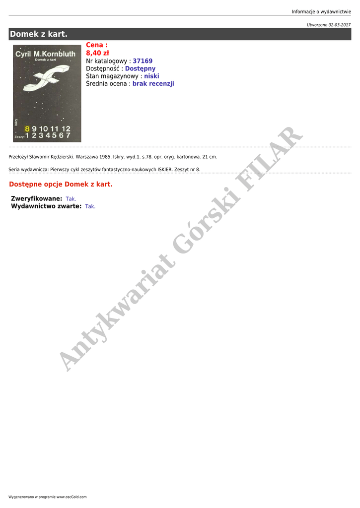 Informacje o wydawnictwie Utworzono 02-03-2017 Domek z kart. Cena : 8,40 zł LA R Nr katalogowy : 37169 Dostępność : Dostępny Stan magazynowy : niski Średnia ocena : brak recenzji Przełożył Sławomir Kędzierski. Warszawa 1985. Iskry. wyd.1. s.78. opr. oryg. kartonowa. 21 cm. FI Seria wydawnicza: Pierwszy cykl zeszytów fantastyczno-naukowych ISKIER. Zeszyt nr 8. Dostępne opcje Domek z kart. An ty k w ar ia t G ór sk i Zweryfikowane: Tak. Wydawnictwo zwarte: Tak. Wygenerowano w programie www.oscGold.com