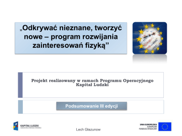 „Odkrywać nieznane, tworzyć nowe – program rozwijania zainteresowań fizyką” Projekt realizowany w ramach Programu Operacyjnego Kapitał Ludzki Podsumowanie III edycji Lech Głazunow „Odkrywać nieznane, tworzyć nowe – program rozwijania zainteresowań fizyką” Projekt skierowany do uczniów gimnazjów oraz szkół ponagimnazjalnych, chcących rozwijać swoje zainteresowania podczas doświadczeń praktycznych oraz warsztatów na uczelniach wyższych, warsztatów ZobaczZbadaj-Zrozum, warsztatów CERN w Genewie. Lech Głazunow „Odkrywać nieznane, tworzyć nowe – program rozwijania zainteresowań fizyką” Działania zrealizowane w ramach trzeciej edycji 1665 uczestników (1753) 153 grupy 130 nauczycieli prowadzących zajęcia Wszyscy uczniowie zrealizowali program zajęć rozwijających zainteresowania fizyką w wymiarze 108 godzin lekcyjnych, w tym 72 godziny zajęć w pracowni komputerowej oraz 36 godzin w pracowni komputerowej. Lech Głazunow „Odkrywać nieznane, tworzyć nowe – program rozwijania zainteresowań fizyką” Działania zrealizowane w ramach trzeciej edycji Wszyscy uczniowie dwukrotnie brali udział w zajęciach na lokalnych uczelniach wyższych, 2 godz. wykład, pokaz, 2 godz. zajęcia laboratoryjne, zwiedzanie uczelnianych pracowni fizycznych, zapoznanie się z ofertą studiów. o Akademia Pomorska Gdynia o Uniwersytet Gdański o Politechnika Koszalińska o Państwowa Wyższa Szkoła Zawodowa Sulechów o Politechnika Śląska o Uniwersytet Opolski Lech Głazunow „Odkrywać nieznane, tworzyć nowe – program rozwijania zainteresowań fizyką” Działania zrealizowane w ramach trzeciej edycji Wszyscy uczniowie dwukrotnie brali udział w zajęciach na lokalnych uczelniach wyższych, 2 godz. wykład, pokaz, 2 godz. zajęcia laboratoryjne, zwiedzanie uczelnianych pracowni fizycznych, zapoznanie się z ofertą studiów. o Politechnika Częstochowska o Politechnika Warszawska o Akademia Podlaska o Politechnika Wrocławska o Akademia Górniczo-Hutnicza Kraków o Uniwersytet Rzeszowski Lech Głazunow „Odkrywać nieznane, tworzyć nowe – program rozwijania zainteresowań fizyką” Działania zrealizowane w ramach trzeciej edycji Na podstawie wewnętrznego konkursu warsztatów Zobacz-Zbadaj-Zrozum, spośród najciekawszych propozycji doświadczeń, wyłoniono 160 uczestników trzydniowych warsztatów fizycznych. Zajęcia odbyły się w ośrodkach wypoczynkowych. o Ośrodek Szkoleniowy „Borki”, Smardzewice o Hotel „Erania”, Ustronie Morskie o Hotel „Skoczek”, Żelistrzewo o Ośrodek „Sosna”, Wisła o Willa „Brygida”, Kudowa Zdrój o Pałac w Gliśnie Lech Głazunow „Odkrywać nieznane, tworzyć nowe – program rozwijania zainteresowań fizyką” Działania zrealizowane w ramach trzeciej edycji Na podstawie wewnętrznego konkursu przeprowadzonego na platformie projektu, 45 uczniów wzięło udział w 5 dniowych warsztatach fizycznych w CERN w Genewie. Lech Głazunow „Odkrywać nieznane, tworzyć nowe – program rozwijania zainteresowań fizyką” Działania zrealizowane w ramach trzeciej edycji Na podstawie sprawozdań z realizacji projektu, ewaluacji oraz wyników pracy z dziećmi, w każdym regionie jedno gimnazjum oraz szkoła ponadgimnazjalna w sumie 16 szkół uzyskało Przedmiotowy Zestaw Wsparcia (PZW) w postaci zestawu komputerowego, rzutnika multimedialnego, oprogramowania i pomocy naukowych. o I Liceum Ogólnokształcące w Starogardzie Gdańskim o Zespół Szkół Gimnazjum w Siemianicach o I Liceum Ogólnokształcące w Kartuzach o III Liceum Ogólnokształcące w Częstochowie Lech Głazunow „Odkrywać nieznane, tworzyć nowe – program rozwijania zainteresowań fizyką” Działania zrealizowane w ramach trzeciej edycji Na podstawie sprawozdań z realizacji projektu, ewaluacji oraz wyników pracy z dziećmi, w każdym regionie jedno gimnazjum oraz szkoła ponadgimnazjalna w sumie 16 szkół uzyskało Przedmiotowy Zestaw Wsparcia (PZW) w postaci zestawu komputerowego, rzutnika multimedialnego, oprogramowania i pomocy naukowych. o Zespół Szkół Ogólnokształcących w Prudniku o Gimnazjum w Chwiramie o Zespół Szkół Ponadgimnazjalnych w Trzebiatowie o Zespół Szkół w Sławkowie o Zespół Szkół nr3 w Jaśle o Publiczne Gimnazjum nr 6 w Wałbrzychu Lech Głazunow „Odkrywać nieznane, tworzyć nowe – program rozwijania zainteresowań fizyką” Działania zrealizowane w ramach trzeciej edycji Na podstawie sprawozdań z realizacji projektu, ewaluacji oraz wyników pracy z dziećmi, w każdym regionie jedno gimnazjum oraz szkoła ponadgimnazjalna w sumie 16 szkół uzyskało Przedmiotowy Zestaw Wsparcia (PZW) w postaci zestawu komputerowego, rzutnika multimedialnego, oprogramowania i pomocy naukowych. o Gimnazjum nr 2 w Nysie o I Liceum Ogólnokształcące „Carolinum” w Nysie o Gimnazjum nr 2 w Czerwionce -Leszczynach o Zespół Szkół w Dobiegniewie o XIV Liceum Ogólnokształcące w Poznaniu o Gimnazjum nr 2 w Częstochowie Lech Głazunow