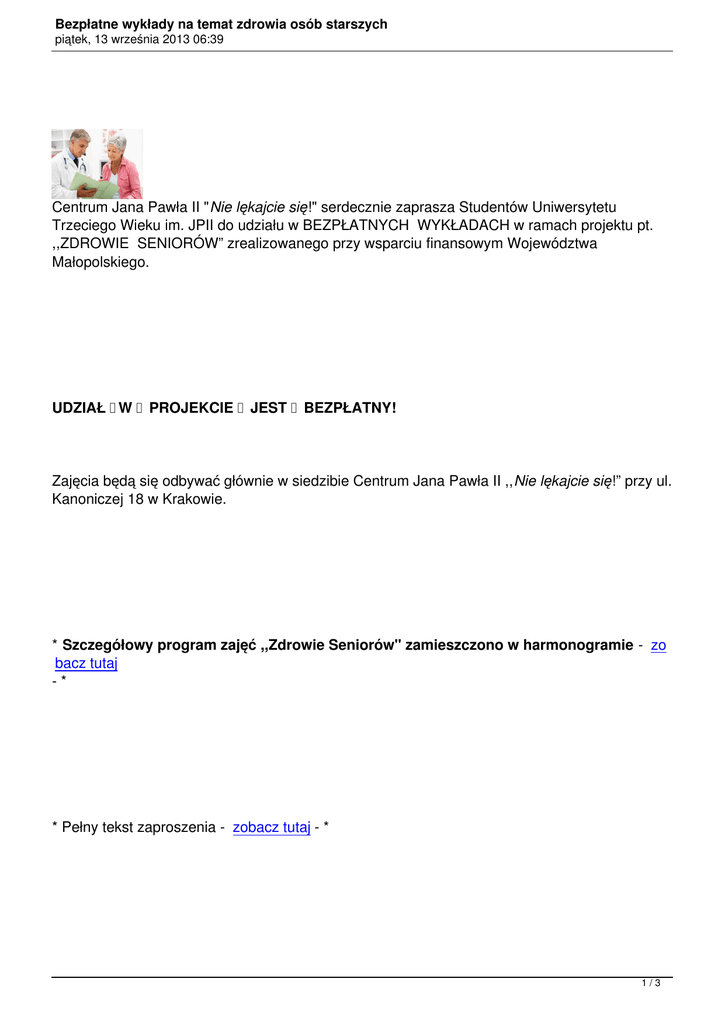 Bezpłatne wykłady na temat zdrowia osób starszych piątek, 13 września 2013 06:39 Centrum Jana Pawła II "Nie lękajcie się!" serdecznie zaprasza Studentów Uniwersytetu Trzeciego Wieku im. JPII do udziału w BEZPŁATNYCH WYKŁADACH w ramach projektu pt. ,,ZDROWIE SENIORÓW” zrealizowanego przy wsparciu finansowym Województwa Małopolskiego. UDZIAŁ W PROJEKCIE JEST BEZPŁATNY! Zajęcia będą się odbywać głównie w siedzibie Centrum Jana Pawła II ,,Nie lękajcie się!” przy ul. Kanoniczej 18 w Krakowie. * Szczegółowy program zajęć ,,Zdrowie Seniorów" zamieszczono w harmonogramie - zo bacz tutaj - * * Pełny tekst zaproszenia - zobacz tutaj - * 1/3 Bezpłatne wykłady na temat zdrowia osób starszych piątek, 13 września 2013 06:39 * Serdecznie zachęcamy do aktywnego udziału w projekcie pn. ,,Zdrowie Seniorów” także inne osoby starsze zainteresowane tematyką profilaktyki zdrowia. * Projekt zrealizowano przy wsparciu finansowym Województwa Małopolskiego. Patrząc na problem pogarszania się stanu zdrowia osób starszych, Centrum Jana Pawła II ,,Nie lękajcie się !” postanowiło pomóc tej grupie społeczeństwa poprzez szereg wykładów edukacyjnych na temat zdrowia. Celem projektu jest przede wszystkim poprawa jakości i poziomu życia seniorów do godnego starzenia się poprzez odpowiednio przygotowany program wykładów. Inne założenia projektu to: zwiększenie dostępności do nauki w zakresie wiedzy o naturalnych środkach leczenia, tańszych metodach wpływających na poprawę stanu zdrowia i profilaktyki oraz przygotowanie społeczeństwa do starości. Chcemy angażować słuchaczy w aktywność turystyczną, prowadzenie zdrowego trybu życia poprzez sport i zdrową kuchnię oraz ziołolecznictwo. Dzięki pomocy Partnerów Centrum będzie możliwość skorzystania z wyspecjalizowanej kadry medycznej Towarzystwa Przyjaciół Chorych- Hospicjum św. Łazarza z Krakowa. Pomoc przy realizacji zadania zgodził się udzielić także Zakon Szpitala św. Jana Bożego Bonifratrów z 2/3 Bezpłatne wykłady na temat zdrowia osób starszych piątek, 13 września 2013 06:39 Krakowa oraz Zespół Szkół Przemysłu Spożywczego w Krakowie, który wesprze doświadczoną kadrą z zakresu dietetyki. Czas wykładów będzie połączony z dyskusją, stąd też seniorzy będą mogli zadawać ważne dla nich pytania i uzyskiwać porady w wielu dziedzinach. Mamy nadzieję, że wpłynie to na ułatwienie kontaktów osób starszych z instytucjami, takimi jak służba zdrowia, czy też ośrodki rehabilitacyjne. *** Przede wszystkim trzeba patrzeć na ludzi starszych w świetle ich godności ludzkiej, która nie zanika w miarę upływu lat i pogarszania się stanu psychicznego i fizycznego. Oczywiście tego typu postawa może zakorzenić się tylko w społeczeństwie zdolnym przezwyciężyć rozpowszechniane stereotypy, wedle których o wartości człowieka stanowi młodość, wydajność, fizyczna żywotność i pełnia zdrowia. Doświadczenie uczy, że brak tego pozytywnego nastawienia sprzyja marginalizacji ludzi starszych i skazuje ich na samotność porównywalną do prawdziwej śmierci społecznej. A czyż mniemanie, jakie człowiek starszy ma o sobie, nie zależy w dużej mierze od uwagi, jaką poświęca mu rodzina i społeczeństwo? Jan Paweł II List papieski do uczestników II Światowego Zgromadzenia poświęconego problemom starzenia się ludności / Watykan, 3 kwietnia 2002 r. 3/3