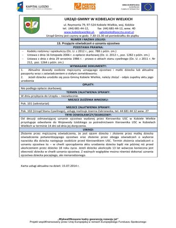 URZĄD GMINY W KOBIELACH WIELKICH ul. Reymonta 79, 97-524 Kobiele Wielkie, woj. łódzkie tel. (44) 681-44-12, fax (44) 681-44-12, wew. 40 www.kobielewielkie.pl, [email protected] Urząd Gminy jest czynny w godz. 7.30-15.30 od poniedziałku do piątku NUMER I NAZWA USŁUGI: 13. Przyjęcie oświadczeń o uznaniu ojcostwa PODSTAWA PRAWNA: − Kodeks rodzinny i opiekuńczy (Dz. U. z 2012 r., poz. 788 z późn. zm.) − Ustawa z dnia 16 listopada 2006 r. o opłacie skarbowej (Dz. U. 2012 r., poz. 1282 z późn. zm.) − Ustawa z dnia z dnia 29 września 1986 r. - prawo o aktach stanu cywilnego (Dz. U. z 2011 r. Nr 212, poz. 1264 z późn. zm.) WYMAGANE DOKUMENTY: 1. Aktualne dowody osobiste mężczyzny uznającego ojcostwo i matki dziecka lub aktualne paszporty wraz z zaświadczeniem o stałym zameldowaniu. 2. Jeżeli dziecko urodziło się poza Gminą Kobiele Wielkie, należy złożyć - odpis zupełny aktu jego urodzenia OPŁATY: Nie podlega opłacie skarbowej. TERMIN ZAŁATWIENIA SPRAWY: W dniu przybycia do Urzędu – niezwłocznie. MIEJSCE ZŁOŻENIA WNIOSKU: Pok. 101 (sekretariat) MIEJSCE ZAŁATWIENIA SPRAWY: Pok. 102 (Urząd Stanu Cywilnego), usługę realizuje Joanna Zakrzewska, tel. 44 681 44 12 wew. 27 TRYB ODWOŁAWCZY/SKARGOWY: Od decyzji odmawiającej uznanie ojcostwa wydanej przez Kierownika USC w Kobiele Wielkie przysługuje odwołanie do Wojewody Łódzkiego za pośrednictwem Kierownika USC w Kobielach Wielkich w terminie 14 dni od dnia jej doręczenia. UWAGI: Złożenie przez mężczyznę oświadczenia, że jest ojcem dziecka i złożenie przez matkę dziecka oświadczenia potwierdzającego ojcostwo oraz złożenie przez obojga oświadczeń o wyborze nazwiska dla dziecka następuje osobiście przed Kierownikiem USC. Termin złożenia oświadczeń o uznaniu ojcostwa to – w chwili sporządzenia aktu urodzenia dziecka bądź nie później niż przed ukończeniem przez dziecko 18 roku życia. Jeżeli dziecko ukończyło 13 lat wówczas konieczna jest obecność dziecka w chwili uznania ojcostwa. Z ważnych względów można również dokonać uznania ojcostwa dziecka poczętego, ale nienarodzonego. Karta usługi aktualna na dzień: 15.07.2014 r. „Wykwalifikowane kadry gwarancją rozwoju jst” Projekt współfinansowany przez Unię Europejską w ramach Europejskiego Funduszu Społecznego