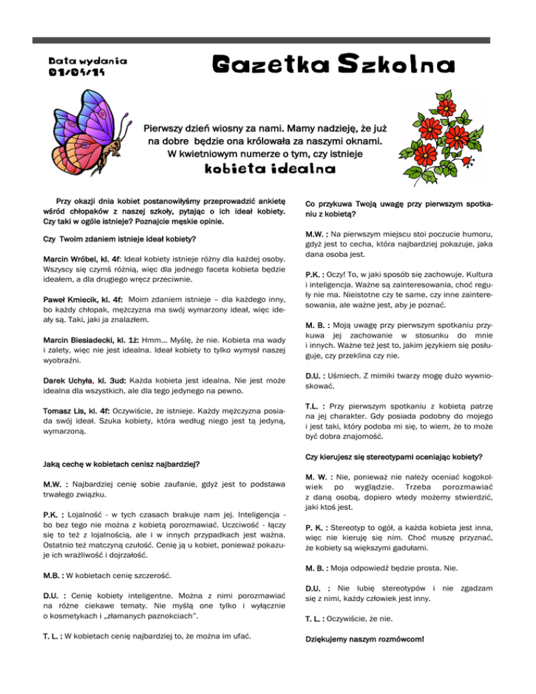 Gazetka Szkolna Data wydania 01/04/14 Pierwszy dzień wiosny za nami. Mamy nadzieję, że już na dobre będzie ona królowała za naszymi oknami. W kwietniowym numerze o tym, czy istnieje kobieta idealna Przy okazji dnia kobiet postanowiłyśmy przeprowadzić ankietę wśród chłopaków z naszej szkoły, pytając o ich ideał kobiety. Czy taki w ogóle istnieje? Poznajcie męskie opinie. Czy Twoim zdaniem istnieje ideał kobiety? Marcin Wróbel, kl. 4f: Ideał kobiety istnieje różny dla każdej osoby. Wszyscy się czymś różnią, więc dla jednego faceta kobieta będzie ideałem, a dla drugiego wręcz przeciwnie. Paweł Kmiecik, kl. 4f: Moim zdaniem istnieje – dla każdego inny, bo każdy chłopak, mężczyzna ma swój wymarzony ideał, więc ideały są. Taki, jaki ja znalazłem. Marcin Biesiadecki, kl. 1ż: Hmm… Myślę, że nie. Kobieta ma wady i zalety, więc nie jest idealna. Ideał kobiety to tylko wymysł naszej wyobraźni. Darek Uchyła, kl. 3ud: Każda kobieta jest idealna. Nie jest może idealna dla wszystkich, ale dla tego jedynego na pewno. Tomasz Lis, kl. 4f: Oczywiście, że istnieje. Każdy mężczyzna posiada swój ideał. Szuka kobiety, która według niego jest tą jedyną, wymarzoną. Jaką cechę w kobietach cenisz najbardziej? M.W. : Najbardziej cenię sobie zaufanie, gdyż jest to podstawa trwałego związku. P.K. : Lojalność - w tych czasach brakuje nam jej. Inteligencja bo bez tego nie można z kobietą porozmawiać. Uczciwość - łączy się to też z lojalnością, ale i w innych przypadkach jest ważna. Ostatnio też matczyną czułość. Cenię ją u kobiet, ponieważ pokazuje ich wrażliwość i dojrzałość. M.B. : W kobietach cenię szczerość. D.U. : Cenię kobiety inteligentne. Można z nimi porozmawiać na różne ciekawe tematy. Nie myślą one tylko i wyłącznie o kosmetykach i „złamanych paznokciach”. T. L. : W kobietach cenię najbardziej to, że można im ufać. Co przykuwa Twoją uwagę przy pierwszym spotkaniu z kobietą? M.W. : Na pierwszym miejscu stoi poczucie humoru, gdyż jest to cecha, która najbardziej pokazuje, jaka dana osoba jest. P.K. : Oczy! To, w jaki sposób się zachowuje. Kultura i inteligencja. Ważne są zainteresowania, choć reguły nie ma. Nieistotne czy te same, czy inne zainteresowania, ale ważne jest, aby je poznać. M. B. : Moją uwagę przy pierwszym spotkaniu przykuwa jej zachowanie w stosunku do mnie i innych. Ważne też jest to, jakim językiem się posługuje, czy przeklina czy nie. D.U. : Uśmiech. Z mimiki twarzy mogę dużo wywnioskować. T.L. : Przy pierwszym spotkaniu z kobietą patrzę na jej charakter. Gdy posiada podobny do mojego i jest taki, który podoba mi się, to wiem, że to może być dobra znajomość. Czy kierujesz się stereotypami oceniając kobiety? M. W. : Nie, ponieważ nie należy oceniać kogokolwiek po wyglądzie. Trzeba porozmawiać z daną osobą, dopiero wtedy możemy stwierdzić, jaki ktoś jest. P. K. : Stereotyp to ogół, a każda kobieta jest inna, więc nie kieruję się nim. Choć muszę przyznać, że kobiety są większymi gadułami. M. B. : Moja odpowiedź będzie prosta. Nie. D.U. : Nie lubię stereotypów i nie zgadzam się z nimi, każdy człowiek jest inny. T. L. : Oczywiście, że nie. Dziękujemy naszym rozmówcom! Str. 2 Gazetka Szkolna Dzień języków obcych Odkrywamy talenty! Nasza szkoła jest pełna ukrytych talentów. Chcemy Wam przedstawić tych, którzy już się nam „ujawnili”. Niedawno obchodziliśmy Światowy Dzień Poezji, dlatego postanowiłyśmy tym razem porozmawiać z autorką wierszy, Moniką Franiak. Od kiedy piszesz? M.F. : Pisać zaczęłam w pierwszej klasie gimnazjum, lecz były to zwykłe rymowanki. Wszystko szło do szuflady. Dopiero w drugiej lub trzeciej klasie pokazałam zeszyt nauczycielce i tak się zaczęło. Skąd ta pasja? Pierwszy dzień kalendarzowej wiosny w naszej szkole upłynął pod hasłem: „Dzień języków obcych.” W kilku miejscach rozstawione były stoiska prezentujące kulturę, tradycje, muzykę krajów anglojęzycznych i niemieckich. Można było zobaczyć różne ciekawe przedmioty, skosztować potraw kuchni innych narodów. Dla uczniów przygotowano liczne konkursy i pokazy filmowe. W bibliotece szkolnej przy herbatce z samowara i kwasie chlebowym drugoklasiści poznawali m.in. rosyjski alfabet, uczyli się prostych słówek, sprawdzali swoją wiedzę o Rosji i śpiewali z zespołem Tatu. Wszystkim bardzo się podobało. Było wesoło, kolorowo i miło. Oby więcej takich dni! M.F. : Sama nie wiem. Od zawsze lubiłam czytać wiersze i pewnego razu postanowiłam przelać swoje uczucia na papier. Czy masz na tym polu jakieś osiągnięcia? M.F. : Tak. Już w pierwszym konkursie, w którym wzięłam udział, zdobyłam 3 miejsce, co dodało mi chęci do dalszego pisania. Od tamtej pory tylko w jednym konkursie nic nie zdobyłam, zazwyczaj zostawałam laureatką lub otrzymywałam wyróżnienie. Czy masz ulubioną tematykę? M.F. : Nie. Piszę to, co mi przyjdzie do głowy. Kiedyś były to smutne wiersze, teraz staram się pisać weselej! Czy masz jeszcze jakieś pasje? Książki i jak każdy - muzykę. To jest to, co mnie relaksuje, ale również uczy. Przeczytajcie jeden z wierszy Moniki: Życie przewrotne jest Życie przewrotne jest Więc uważaj na jego treść Nie narzekaj że coś nie wyszło Bo szczęście jest jak szkło Upadkami się nie zrażaj Na przeszkody uważaj Dzisiaj - lubiany przez wszystkich Prima Aprilis! Nie zapomnijcie spłatać figla swoim bliskim i znajomym. Dobry - ale nie głupi - żart może poprawić humor największym smutasom!!! O tym co złe zapomnij Znaczenie szczęścia pojmij! Monika Franiak Redakcja: Monika Czekalska, Magdalena Kokot, Michalina Kucz
