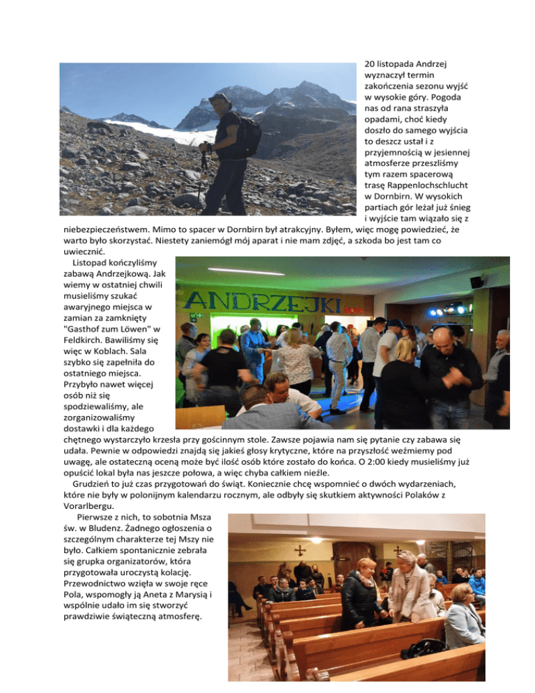 20 listopada Andrzej wyznaczył termin zakończenia sezonu wyjść w wysokie góry. Pogoda nas od rana straszyła opadami, choć kiedy doszło do samego wyjścia to deszcz ustał i z przyjemnością w jesiennej atmosferze przeszliśmy tym razem spacerową trasę Rappenlochschlucht w Dornbirn. W wysokich partiach gór leżał już śnieg i wyjście tam wiązało się z niebezpieczeństwem. Mimo to spacer w Dornbirn był atrakcyjny. Byłem, więc mogę powiedzieć, że warto było skorzystać. Niestety zaniemógł mój aparat i nie mam zdjęć, a szkoda bo jest tam co uwiecznić. Listopad kończyliśmy zabawą Andrzejkową. Jak wiemy w ostatniej chwili musieliśmy szukać awaryjnego miejsca w zamian za zamknięty "Gasthof zum Löwen" w Feldkirch. Bawiliśmy się więc w Koblach. Sala szybko się zapełniła do ostatniego miejsca. Przybyło nawet więcej osób niż się spodziewaliśmy, ale zorganizowaliśmy dostawki i dla każdego chętnego wystarczyło krzesła przy gościnnym stole. Zawsze pojawia nam się pytanie czy zabawa się udała. Pewnie w odpowiedzi znajdą się jakieś głosy krytyczne, które na przyszłość weźmiemy pod uwagę, ale ostateczną oceną może być ilość osób które zostało do końca. O 2:00 kiedy musieliśmy już opuścić lokal była nas jeszcze połowa, a więc chyba całkiem nieźle. Grudzień to już czas przygotowań do świąt. Koniecznie chcę wspomnieć o dwóch wydarzeniach, które nie były w polonijnym kalendarzu rocznym, ale odbyły się skutkiem aktywności Polaków z Vorarlbergu. Pierwsze z nich, to sobotnia Msza św. w Bludenz. Żadnego ogłoszenia o szczególnym charakterze tej Mszy nie było. Całkiem spontanicznie zebrała się grupka organizatorów, która przygotowała uroczystą kolację. Przewodnictwo wzięła w swoje ręce Pola, wspomogły ją Aneta z Marysią i wspólnie udało im się stworzyć prawdziwie świąteczną atmosferę. Również spontanicznie zebrała się liczna grupa Polaków. Na Mszy i w późniejszej kolacji uczestniczyło ponad 70 osób. To imponująca frekwencja. Drugie wydarzenie to udział naszego Polonijnego zespołu w Weihnachtsmarkt na Rynku w Feldkirch. W zimowej temperaturze rozgrzewając się gorącym Glühwein mogliśmy wspólnie śpiewać polskie kolędy zgromadzonym mieszkańcom Feldkirch. Kierownik zespołu Gienek postarał się o perfekcyjne przygotowanie sceny. Dzięki czemu na austriackiej ziemi polskich kolęd „Głos się rozchodził”. Mimo minusowej temperatury spora grupa rodaków wspomogła naszych artystów i licznie przybyła do Rynku.