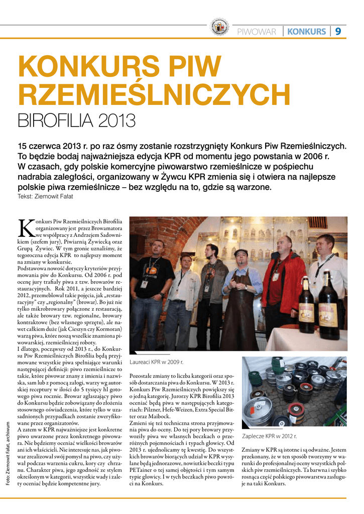 PIWOWAR KONKURS 9 KONKURS PIW RZEMIEŚLNICZYCH BIROFILIA 2013 15 czerwca 2013 r. po raz ósmy zostanie rozstrzygnięty Konkurs Piw Rzemieślniczych. To będzie bodaj najważniejsza edycja KPR od momentu jego powstania w 2006 r. W czasach, gdy polskie komercyjne piwowarstwo rzemieślnicze w pośpiechu nadrabia zaległości, organizowany w Żywcu KPR zmienia się i otwiera na najlepsze polskie piwa rzemieślnicze – bez względu na to, gdzie są warzone. Tekst: Ziemowit Fałat Foto: Ziemowit Fałat, archiwum K onkurs Piw Rzemieślniczych Birofi lia organizowany jest przez Browamatora we współpracy z Andrzejem Sadownikiem (szefem jury), Piwiarnią Żywiecką oraz Grupą Żywiec. W tym gronie uznaliśmy, że tegoroczna edycja KPR to najlepszy moment na zmiany w konkursie. Podstawowa nowość dotyczy kryteriów przyjmowania piw do Konkursu. Od 2006 r. pod ocenę jury trafiały piwa z tzw. browarów restauracyjnych. Rok 2011, a jeszcze bardziej 2012, przemeblował takie pojęcia, jak „restauracyjny” czy „regionalny” (browar). Bo już nie tylko mikrobrowary połączone z restauracją, ale także browary tzw. regionalne, browary kontraktowe (bez własnego sprzętu), ale nawet całkiem duże (jak Cieszyn czy Kormoran) warzą piwa, które noszą wszelkie znamiona piwowarskiej, rzemieślniczej roboty. I dlatego, począwszy od 2013 r., do Konkursu Piw Rzemieślniczych Birofi lia będą przyjmowane wszystkie piwa spełniające warunki następującej definicji: piwo rzemieślnicze to takie, które piwowar znany z imienia i nazwiska, sam lub z pomocą załogi, warzy wg autorskiej receptury w ilości do 5 tysięcy hl gotowego piwa rocznie. Browar zgłaszający piwo do Konkursu będzie zobowiązany do złożenia stosownego oświadczenia, które tylko w uzasadnionych przypadkach zostanie zweryfi kowane przez organizatorów. A zatem w KPR najważniejsze jest konkretne piwo uwarzone przez konkretnego piwowara. Nie będziemy oceniać wielkości browarów ani ich właścicieli. Nie interesuje nas, jak piwowar zrealizował swój pomysł na piwo, czy używał podczas warzenia cukru, kory czy chrzanu. Charakter piwa, jego zgodność ze stylem określonym w kategorii, wszystkie wady i zalety oceniać będzie kompetentne jury. Laureaci KPR w 2009 r. Pozostałe zmiany to liczba kategorii oraz sposób dostarczania piwa do Konkursu. W 2013 r. Konkurs Piw Rzemieślniczych powiększy się o jedną kategorię. Jurorzy KPR Birofi lia 2013 oceniać będą piwa w następujących kategoriach: Pilzner, Hefe-Weizen, Extra Special Bitter oraz Maibock. Zmieni się też techniczna strona przyjmowania piwa do oceny. Do tej pory browary przywoziły piwa we własnych beczkach o przeróżnych pojemnościach i typach głowicy. Od 2013 r. ujednolicamy tę kwestię. Do wszystkich browarów biorących udział w KPR wysyłane będą jednorazowe, nowiutkie beczki typu PETainer o tej samej objętości i tym samym typie głowicy. I w tych beczkach piwo powróci na Konkurs. Zaplecze KPR w 2012 r. Zmiany w KPR są istotne i są odważne. Jestem przekonany, że w ten sposób tworzymy w warunki do profesjonalnej oceny wszystkich polskich piw rzemieślniczych. Ta barwna i szybko rosnąca część polskiego piwowarstwa zasługuje na taki Konkurs.