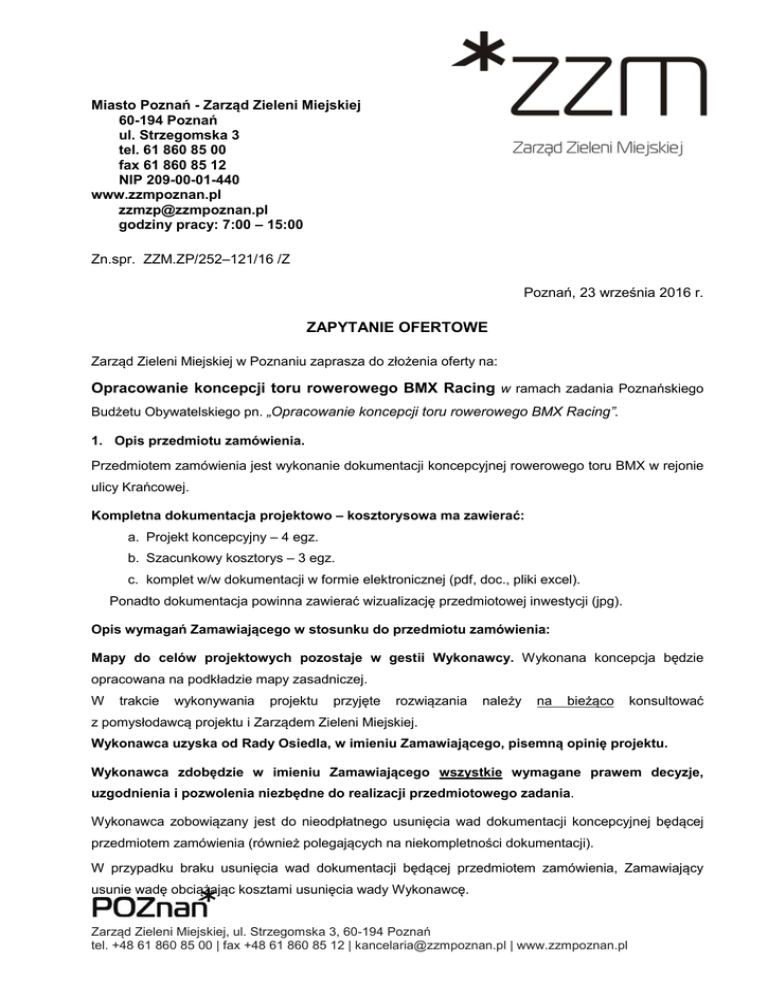 Miasto Poznań - Zarząd Zieleni Miejskiej 60-194 Poznań ul. Strzegomska 3 tel. 61 860 85 00 fax 61 860 85 12 NIP 209-00-01-440 www.zzmpoznan.pl [email protected] godziny pracy: 7:00 – 15:00 Zn.spr. ZZM.ZP/252–121/16 /Z Poznań, 23 września 2016 r. ZAPYTANIE OFERTOWE Zarząd Zieleni Miejskiej w Poznaniu zaprasza do złożenia oferty na: Opracowanie koncepcji toru rowerowego BMX Racing w ramach zadania Poznańskiego Budżetu Obywatelskiego pn. „Opracowanie koncepcji toru rowerowego BMX Racing”. 1. Opis przedmiotu zamówienia. Przedmiotem zamówienia jest wykonanie dokumentacji koncepcyjnej rowerowego toru BMX w rejonie ulicy Krańcowej. Kompletna dokumentacja projektowo – kosztorysowa ma zawierać: a. Projekt koncepcyjny – 4 egz. b. Szacunkowy kosztorys – 3 egz. c. komplet w/w dokumentacji w formie elektronicznej (pdf, doc., pliki excel). Ponadto dokumentacja powinna zawierać wizualizację przedmiotowej inwestycji (jpg). Opis wymagań Zamawiającego w stosunku do przedmiotu zamówienia: Mapy do celów projektowych pozostaje w gestii Wykonawcy. Wykonana koncepcja będzie opracowana na podkładzie mapy zasadniczej. W trakcie wykonywania projektu przyjęte rozwiązania należy na bieżąco konsultować z pomysłodawcą projektu i Zarządem Zieleni Miejskiej. Wykonawca uzyska od Rady Osiedla, w imieniu Zamawiającego, pisemną opinię projektu. Wykonawca zdobędzie w imieniu Zamawiającego wszystkie wymagane prawem decyzje, uzgodnienia i pozwolenia niezbędne do realizacji przedmiotowego zadania. Wykonawca zobowiązany jest do nieodpłatnego usunięcia wad dokumentacji koncepcyjnej będącej przedmiotem zamówienia (również polegających na niekompletności dokumentacji). W przypadku braku usunięcia wad dokumentacji będącej przedmiotem zamówienia, Zamawiający usunie wadę obciążając kosztami usunięcia wady Wykonawcę. Zarząd Zieleni Miejskiej, ul. Strzegomska 3, 60-194 Poznań tel. +48 61 860 85 00 | fax +48 61 860 85 12 | [email protected] | www.zzmpoznan.pl Wykonawca na wykonany przedmiot umowy udziela dwuletniego okresu rękojmi. Parametry obiektu: Teren w okolicach ulicy Krańcowej, Trockiej w 2 lokalizacjach – do wyboru przez Wykonawcę i zatwierdzenia przez ZZM. Zakres opracowania wskazany na załączonej mapie poglądowej i obejmuje obszar po ok. 9000 m2. Założenia do projektu: Dokumentacja musi uwzględniać: - nawierzchnia toru ziemna (dotyczy terenu płaskiego i wzniesień) oraz asfaltowa (dotyczy wyprofilowanych zakrętów); - badania geotechniczne - drenaż terenu; - uwzględnić małą architekturę (ławki, kosze, stojaki na rowery, stacja do naprawy rowerów itp.); - ogrodzenie terenu zielenią (w formie żywopłotów, pasów zieleni, trybuny ziemnej); - rozważyć możliwość oświetlenia terenu; - zaproponować miejsce przyłączenia do sieci elektro-energetycznej (w tym do bramki startowej); - trasa toru powinna być tak rozwiązana aby spełniała przepisy sportowe PZKol – przepisy BMX a w szczególności: Tor BMX musi mieć kształt zwartej, ciasnej pętli, której długość mierzona wzdłuż centralnej linii (osi toru), wynosi minimum 300 metrów i maximum 400 metrów. Tor musi mieć minimum 10 metrów szerokości przy linii startu i nie może zwężać się do szerokości mniejszej niż 5 metrów w jakimkolwiek punkcie. Górka startowe musi mieścić w sobie tor o szerokości nie mniejszej niż 10 metrów i musi wznosić się co najmniej 1,5 metra ponad poziom pierwszej prostej. Optymalna wysokość to 2,5 metra ponad poziom pierwszej prostej. Pierwsza pochyłość rozciągająca się od bramki startowej do poziomu pierwszej prostej musi mieć przynajmniej 12 metrów długości. Bramka startowa powinna mieć minimum 7,3 metra szerokości. Bramka powinna mieć wysokość minimum 50 cm i tworzyć kąt nie większy niż 90 stopni pomiędzy zboczem a platformą, na której stoją rowery kiedy są w pozycji startowej. Konstrukcja bramki startowej – zabudowana z możliwością demontażu kluczowych elementów, elektronicznie kontrolowana bramka, musi być wyposażona w system odpowiednich kolorowych świateł startowych tak usytuowanych, aby były one wyraźnie widziane ze wszystkich torów startowych. Wszyscy zawodnicy muszą widzieć światła jednakowo wyraźnie, kiedy są w pozycji „riders ready”. Powinna zawierać system pomiaru czasu, aby jego włączenie następowało w momencie aktywowania mechanizmu bramki startowej, powodującego jej opuszczenie Pozycje startowe od 1 do 8 muszą być czytelnie oznaczone na bramce. Pierwsza prosta musi mieć minimum 40 metrów długości. Zarząd Zieleni Miejskiej, ul. Strzegomska 3, 60-194 Poznań tel. +48 61 860 85 00 | fax +48 61 860 85 12 | [email protected] | www.zzmpoznan.pl Zaleca się, by podnóże frontalnej (czołowej) części pierwszej przeszkody znajdującej się na pierwszej prostej, było umieszczone nie bliżej niż 35 metrów od bramki startowej i nie mniej niż 20 metrów od pierwszego zakrętu. Pierwszy zakręt może być skierowany w jakimkolwiek kierunku i powinien być tak wyprofilowany, by pozwolić bezpiecznie wjechać i wyjechać z niego z prędkością wyścigową każdemu zawodnikowi, niezależnie od jego wieku. Na pierwszym zakręcie tor powinien mieć minimum 6 metrów szerokości mierzonej wzdłuż od płaszczyzny wewnętrznego promienia do wierzchołka bandy na zewnętrznym promieniu. Tor musi mieć minimum 3 zakręty. Tor musi mieć minimum 5 metrów szerokości na każdym zakręcie. Wszystkie przeszkody na torze muszą być tak skonstruowane, aby były bezpieczne dla zawodników niezależnie od wieku. Na pierwszej prostej minimalna odległość pomiędzy przeszkodami powinna wynosić 10 metrów. Przeszkoda jest zdefiniowana przez jej przednie i tylne zbocze i może być pojedyncza, podwójna, potrójna albo składać się z wielu garbów. Należy rozważyć aby tor można było podzielić na sekcje, które mogą być były włączane do toru i przejeżdżane t