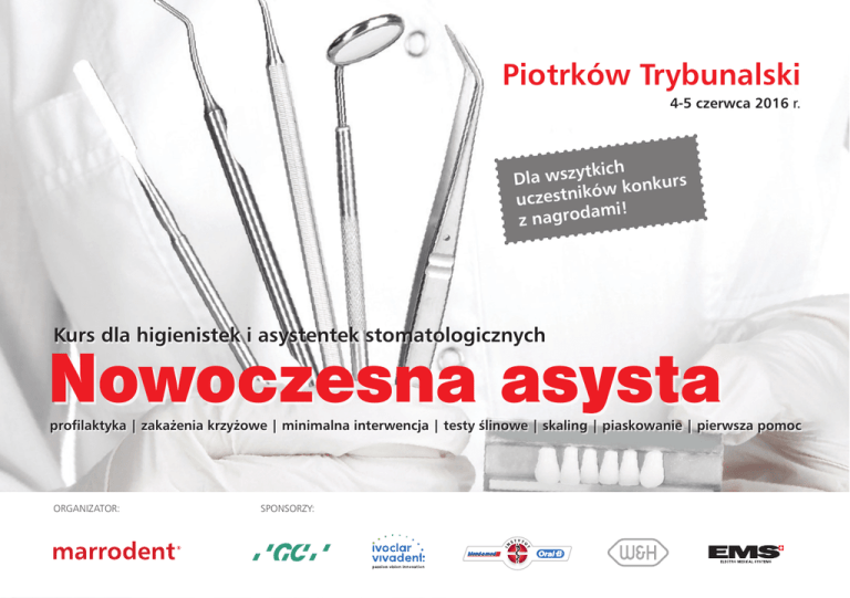 Piotrków Trybunalski 4-5 czerwca 2016 r. tkich Dla wszy urs ów konk ik n t s e z c u ami! z nagrod Kurs dla higienistek i asystentek stomatologicznych Nowoczesna asysta profilaktyka | zakażenia krzyżowe | minimalna interwencja | testy ślinowe | skaling | piaskowanie | pierwsza pomoc ORGANIZATOR: SPONSORZY: 4-5 czerwca 2016 r. Hotel Mercure Piotrków Trybunalski Vestil ***, ul. Armii Krajowej 22c, 97-300 Piotrków Trybunalski marrodent ® wszystko dla stomatologii! wszystko dla protetyki! Nowoczesna asysta 14.30 - 15.00 Rejestracja 15.00 - 17.00 Wykład i pokaz: Skaling i piaskowanie - profesjonalna higiena jamy ustnej. Prowadzący: dypl. hig. Magdalena Michałowska / Swiss Dental Academy 17.00 - 17.15 Przerwa kawowa 17.15 - 19.00 Wykład i pokaz z udziałem pacjenta: Elementy stomatologii minimalnej interwencji - nowoczesne podejście do leczenia próchnicy. Prowadzący: Joanna Łaban-Nanowska / GC Katarzyna Palacz, tel. 668 699 321, [email protected] Wykład i pokaz: Nowoczesne spojrzenie na profilaktykę. OptraDam i OptraGate - prosty i szybki sposób zabezpieczenia i powiększenia pola zabiegowego. Prowadzący: Marta Hajduga / Przedstawiciel Ivoclar Vivadent AG Małgorzata Adamczyk, tel. 666 317 186, [email protected] 21.00 Kolacja integracyjna z oprawą muzyczną (DJ) Paweł Chomicki, tel. 602 369 684, [email protected] 8.00 - 9.30 Śniadanie 9.30 - 12.30 Wykład interaktywny: Stany zagrożenia życia u pacjentów leczonych stomatologicznie. Prowadzący: instruktor Wojciech Fryśny, instruktor Mateusz Man 12.30 - 12.45 Przerwa kawowa 12.45 - 14.15 Najnowsze technologie skutecznej mechanicznej i chemicznej kontroli biofilmu. Prowadzący: mgr Joanna Stępień, Ekspert Kliniczny Instytutu Oral-B & Blend-a-med 19.00 - 20.00 DZIEŃ II Informacje i zapisy: DZIEŃ I profilaktyka | zakażenia krzyżowe | minimalna interwencja | testy ślinowe | skaling | piaskowanie | pierwsza pomoc Koszt uczestnictwa w kursie 380 PLN W cenie kursu zapewniamy nocleg ze śniadaniem, wybrane zabiegi spa (informacja u organizatora), przerwy kawowe oraz kolację integracyjną z oprawą muzyczną. Dział szkoleń Marrodent® tel.: 33 827 83 00, 604 510 689, [email protected] Łukasz Uranek, tel. 728 376 441, [email protected] Agnieszka Jerominek, tel. 728 347 889, [email protected] Krystyna Chudaszek, tel. 728 493 616, [email protected] Michał Uchmański, tel. 668 434 977, [email protected] Paweł Ślązak, tel. 664 567 347, [email protected] Mariusz Sosnowski, tel. 606 128 473, [email protected] 14:15 Rozstrzygnięcie konkursu. Wręczenie nagród oraz certyfikatów. Michał Lipski, tel. 728 303 389, [email protected] Ostatecznym potwierdzeniem uczestnictwa w kursie jest wpłata na poniżej podane konto bankowe. MARRODENT SP. Z O.O. 43-300 Bielsko-Biała, ul. Krasińskiego 31 nr konta mBANK: 48 1140 1049 0000 2278 7400 1024 w tytule płatności prosimy wpisać: dane do faktury, tel. kontaktowy, kod 048/16 W przypadku zgłoszenia rezygnacji, organizator zastrzega sobie prawo do zwrotu uczestnikowi 50% kosztów, jednak nie później niż 10 dni przed szkoleniem. W razie rezygnacji po tym terminie, koszty nie będą zwracane. W przypadku odwołania szkolenia przez organizatora, zwrotowi podlega całość wpłaconych pieniędzy.
