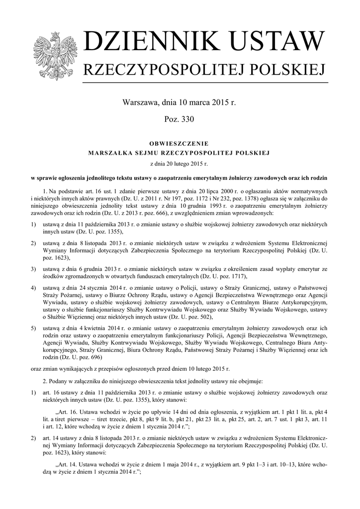 DZIENNIK USTAW RZECZYPOSPOLITEJ POLSKIEJ Warszawa, dnia 10 marca 2015 r. Poz. 330 O B W IE S ZC ZE N I E M ARS ZA ŁK A S EJ M U R ZE C ZY P O S PO LI T EJ PO L SK I EJ z dnia 20 lutego 2015 r. w sprawie ogłoszenia jednolitego tekstu ustawy o zaopatrzeniu emerytalnym żołnierzy zawodowych oraz ich rodzin 1. Na podstawie art. 16 ust. 1 zdanie pierwsze ustawy z dnia 20 lipca 2000 r. o ogłaszaniu aktów normatywnych i niektórych innych aktów prawnych (Dz. U. z 2011 r. Nr 197, poz. 1172 i Nr 232, poz. 1378) ogłasza się w załączniku do niniejszego obwieszczenia jednolity tekst ustawy z dnia 10 grudnia 1993 r. o zaopatrzeniu emerytalnym żołnierzy zawodowych oraz ich rodzin (Dz. U. z 2013 r. poz. 666), z uwzględnieniem zmian wprowadzonych: 1) ustawą z dnia 11 października 2013 r. o zmianie ustawy o służbie wojskowej żołnierzy zawodowych oraz niektórych innych ustaw (Dz. U. poz. 1355), 2) ustawą z dnia 8 listopada 2013 r. o zmianie niektórych ustaw w związku z wdrożeniem Systemu Elektronicznej Wymiany Informacji dotyczących Zabezpieczenia Społecznego na terytorium Rzeczypospolitej Polskiej (Dz. U. poz. 1623), 3) ustawą z dnia 6 grudnia 2013 r. o zmianie niektórych ustaw w związku z określeniem zasad wypłaty emerytur ze środków zgromadzonych w otwartych funduszach emerytalnych (Dz. U. poz. 1717), 4) ustawą z dnia 24 stycznia 2014 r. o zmianie ustawy o Policji, ustawy o Straży Granicznej, ustawy o Państwowej Straży Pożarnej, ustawy o Biurze Ochrony Rządu, ustawy o Agencji Bezpieczeństwa Wewnętrznego oraz Agencji Wywiadu, ustawy o służbie wojskowej żołnierzy zawodowych, ustawy o Centralnym Biurze Antykorupcyjnym, ustawy o służbie funkcjonariuszy Służby Kontrwywiadu Wojskowego oraz Służby Wywiadu Wojskowego, ustawy o Służbie Więziennej oraz niektórych innych ustaw (Dz. U. poz. 502), 5) ustawą z dnia 4 kwietnia 2014 r. o zmianie ustawy o zaopatrzeniu emerytalnym żołnierzy zawodowych oraz ich rodzin oraz ustawy o zaopatrzeniu emerytalnym funkcjonariuszy Policji, Agencji Bezpieczeństwa Wewnętrznego, Agencji Wywiadu, Służby Kontrwywiadu Wojskowego, Służby Wywiadu Wojskowego, Centralnego Biura Antykorupcyjnego, Straży Granicznej, Biura Ochrony Rządu, Państwowej Straży Pożarnej i Służby Więziennej oraz ich rodzin (Dz. U. poz. 696) oraz zmian wynikających z przepisów ogłoszonych przed dniem 10 lutego 2015 r. 2. Podany w załączniku do niniejszego obwieszczenia tekst jednolity ustawy nie obejmuje: 1) art. 16 ustawy z dnia 11 października 2013 r. o zmianie ustawy o służbie wojskowej żołnierzy zawodowych oraz niektórych innych ustaw (Dz. U. poz. 1355), który stanowi: „Art. 16. Ustawa wchodzi w życie po upływie 14 dni od dnia ogłoszenia, z wyjątkiem art. 1 pkt 1 lit. a, pkt 4 lit. a tiret pierwsze – tiret trzecie, pkt 8, pkt 9 lit. b, pkt 21, pkt 23 lit. a, pkt 25, art. 2, art. 7 ust. 1 pkt 3, art. 11 i art. 12, które wchodzą w życie z dniem 1 stycznia 2014 r.”; 2) art. 14 ustawy z dnia 8 listopada 2013 r. o zmianie niektórych ustaw w związku z wdrożeniem Systemu Elektronicznej Wymiany Informacji dotyczących Zabezpieczenia Społecznego na terytorium Rzeczypospolitej Polskiej (Dz. U. poz. 1623), który stanowi: „Art. 14. Ustawa wchodzi w życie z dniem 1 maja 2014 r., z wyjątkiem art. 9 pkt 1–3 i art. 10–13, które wchodzą w życie z dniem 1 stycznia 2014 r.”; Dziennik Ustaw 3) –2– Poz. 330 art. 37 ustawy z dnia 6 grudnia 2013 r. o zmianie niektórych ustaw w związku z określeniem zasad wypłaty emerytur ze środków zgromadzonych w otwartych funduszach emerytalnych (Dz. U. poz. 1717), który stanowi: „Art. 37. Ustawa wchodzi w życie z dniem 1 lutego 2014 r., z wyjątkiem art. 1, art. 8, art. 11, art. 23, art. 29, art. 31 i art. 36, które wchodzą w życie po upływie 14 dni od dnia ogłoszenia.”; 4) art. 19 ustawy z dnia 24 stycznia 2014 r. o zmianie ustawy o Policji, ustawy o Straży Granicznej, ustawy o Państwowej Straży Pożarnej, ustawy o Biurze Ochrony Rządu, ustawy o Agencji Bezpieczeństwa Wewnętrznego oraz Agencji Wywiadu, ustawy o służbie wojskowej żołnierzy zawodowych, ustawy o Centralnym Biurze Antykorupcyjnym, ustawy o służbie funkcjonariuszy Służby Kontrwywiadu Wojskowego oraz Służby Wywiadu Wojskowego, ustawy o Służbie Więziennej oraz niektórych innych ustaw (Dz. U. poz. 502), który stanowi: „Art. 19. Ustawa wchodzi w życie pierwszego dnia miesiąca następującego po upływie 30 dni od dnia ogłoszenia.”; 5) art. 3 i art. 4 ustawy z dnia 4 kwietnia 2014 r. o zmianie ustawy o zaopatrzeniu emerytalnym żołnierzy zawodowych oraz ich rodzin oraz ustawy o zaopatrzeniu emerytalnym funkcjonariuszy Policji, Agencji Bezpieczeństwa Wewnętrznego, Agencji Wywiadu, Służby Kontrwywiadu Wojskowego, Służby Wywiadu Wojskowego, Centralnego Biura Antykorupcyjnego, Straży Granicznej, Biura Ochrony Rządu, Państwowej Straży Pożarnej i Służby Więziennej oraz ich rodzin (Dz. U. poz. 696), które stanowią: „Art. 3. Do wniosków o wznowienie wypłaty świadczeń wstrzymanych na podstawie art. 44 ust. 1 pkt 2 lit. b ustawy, o której mowa w art. 1, albo na podstawie art. 45 ust. 1 pkt 2 lit. b ustawy, o której mowa w art. 2, złożonych i nierozpatrzonych przed dniem wejścia w życie niniejszej ustawy stosuje się odpowiednio przepisy ustawy, o której mowa w art. 1 albo art. 2, w brzmieniu nadanym niniejszą ustawą. Art. 4. Ustawa wchodzi w życie po upływie 14 dni od dnia ogłoszenia.”. Marszałek Sejmu: R. Sikorski Dziennik Ustaw –3– Poz. 330 Załącznik do obwieszczenia Marszałka Sejmu Rzeczypospolitej Polskiej z dnia 20 lutego 2015 r. (poz. 330) US T AW A z dnia 10 grudnia 1993 r. o zaopatrzeniu emerytalnym żołnierzy zawodowych oraz ich rodzin DZIAŁ I Przepisy ogólne Art. 1. Żołnierzom zwolnionym z zawodowej służby wojskowej przysługuje z budżetu państwa, na zasadach określonych w ustawie, zaopatrzenie emerytalne z tytułu wysługi la