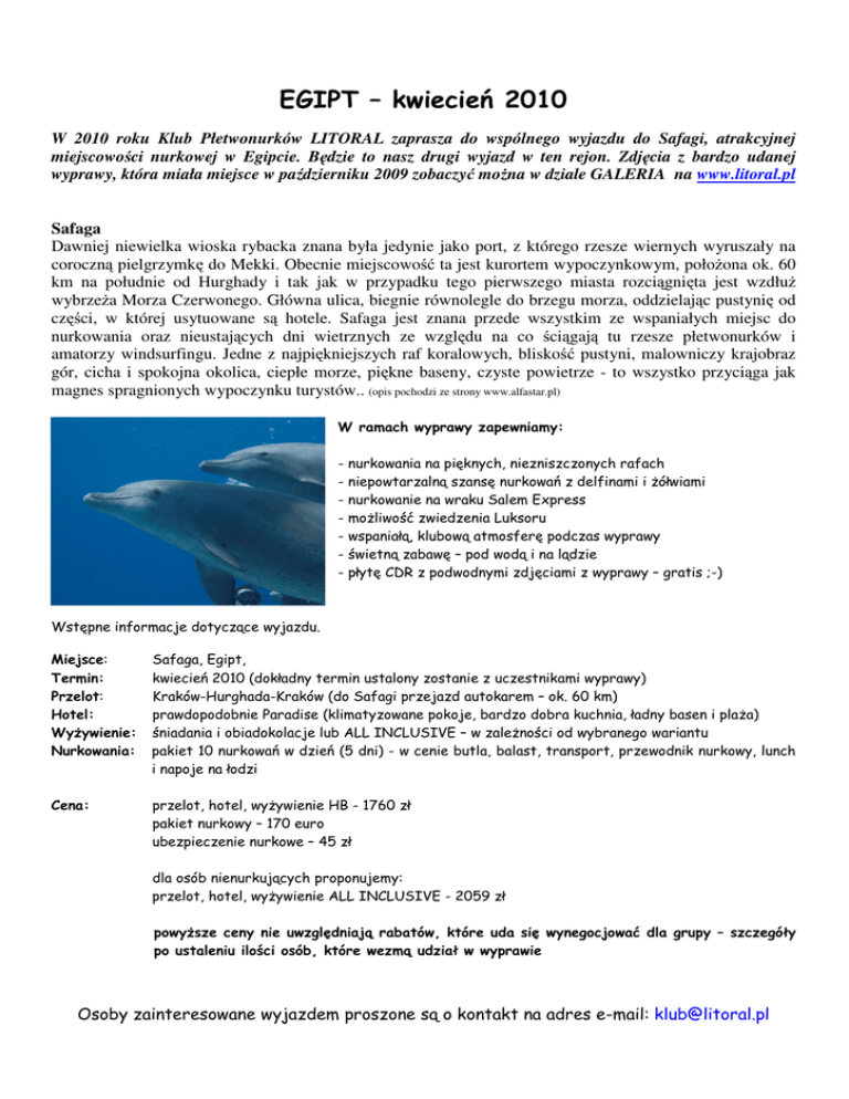 EGIPT – kwiecień 2010 W 2010 roku Klub Płetwonurków LITORAL zaprasza do wspólnego wyjazdu do Safagi, atrakcyjnej miejscowości nurkowej w Egipcie. Będzie to nasz drugi wyjazd w ten rejon. Zdjęcia z bardzo udanej wyprawy, która miała miejsce w październiku 2009 zobaczyć można w dziale GALERIA na www.litoral.pl Safaga Dawniej niewielka wioska rybacka znana była jedynie jako port, z którego rzesze wiernych wyruszały na coroczną pielgrzymkę do Mekki. Obecnie miejscowość ta jest kurortem wypoczynkowym, położona ok. 60 km na południe od Hurghady i tak jak w przypadku tego pierwszego miasta rozciągnięta jest wzdłuż wybrzeża Morza Czerwonego. Główna ulica, biegnie równolegle do brzegu morza, oddzielając pustynię od części, w której usytuowane są hotele. Safaga jest znana przede wszystkim ze wspaniałych miejsc do nurkowania oraz nieustających dni wietrznych ze względu na co ściągają tu rzesze płetwonurków i amatorzy windsurfingu. Jedne z najpiękniejszych raf koralowych, bliskość pustyni, malowniczy krajobraz gór, cicha i spokojna okolica, ciepłe morze, piękne baseny, czyste powietrze - to wszystko przyciąga jak magnes spragnionych wypoczynku turystów.. (opis pochodzi ze strony www.alfastar.pl) W ramach wyprawy zapewniamy: - nurkowania na pięknych, niezniszczonych rafach - niepowtarzalną szansę nurkowań z delfinami i żółwiami - nurkowanie na wraku Salem Express - możliwość zwiedzenia Luksoru - wspaniałą, klubową atmosferę podczas wyprawy - świetną zabawę – pod wodą i na lądzie - płytę CDR z podwodnymi zdjęciami z wyprawy – gratis ;-) Wstępne informacje dotyczące wyjazdu. Miejsce: Termin: Przelot: Hotel: Wyżywienie: Nurkowania: Safaga, Egipt, kwiecień 2010 (dokładny termin ustalony zostanie z uczestnikami wyprawy) Kraków-Hurghada-Kraków (do Safagi przejazd autokarem – ok. 60 km) prawdopodobnie Paradise (klimatyzowane pokoje, bardzo dobra kuchnia, ładny basen i plaża) śniadania i obiadokolacje lub ALL INCLUSIVE – w zależności od wybranego wariantu pakiet 10 nurkowań w dzień (5 dni) - w cenie butla, balast, transport, przewodnik nurkowy, lunch i napoje na łodzi Cena: przelot, hotel, wyżywienie HB - 1760 zł pakiet nurkowy – 170 euro ubezpieczenie nurkowe – 45 zł dla osób nienurkujących proponujemy: przelot, hotel, wyżywienie ALL INCLUSIVE - 2059 zł powyższe ceny nie uwzględniają rabatów, które uda się wynegocjować dla grupy – szczegóły po ustaleniu ilości osób, które wezmą udział w wyprawie Osoby zainteresowane wyjazdem proszone są o kontakt na adres e-mail: [email protected]