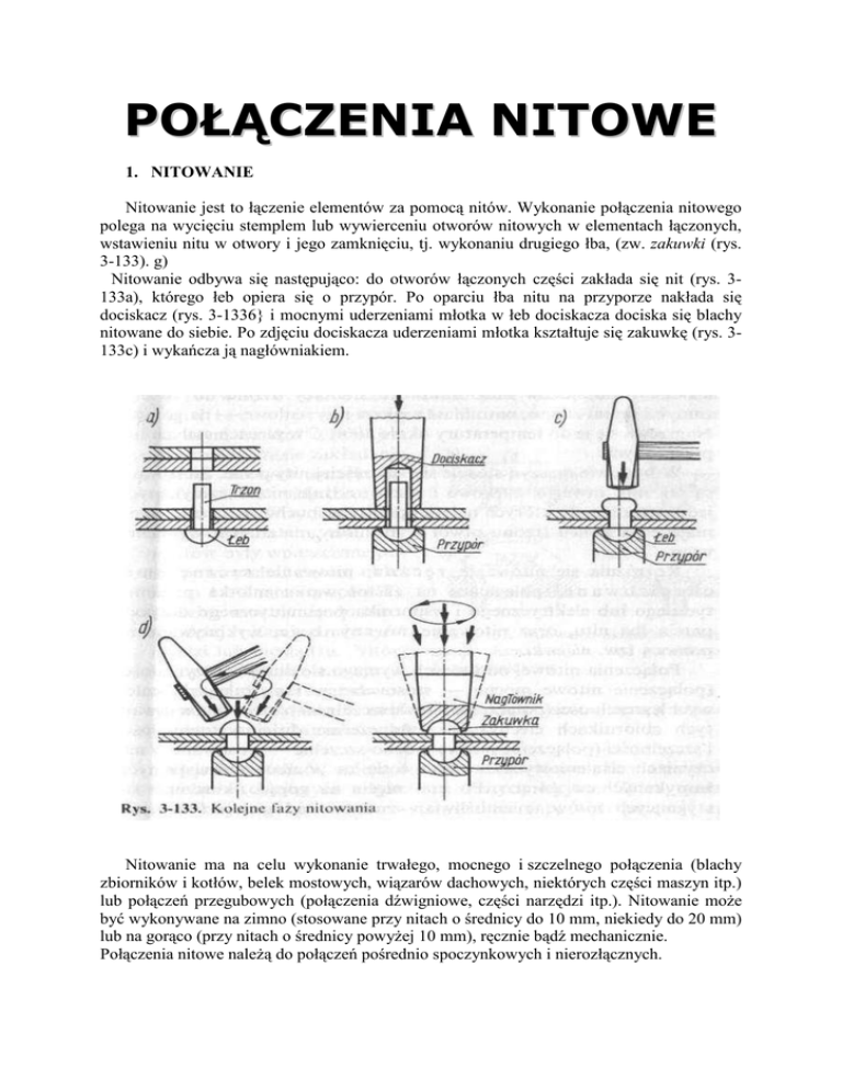POŁĄCZENIA NITOWE 1. NITOWANIE Nitowanie jest to łączenie elementów za pomocą nitów. Wykonanie połączenia nitowego polega na wycięciu stemplem lub wywierceniu otworów nitowych w elementach łączonych, wstawieniu nitu w otwory i jego zamknięciu, tj. wykonaniu drugiego łba, (zw. zakuwki (rys. 3-133). g) Nitowanie odbywa się następująco: do otworów łączonych części zakłada się nit (rys. 3133a), którego łeb opiera się o przypór. Po oparciu łba nitu na przyporze nakłada się dociskacz (rys. 3-1336} i mocnymi uderzeniami młotka w łeb dociskacza dociska się blachy nitowane do siebie. Po zdjęciu dociskacza uderzeniami młotka kształtuje się zakuwkę (rys. 3133c) i wykańcza ją nagłówniakiem. Nitowanie ma na celu wykonanie trwałego, mocnego i szczelnego połączenia (blachy zbiorników i kotłów, belek mostowych, wiązarów dachowych, niektórych części maszyn itp.) lub połączeń przegubowych (połączenia dźwigniowe, części narzędzi itp.). Nitowanie moŜe być wykonywane na zimno (stosowane przy nitach o średnicy do 10 mm, niekiedy do 20 mm) lub na gorąco (przy nitach o średnicy powyŜej 10 mm), ręcznie bądź mechanicznie. Połączenia nitowe naleŜą do połączeń pośrednio spoczynkowych i nierozłącznych. 2. WADY I ZALETY Złącze nitowe odznacza się wysokim napięciem wstępnym, znaczną podatnością i stosunkowo niską temperaturą procesu technologicznego. W połączeniu tym nie występują napręŜenia własne, co umoŜliwia łączenie róŜnych materiałów. Do wad zalicza się jego nierozłączność, osłabienie łączonych elementów przez wiercenie otworu, trudności konstrukcyjne, trudności z uzyskaniem szczelności oraz pracochłonność. 3. NIT Element konstrukcyjny stosowany do tworzenia połączeń nierozłącznych (nitowanie). Nit składa się z walcowego sworznia zwanego trzonem oraz łba stanowiącego z trzonem jedną całość. 4. RODZAJE NITÓW RozróŜnia się nity: pełne, drąŜone, rurkowe i specjalne - o róŜnych kształtach. Nity pełne: - ze łbem kulistym - ze łbem stoŜkowym - ze łbem grzybkowym Nity drąŜone: - ze łbem stoŜkowym - ze łbem walcowym Nity rurkowe: - ze łbem płaskim Nity zrywalne: - aluminiowe, stalowe, miedziane, kwasoodporne Nity specjalne: - nitokołki ze łbem kulistym - nitokołki i nitonakrętki 5. NARZĘDZIA DO NITOWANIA - procesu nitowania - zagławiacz – słuŜy do kształtowania łba nita - dociągacz – słuŜy do dociągnięcia nita - narzędzia podstawowe np. młotek itp. - nitownice Rodzaje nitownic: Nitownice ręczne - mogą pracować w dowolnym połoŜeniu i słuŜą do wykonywania połączeń nitowych w konstrukcjach przestrzennych takich jak stelaŜe, osłony, obudowy. Nitownice pneumatyczne - są efektywnym rozwiązaniem dla punktu obsługi np. okładzin hamulcowych. Są stosowana tam gdzie potrzebne jest jakościowe, estetyczne i szybkie nitowanie okładzin hamulcowych, tarcz sprzęgieł a nawet małe dociski sprzęgłowe.