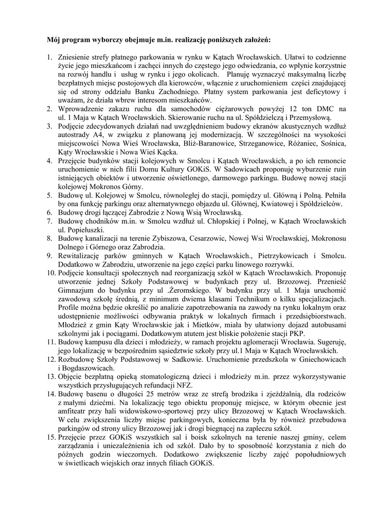 Mój program wyborczy obejmuje m.in. realizację poniższych założeń: 1. Zniesienie strefy płatnego parkowania w rynku w Kątach Wrocławskich. Ułatwi to codzienne życie jego mieszkańcom i zachęci innych do częstego jego odwiedzania, co wpłynie korzystnie na rozwój handlu i usług w rynku i jego okolicach. Planuję wyznaczyć maksymalną liczbę bezpłatnych miejsc postojowych dla kierowców, włącznie z uruchomieniem części znajdującej się od strony oddziału Banku Zachodniego. Płatny system parkowania jest deficytowy i uważam, że działa wbrew interesom mieszkańców. 2. Wprowadzenie zakazu ruchu dla samochodów ciężarowych powyżej 12 ton DMC na ul. 1 Maja w Kątach Wrocławskich. Skierowanie ruchu na ul. Spółdzielczą i Przemysłową. 3. Podjęcie zdecydowanych działań nad uwzględnieniem budowy ekranów akustycznych wzdłuż autostrady A4, w związku z planowaną jej modernizacją. W szczególności na wysokości miejscowości Nowa Wieś Wrocławska, Bliż-Baranowice, Strzeganowice, Różaniec, Sośnica, Kąty Wrocławskie i Nowa Wieś Kącka. 4. Przejęcie budynków stacji kolejowych w Smolcu i Kątach Wrocławskich, a po ich remoncie uruchomienie w nich filii Domu Kultury GOKiS. W Sadowicach proponuję wyburzenie ruin istniejących obiektów i utworzenie oświetlonego, darmowego parkingu. Budowę nowej stacji kolejowej Mokronos Górny. 5. Budowę ul. Kolejowej w Smolcu, równoległej do stacji, pomiędzy ul. Główną i Polną. Pełniła by ona funkcję parkingu oraz alternatywnego objazdu ul. Głównej, Kwiatowej i Spółdzielców. 6. Budowę drogi łączącej Zabrodzie z Nową Wsią Wrocławską. 7. Budowę chodników m.in. w Smolcu wzdłuż ul. Chłopskiej i Polnej, w Kątach Wrocławskich ul. Popiełuszki. 8. Budowę kanalizacji na terenie Zybiszowa, Cesarzowic, Nowej Wsi Wrocławskiej, Mokronosu Dolnego i Górnego oraz Zabrodzia. 9. Rewitalizację parków gminnych w Kątach Wrocławskich., Pietrzykowicach i Smolcu. Dodatkowo w Zabrodziu, utworzenie na jego części parku linowego rozrywki. 10. Podjęcie konsultacji społecznych nad reorganizacją szkół w Kątach Wrocławskich. Proponuję utworzenie jednej Szkoły Podstawowej w budynkach przy ul. Brzozowej. Przenieść Gimnazjum do budynku przy ul .Żeromskiego. W budynku przy ul. 1 Maja uruchomić zawodową szkołę średnią, z minimum dwiema klasami Technikum o kilku specjalizacjach. Profile można będzie określić po analizie zapotrzebowania na zawody na rynku lokalnym oraz udostępnienie możliwości odbywania praktyk w lokalnych firmach i przedsiębiorstwach. Młodzież z gmin Kąty Wrocławskie jak i Mietków, miała by ułatwiony dojazd autobusami szkolnymi jak i pociągami. Dodatkowym atutem jest bliskie położenie stacji PKP. 11. Budowę kampusu dla dzieci i młodzieży, w ramach projektu aglomeracji Wrocławia. Sugeruję, jego lokalizację w bezpośrednim sąsiedztwie szkoły przy ul.1 Maja w Kątach Wrocławskich. 12. Rozbudowę Szkoły Podstawowej w Sadkowie. Uruchomienie przedszkola w Gniechowicach i Bogdaszowicach. 13. Objęcie bezpłatną opieką stomatologiczną dzieci i młodzieży m.in. przez wykorzystywanie wszystkich przysługujących refundacji NFZ. 14. Budowę basenu o długości 25 metrów wraz ze strefą brodzika i zjeżdżalnią, dla rodziców z małymi dziećmi. Na lokalizację tego obiektu proponuję miejsce, w którym obecnie jest amfiteatr przy hali widowiskowo-sportowej przy ulicy Brzozowej w Kątach Wrocławskich. W celu zwiększenia liczby miejsc parkingowych, konieczna była by również przebudowa parkingów od strony ulicy Brzozowej jak i drogi biegnącej na zapleczu szkół. 15. Przejęcie przez GOKiS wszystkich sal i boisk szkolnych na terenie naszej gminy, celem zarządzania i uniezależnienia ich od szkół. Dało by to sposobność korzystania z nich do późnych godzin wieczornych. Dodatkowo zwiększenie liczby zajęć popołudniowych w świetlicach wiejskich oraz innych filiach GOKiS. 16. Utworzenie programu Gminnej Akademii Piłki Nożnej dla wszystkich dzieci od 4 do 19 roku życia, polegającego na finansowaniu i koordynowaniu szkolenia dzieci na terenie naszej gminy. Oparty byłby on na programie Akademii Młodych Orłów PZPN. 17. Rozwijanie i finansowanie pozostałych sekcji sportowych na terenie gminy, z położeniem akcentu na szkolenie dzieci i młodzieży. 18. Budowę 2 boisk ze sztuczną nawierzchnią i oświetleniem: w Smolcu przy ul. Kościelnej, na nie użytkowanym obecnie terenie gminnym (za trybunami) oraz pełnowymiarowego w Kątach Wrocławskich. 19. Rozbudowę komunikacji publicznej, a także uruchomienie darmowej komunikacji busów, dowożących dzieci i młodzież na popołudniowe zajęcia sportowe i inne kulturalno oświatowe. 20. Monitoringu obiektów gminnych tj. szkół, dworców i parkingów przylegających, obiektów sportowych oraz innych miejsc publicznych.