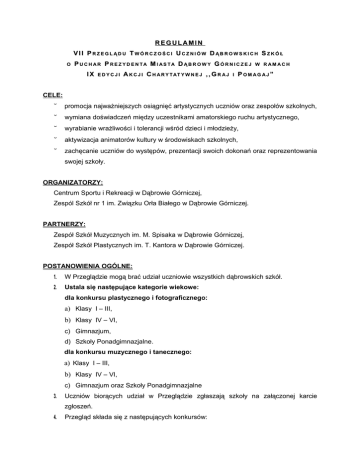 REGULAMIN VII PRZEGL ĄDU TWÓRCZOŚCI UCZNIÓW DĄBROWSKICH SZKÓŁ O P U C H AR P R E Z Y D E N TA M I AS TA D ĄB R O W Y G Ó R N I C Z E J IX EDYCJI A K C J I C H A R Y T AT Y W N E J , , G R A J I W R AM ACH POM AG AJ ” CELE: promocja najważniejszych osiągnięć artystycznych uczniów oraz zespołów szkolnych, wymiana doświadczeń między uczestnikami amatorskiego ruchu artystycznego, wyrabianie wrażliwości i tolerancji wśród dzieci i młodzieży, aktywizacja animatorów kultury w środowiskach szkolnych, zachęcanie uczniów do występów, prezentacji swoich dokonań oraz reprezentowania swojej szkoły. ORGANIZATORZY: Centrum Sportu i Rekreacji w Dąbrowie Górniczej, Zespól Szkół nr 1 im. Związku Orła Białego w Dąbrowie Górniczej. PARTNERZY: Zespół Szkół Muzycznych im. M. Spisaka w Dąbrowie Górniczej, Zespół Szkół Plastycznych im. T. Kantora w Dąbrowie Górniczej. POSTANOWIENIA OGÓLNE: 1. W Przeglądzie mogą brać udział uczniowie wszystkich dąbrowskich szkół. 2. Ustala się następujące kategorie wiekowe: dla konkursu plastycznego i fotograficznego: a) Klasy I – III, b) Klasy IV – VI, c) Gimnazjum, d) Szkoły Ponadgimnazjalne. dla konkursu muzycznego i tanecznego: a) Klasy I – III, b) Klasy IV – VI, c) Gimnazjum oraz Szkoły Ponadgimnazjalne 3. Uczniów biorących udział w Przeglądzie zgłaszają szkoły na załączonej karcie zgłoszeń. 4. Przegląd składa się z następujących konkursów: 5. fotograficzny, muzyczny, taneczny, plastyczny. Zgłoszenia w konkursach: muzycznym, tanecznym, fotograficznym, plastycznym przyjmowane są do 06.11.2015 R. (piątek) 6. ZGŁOSZENIA PO TERMINIE NIE BĘDĄ BRANE 7. Karty zgłoszeń w konkursach: POD UWAGĘ. TANECZNYM , MUZYCZNYM ORAZ FOTOGRAFICZNYM dostarczyć do CENTRUM SPORTU I REKREACJI W DĄBROWIE GÓRNICZEJ M. KONOPNICKIEJ 29 (DZIAŁ SPORTU) tel./fax. 32 W konkursie PLASTYCZNYM SZKÓŁ PLASTYCZNYCH 8. IM. należy PRZY UL. 261 20 10, [email protected]. zgłoszenia wraz z pracą należy dostarczyć do ZESPOŁU T. KANTORA PRZY UL. KOSMONAUTÓW 8. Przesłuchania konkursowe w kategorii: - KONKURS FOTOGRAFICZNY – wyniki zostaną ogłoszone na stronie internetowej www.csir.pl do dnia 24.11.2015 R. - KONKURS TANECZNY NR - odbędzie się 20.11.2015 R. o godz. 11:00 w ZESPOLE SZKÓŁ 1 PRZY UL. KONOPNICKIEJ 56. KONKURS PLASTYCZNY odbędzie się 23.11.2015 R. o godz. 11:30 w ZESPOLE SZKÓŁ PLASTYCZNYCH IM. T. KANTORA PRZY UL. KOSMONAUTÓW 8. - KONKURS MUZYCZNY odbędzie się 18.11.2015 R. w ZESPOLE SZKÓŁ MUZYCZNYCH IM. MICHAŁA SPISAKA PRZY UL. DĄBSKIEGO 17. 9. Finał Przeglądu oraz uroczyste wręczenie nagród odbędzie się w URZĘDZIE MIEJSKIM W DĄBROWIE GÓRNICZEJ w sali sesyjnej w dniu 30.11.2015R. o godz. 13:00. 10. Organizator zastrzega sobie prawo do zmian w regulaminie. KONKURS FOTOGRAFICZNY ZASADY - UDZIAŁU W KONKURSIE: konkurs odbywa się pod hasłem: ,,OCALIĆ Z HISTORIĄ OD ZAPOMNIENIA” (MIEJSCA ZWIĄZANE DĄBROWY GÓRNICZEJ) - dopuszcza się tylko prace wykonane osobiście przez uczestnika konkursu, - do konkursu można zgłaszać fotografie wykonane metodą tradycyjną lub cyfrową, - każda szkoła może zgłosić nieograniczoną liczbę uczestników, - jedna osoba może zgłosić do konkursu tylko jedną pracę, - prace w formie odbitek fotograficznych w formacie 20 x 30 cm należy złożyć w siedzibie CENTRUM SPORTU I REKREACJI PRZY UL. KONOPNICKIEJ 29, W DZIALE SPORTU od poniedziałku do piątku w godz. 7.30 - 15.30 do dnia 20.11.2015r. PO TYM TERMINIE PRACE NIE BĘDĄ PRZYJMOWANE , - Wyniki konkursu fotograficznego zostaną ogłoszone w dniu 24.11.2015r. - do każdej odbitki należy dołączyć oryginał zdjęcia w formie cyfrowej i pełnej rozdzielczości, - dopuszczalny format pliku: JPG, - każda praca powinna być podpisana na odwrocie; należy podać: tytuł pracy, imię, nazwisko i wiek autora, klasę, adres zamieszkania, nazwę i numer szkoły jaką reprezentuje, - nie dopuszcza się do konkursu wydruków komputerowych oraz fotografii, w których dokonano ingerencji komputerowej ( np. fotomontaż, zmiana kolorów, retusz, itp.), - uczestnik oświadcza, że jest autorem nadesłanej pracy oraz, że posiada do niej pełne prawa autorskie, - składając pracę do konkursu fotograficznego uczestnik wyraża zgodę na przetwarzanie i publikację fotografii na stronach internetowych Centrum Sportu i Rekreacji oraz w innych mediach w związku z relacją z organizowanego przeglądu i jego wyników, - składając pracę do konkursu fotograficznego uczestnik wyraża zgodę na prezentację jego pracy na wystawie oraz na sprzedaż jego pracy na aukcji charytatywnej podczas IX EDYCJI AKCJI „GRAJ I POMAGAJ” w dniu 06.12.2015 R. organizowanej przez Centrum Sportu i Rekreacji. - KRYTERIA OCENY: dobór tematu, ogólny wyraz artystyczny, znajomość zasad kompozycji, oryginalne potraktowanie tematu, jakość techniczna fotografii. KONKURS MUZYCZNY KATEGORIE MUZYCZNE: 1. SOLIŚCI WOKALIŚCI, 2. SOLIŚCI INSTRUMENTALIŚCI, 3. ZESPOŁY WOKALNO – INSTRUMENTALNE KATEGORIE WIEKOWE: a) Klasy I – III, b) Klasy IV – VI, c) Gimnazja i Szkoły Ponadgimnazjalne. ZASADY UDZIAŁU W KONKURSIE: każdy wykonawca prezentuje 1 utwór o dowolnej tematyce, dopuszcza się korzystanie z podkładów muzycznych tylko na płytach CD Audio (podkłady w innych formatach np.: MP3 i MP4 nie będą przyjmowane), każda szkoła może zgłosić w danej kategorii muzycznej (tj. soliści wokaliści, soliści instrumentaliści) 2 uczestników i 1 zespół (łącznie każda szkoła może wysłać maksymalnie 5 zgłoszeń), uczestnik może zgłosić się tylko do jednej kategorii, uczestnik powinien wykonywać utwory adekwatne do swojego wieku. KRYTERIA OCENY: ogólny wyraz artystyczny (dobór stroju do repertuaru), strój estetyczny będzie dodatkowo punktowany, wykonanie, dobór repertuaru, interpretacja, dykcja, aranżacje. UWAGI: dopuszcza się prezentacje solistów z towarzyszeniem zespołu, dopuszcza s