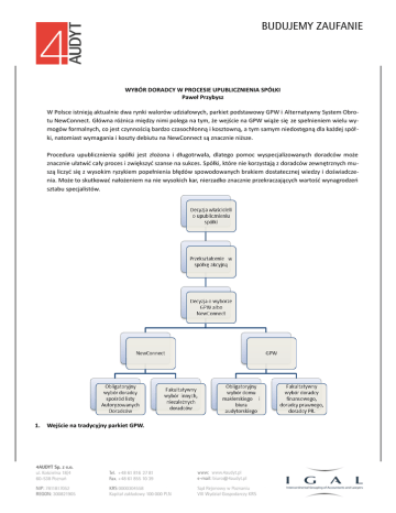 WYBÓR DORADCY W PROCESIE UPUBLICZNIENIA SPÓŁKI Paweł Przybysz W Polsce istnieją aktualnie dwa rynki walorów udziałowych, parkiet podstawowy GPW i Alternatywny System Obrotu NewConnect. Główna różnica między nimi polega na tym, że wejście na GPW wiąże się ze spełnieniem wielu wymogów formalnych, co jest czynnością bardzo czasochłonną i kosztowną, a tym samym niedostępną dla każdej spółki, natomiast wymagania i koszty debiutu na NewConnect są znacznie niższe. Procedura upublicznienia spółki jest złożona i długotrwała, dlatego pomoc wyspecjalizowanych doradców może znacznie ułatwić cały proces i zwiększyć szanse na sukces. Spółki, które nie korzystają z doradców zewnętrznych muszą liczyć się z wysokim ryzykiem popełnienia błędów spowodowanych brakiem dostatecznej wiedzy i doświadczenia. Może to skutkować nałożeniem na nie wysokich kar, nierzadko znacznie przekraczających wartość wynagrodzeń sztabu specjalistów. 1. Wejście na tradycyjny parkiet GPW. Nie jest wymagane przez przepisy prawne, regulujące funkcjonowanie rynku kapitałowego, korzystanie z usług doradcy finansowego, prawnego i public relations. Pomimo tego, większość spółek decyduje się na podjęcie z nimi współpracy ze względu na ich kompetencje i doświadczenie. Spółka jest natomiast zobligowana do skorzystania z usług dwóch partnerów: domu maklerskiego oraz biura audy torskiego, prowadzących działalność profesjonalną na podstawie odrębnych przepisów szczególnych. Najczęstsze zadania firmy inwestycyjnej (biura maklerskiego): sporządzenie prospektu emisyjnego zgodnie z przepisami prawa i zwyczajami rynkowymi, zarządzanie całym projektem oferty publicznej, zapewnianie bezpieczeństwa przy opłacaniu zapisów i obejmowaniu akcji przez inwestorów, prowadzenie rejestru nabywców papierów wartościowych, przygotowywanie dokumentacji na potrzeby dematerializacji akcji w KDPW, usługi dodatkowe (organizowanie spotkań z inwestorami (roadshow), sporządzanie raportów analitycznych firmy, szkolenia dla zarządu, pomoc w wyborze agencji PR). Najczęstsze zadania biura audytorskiego: pomoc i doradztwo przy sporządzaniu sprawozdania finansowego, przygotowywanie finansowej części dokumentacji ofertowej, wydanie odpowiedniego oświadczenia audytorskiego, weryfikacja danych finansowych w dokumentacji ofertowej, kontrola nad aspektami finansowymi i księgowymi analizy due diligence, usługi doradztwa finansowego (wycena akcji, doradztwo podatkowe, pomoc w zastosowaniu MSSF, doradztwo w bieżących kontaktach z KNF). W 2006 roku Giełda Papierów Wartościowych w Warszawie wprowadziła dwa Programy: Firm Partnerskich GPW dla MSP oraz Giełdowych Firm Partnerskich - Liderów Rynku Pierwotnego. Zostały one uruchomione, by ułatwić spółkom znalezienie odpowiednich partnerów, którzy wspomogą te firmy w drodze na Giełdę. Spółki mają do wyboru Firmy Partnerskie zgrupowane w 4 kategoriach: Biura Maklerskie, Biegli Rewidenci, Doradcy Prawni oraz Doradcy Fi- nansowi. Są to podmioty, które charakteryzują się dużym doświadczeniem w procesie IPO (pierwszej oferty publicznej) i które uzyskały akredytację GPW. Przy wyborze domu maklerskiego należy zwrócić uwagę na: posiadany udział w obrocie akcjami oraz popularność wśród klientów indywidualnych i instytucjonalnych, stopień rozbudowania sieci sprzedaży, możliwość składania zapisów na akcje przez Internet, jakość analiz i rekomendacji wydanych przez biuro maklerskie, zaufanie klientów do tej instytucji oraz profesjonalizm jej pracowników, szybkość obsługi, dostęp do najświeższych informacji o spółkach, szkolenia, akcje informacyjne i edukacyjne prowadzone przez biuro, elastyczność, indywidualne podejście dla klienta, ofertę biura i komplementarność usług, oferowane warunki kredytowania przy zakupie akcji, rankingi, np. Ranking Biur Maklerskich publikowany przez magazyn FORBES lub przez Stowarzyszenie Inwestorów Indywidualnych. Przy wyborze biura audytorskiego należy zwrócić uwagę na: kompetencje i renomę firmy audytorskiej, 2. doświadczenie audytora związane z IPO, znajomość danej branży, rankingi, np. Ranking Audytorów dzienników Rzeczpospolita lub Parkiet, opinie innych spółek współpracujących z daną firmą, ofertę firmy i komplementarność usług. Wejście na Alternatywny System Obrotu NewConnect. Spółka, która zamierza wejść na NewConnect jest zobligowana do wyboru doradcy, który poprowadzi ją przez ten proces. Jednak jej wybór jest ograniczony tylko do podmiotów wpisanych na listę Autoryzowanych Doradców (tj. podmiotów, które uzyskały akredytację Giełdy Papierów Wartościowych po spełnieniu szeregu wymogów z tym związanych; do najważniejszych kryteriów należą: zatrudnienie co najmniej dwóch osób posiadających Certyfikat Doradcy w Alternatywnym Systemie Obrotu oraz przedłożenie szczegółowych dokumentów dotyczących działalności podmiotu ubiegającego się o wpis na listę). Na koniec lipca 2011 na ww. listę wpisanych było 96 podmiotów. Decyzja dotycząca wyboru Autoryzowanego Doradcy jest sprawą niezwykle istotną, gdyż od jego zaangażowania, wiedzy, umiejętności i doświadczenia w dużej mierze zależy sukces debiutanta. Pierwszorzędną rolą Autoryzowanego Doradcy jest przegląd długoterminowej strategii Spółki uwzględniającej wejście na rynek NewConnect oraz ocena potencjalnej efektywności tego działania. Jednym z zadań spółki debiutującej na rynku nieregulowanym jest sporządzenie dokumentu informacyjnego. Zazwyczaj jest on tworzony przez Autoryzowanego Doradcę, jeśli jednak spółka podejmie się samodzielnej realizacji tego zadania, Doradca sprawdza jego zgodność z regulaminem Alternatywnego Systemu Obrotu, a następnie zatwierdza dokument i oświadcza, że zgodnie z jego wiedzą informacje i dane liczbowe w nim zawarte potwierdzają stan faktyczny. Autoryzowany Dorad