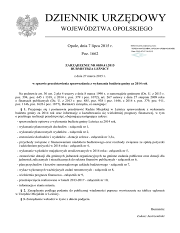 DZIENNIK URZĘDOWY WOJEWÓDZTWA OPOLSKIEGO Opole, dnia 7 lipca 2015 r. Elektronicznie podpisany przez: TERESA MATCZYŃSKA; OPOLSKI URZĄD WOJEWÓDZKI Poz. 1662 Data: 2015-07-07 14:02:12 ZARZĄDZENIE NR 0050.41.2015 BURMISTRZA LEŚNICY z dnia 27 marca 2015 r. w sprawie przedstawienia sprawozdania z wykonania budżetu gminy za 2014 rok Na podstawie art. 30 ust. 2 pkt 4 ustawy z dnia 8 marca 1990 r. o samorządzie gminnym (Dz. U. z 2013 r. poz. 594, poz. 645 i 1318, z 2014 r. poz. 379 i poz. 1072), art. 267 ustawy z dnia 27 sierpnia 2009 roku o finansach publicznych (Dz. U. z 2013 r. poz. 885, poz. 938 i poz. 1646, z 2014 r. poz. 379, poz. 911, poz. 1146, poz. 1626 i poz. 1877), Burmistrz zarządza, co następuje: § 1. Przyjmuje się i postanawia przedstawić Radzie Miejskiej w Leśnicy sprawozdanie z wykonania budżetu gminy za 2014 rok oraz informację o kształtowaniu się wieloletniej prognozy finansowej, w tym o przebiegu realizacji przedsięwzięć, obejmującą następujący zakres: - sprawozdanie opisowe z wykonania budżetu gminy Leśnica za 2014 rok, - wykonanie planowanych dochodów - załącznik nr 1, - wykonanie planowanych wydatków - załącznik nr 2, - zestawienie dochodów i wydatków - dotacje celowe - załącznik nr 3,3a, - przychody związane z finansowaniem niedoboru budżetowego oraz rozchody związane ze spłatą pożyczki i udzieleniem pożyczki w 2014 roku - załącznik nr 4, - wykonanie wydatków majątkowych zrealizowanych w 2014 roku - załącznik nr 5, - zestawienie dotacji dla gminnych jednostek organizacyjnych na gminne zadania publiczne oraz dotacji dla jednostek zaliczanych i niezaliczanych do sektora finansów publicznych - załącznik nr 6, - plan przychodów i kosztów samorządowego zakładu budżetowego - załącznik nr 7, - wykaz wykonanych ważniejszych zadań remontowych - załącznik nr 8, - wieloletnia prognoza finansowa - załącznik nr 9, - przedsięwzięcia realizowane w latach 2013-2017 - załącznik nr 10, - informacja o stanie mienia. § 2. Zarządzenie podlega podaniu do publicznej wiadomości poprzez wywieszenie na tablicy ogłoszeń w Urzędzie Miejskim w Leśnicy. § 3. Zarządzenie wchodzi w życie z dniem podjęcia. Burmistrz Łukasz Jastrzembski Dziennik Urzędowy Województwa Opolskiego –2– Poz. 1662 Załącznik do zarządzenia nr 0050.41.2015 Burmistrza Leśnicy z dnia 27 marca 2015 r. Sprawozdanie z wykonania budżetu gminy Leśnica za 2014 rok Realizując ustawowy obowiązek, wynikający z ustawy o finansach publicznych oraz postanowień uchwały Nr XL/198/13 z dnia 30 grudnia 2013 r. w sprawie uchwały budżetowej gminy na 2014 rok, przedstawia się poniżej sprawozdanie z wykonania tego budżetu. ZMIANY DOKONANE W BUDŻECIE UCHWALONYM Wielkość budżetu uchwalonego na 2014 rok zamykała się: - po stronie dochodów kwotą 25.226.253,-zł - po stronie przychodów kwotę 3.495.356,-zł - po stronie wydatków kwotą 27.921.609,-zł - po stronie rozchodów kwotą 800.000,-zł W 2014 roku Rada Miejska podjęła dwanaście uchwał zmieniających budżet gminy. Zarządzeniem Burmistrza wprowadzono siedemnaście zmian budżetu gminy i jedenaście zmian w budżecie gminy. Zmiany w planie wydatków polegały na dokonaniu przeniesień w dziale pomiędzy rozdziałami i paragrafami w zakresie wydatków bieżących i majątkowych, w celu urealnienia planu. Skala tych zmian przedstawia się następująco: - uchwałami Rady Miejskiej i zarządzeniami Burmistrza zwiększono dochody o kwotę 733.423,76 zł, przychody zwiększono o kwotę 1.366.870,00 zł, wydatki zwiększono o kwotę 1.998.423,76 zł i rozchody o kwotę 101.870,00 zł. Przychody zwiększono o: - nadwyżkę z lat ubiegłych Rozchody zwiększono o: - pożyczki udzielone - została udzielona pożyczka dla Leśnickiego Ośrodka Kultury i Rekreacji w Leśnicy +1.366.870,00 zł 101.870,00 zł Źródłem zmian i dodatkowych dochodów były: 1. Podatek dochodowy od osób prawnych (§ 0020) +7.000.00 zł z tego: - podatek dochodowy od osób prawnych +7.000,00 zł (dział 756) 2. Podatek od działalności gospodarczej +10.000.00 zł osób fizycznych, opłacany w formie karty podatkowej (§ 0350) z tego: - podatek od działalności gospodarczej +10.000,00 zł (dział 756) 3. Podatek od spadków i darowizn (§ 0360) +35.000,00 zł z tego: - podatek od spadków i darowizn +35.000,00 zł (dział 756) 4. Opłata od posiadania psów (§ 0370) -1.700,00 zł z tego: - opłata od posiadania psów -1.700,00 zł (dział 756) 5. Wpływy z innych lokalnych opłat pobieranych +827,00 zł przez jednostki samorządu terytorialnego na podstawie odrębnych ustaw (§ 0490) z tego: - opłata za korzystanie z przystanków autobusowych +827,00 zł (dział 600) Dziennik Urzędowy Województwa Opolskiego –3– 6. Podatek od czynności cywilnoprawnych (§ 0500) +40.000,00 zł z tego: - od osób prawnych +40.000,00 zł (dział 756) 7. Grzywny, mandaty i inne kary od osób +40,00 zł fizycznych (§ 0570) z tego: - odszkodowanie za bezumowne użytkowanie +40,00 zł (dział 700) działki 8. Grzywny i inne kary pieniężne od osób prawnych +4.000,00 zł i innych jednostek organizacyjnych (§ 0580) z tego: - kara umowna +4.000,00 zł (dział 600) 9. Wpływy z różnych opłat (§ 0690) -91.836.00 zł z tego: - odpłatność rodzin za pobyt mieszkańców gminy +9.164,00 zł (dział 852) umieszczonych w domu pomocy społecznej - wpływy z tytułu opłat i kar -101.000,00 zł (dział 900) 10. Wpływy z tytułu przekształcenia prawa +22.850.00 zł użytkowania wieczystego przysługującego osobom fizycznym w prawo własności (§ 0760) z tego: - wpływy z tytułu przekształcenia prawa +22.850,00 zł (dział 700) użytkowania wieczystego 11. Wpływy z usług (§ 0830) +325.-zł z tego: - wykonanie kserokopii dokumentacji na budowę +325,00 zł (dział 921) przyłącza do projektowania złącza kablowopomiarowego do Klubu w Łąkach Kozielskich 12. Odsetki od nieterminowych wpłat z tytułu podatków +28.000,00 zł 