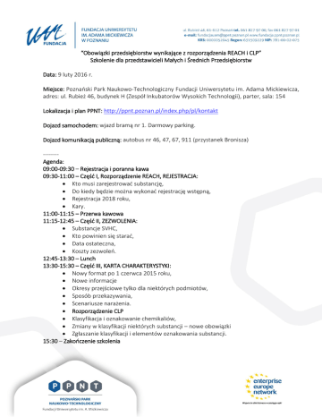 “Obowiązki przedsiębiorstw wynikające z rozporządzenia REACH i CLP” Szkolenie dla przedstawicieli Małych i Średnich Przedsiębiorstw Data: 9 luty 2016 r. Miejsce: Poznański Park Naukowo-Technologiczny Fundacji Uniwersytetu im. Adama Mickiewicza, adres: ul. Rubież 46, budynek H (Zespół Inkubatorów Wysokich Technologii), parter, sala: 154 Lokalizacja i plan PPNT: http://ppnt.poznan.pl/index.php/pl/kontakt Dojazd samochodem: wjazd bramą nr 1. Darmowy parking. Dojazd komunikacją publiczną: autobus nr 46, 47, 67, 911 (przystanek Bronisza) -------Agenda: 09:00-09:30 – Rejestracja i poranna kawa 09:30-11:00 – Część I, Rozporządzenie REACH, REJESTRACJA: Kto musi zarejestrować substancję, Do kiedy będzie można wykonać rejestrację wstępną, Rejestracja 2018 roku, Kary. 11:00-11:15 – Przerwa kawowa 11:15-12:45 – Część II, ZEZWOLENIA: Substancje SVHC, Kto powinien się starać, Data ostateczna, Koszty zezwoleń. 12:45-13:30 – Lunch 13:30-15:30 – Część III, KARTA CHARAKTERYSTYKI: Nowy format po 1 czerwca 2015 roku, Nowe informacje Okresy przejściowe tylko dla niektórych podmiotów, Sposób przekazywania, Scenariusze narażenia. Rozporządzenie CLP Klasyfikacja i oznakowanie chemikaliów, Zmiany w klasyfikacji niektórych substancji – nowe obowiązki Zgłaszanie klasyfikacji i elementów oznakowania substancji. 15:30 – Zakończenie szkolenia Rejestracja do 3.02.2016: http://goo.gl/N9LWUM Pytania: Grzegorz Cieśla; [email protected]; 61 827 97 46 Agata Wylegała: [email protected]; 61 827 97 71 Uwaga: Liczba miejsc jest ograniczona do 50 uczestników. Szkolenie “Obowiązki przedsiębiorstw wynikające z rozporządzenia REACH i CLP” - jest współfinansowane ze środków Enterprise Europe Network”: http://een.ec.europa.eu/. Cel szkolenia: Uczestnicy zostaną szczegółowo zapoznani z wymogami rozporządzenia REACH i CLP, które dotyczą obowiązkowej rejestracji, oceny, udzielania zezwoleń i stosowania ograniczeń w produkcji, obrocie i stosowaniu chemikaliów. Nowe obowiązki dotyczą wszystkich przedsiębiorstw korzystających z produktów chemicznych (np. przemysł drzewny, hutniczy, papierniczy, szklarski, kosmetyczny, wapienniczy, cementowy, przetwórstwa metali, tworzyw sztucznych. Sylwetka trenera: Monika Wasiak-Gromek, absolwentka Politechniki Łódzkiej, doktor nauk technicznych w dziedzinie chemii, mgr inż. biotechnolog. Ukończyła podyplomowe studia z zakresu rozporządzenia REACH i związanej z nim problematyki, w tym toksykologii, ekotoksykologii i oceny ryzyka prowadzone w Instytucie Medycyny Pracy w Łodzi. Ponadto ukończyła kurs z zakresu toksykologii “Methodology and Principles of Toxicology”, w Centrum Toksykologicznym na Uniwersytecie Surrey w Wielkiej Brytanii, „Health risk assessment I: Principles and applications” Institute of Environmental Medicine, Karolinska Institutet, Sztokholm, Szwecja, „10th Summer School on Toxic Compounds in the Environment”, Uniwersytet Masaryk (organizacja RECETOX), Brno, Republika Czeska oraz inne międzynarodowe kursy z zakresu klasyfikacji i oznakowania chemikaliów, bezpieczeństwa chemicznego, oceny ryzyka i zarządzania ryzykiem w ramach projektów unijnych. Obecnie pełni funkcję naczelnika Wydziału Krajowego Centrum Informacyjnego ds. REACH i CLP w Biurze do Spraw Substancji Chemicznych. Zajmuje się sprawami dotyczącymi rozporządzenia REACH oraz CLP, klasyfikacją i oznakowaniem chemikaliów. Ponadto reprezentuje Krajowe Centrum Informacyjnego ds. REACH i CLP (Polski Helpdesk ds. REACH) w unijnej sieci HELP NET, która działa w ramach ECHA (Europejskiej Agencji Chemikaliów) w Helsinkach . Była członkiem grupy roboczej Komisji Europejskiej w sprawie Klasyfikacji i Oznakowania Niebezpiecznych Substancji w Europejskim Biurze Chemicznym, członkiem Grupy Roboczej dot. Niebezpiecznych Preparatów oraz uczestnikiem spotkań Grupy Roboczej, która stanowi jednostkę pomocniczą dla Komisji Europejskiej w zagadnieniach dotyczących Dyrektywy Preparatowej. Współpracuje z przemysłem w sprawie ustawodawstwa chemicznego głównie klasyfikacji, oznakowania, kart charakterystyki oraz wypełniania wytycznych rozporządzenia REACH i CLP. Jest wykładowcą na studiach podyplomowych z zakresu przepisów rozporządzenia REACH i CLP oraz autorem licznych artykułów związanych z tą tematyką.
