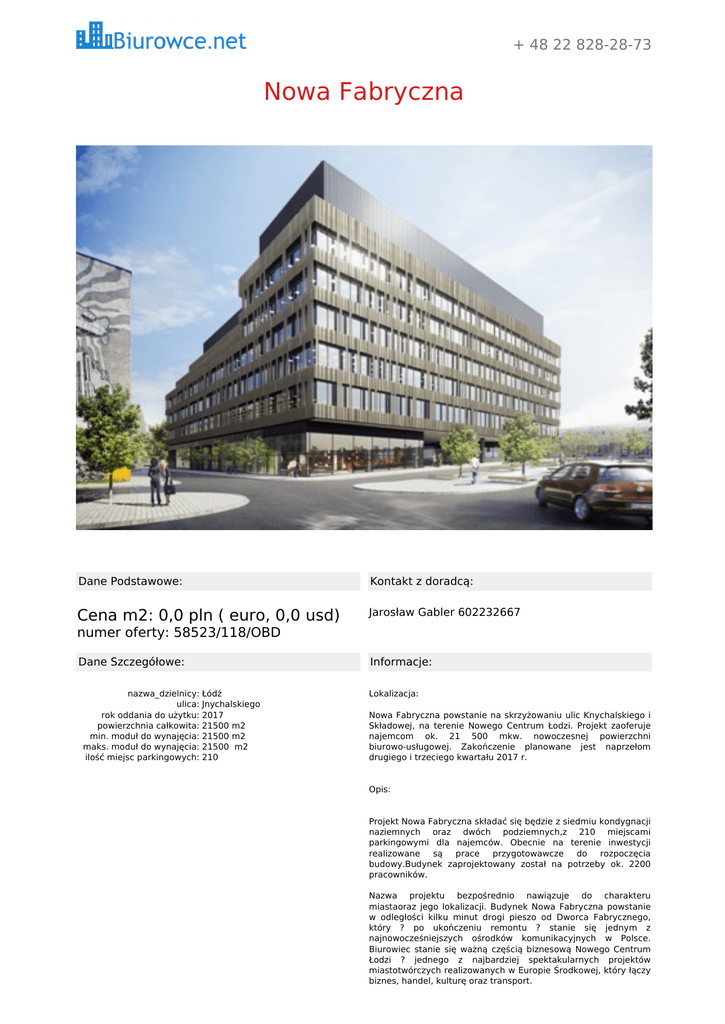 + 48 22 828-28-73 Nowa Fabryczna Dane Podstawowe: Kontakt z doradcą: Cena m2: 0,0 pln ( euro, 0,0 usd) Jarosław Gabler 602232667 numer oferty: 58523/118/OBD Dane Szczegółowe: nazwa_dzielnicy: Łódź ulica: Jnychalskiego rok oddania do użytku: 2017 powierzchnia całkowita: 21500 m2 min. moduł do wynajęcia: 21500 m2 maks. moduł do wynajęcia: 21500 m2 ilość miejsc parkingowych: 210 Informacje: Lokalizacja: Nowa Fabryczna powstanie na skrzyżowaniu ulic Knychalskiego i Składowej, na terenie Nowego Centrum Łodzi. Projekt zaoferuje najemcom ok. 21 500 mkw. nowoczesnej powierzchni biurowo-usługowej. Zakończenie planowane jest naprzełom drugiego i trzeciego kwartału 2017 r. Opis: Projekt Nowa Fabryczna składać się będzie z siedmiu kondygnacji naziemnych oraz dwóch podziemnych,z 210 miejscami parkingowymi dla najemców. Obecnie na terenie inwestycji realizowane są prace przygotowawcze do rozpoczęcia budowy.Budynek zaprojektowany został na potrzeby ok. 2200 pracowników. Nazwa projektu bezpośrednio nawiązuje do charakteru miastaoraz jego lokalizacji. Budynek Nowa Fabryczna powstanie w odległości kilku minut drogi pieszo od Dworca Fabrycznego, który ? po ukończeniu remontu ? stanie się jednym z najnowocześniejszych ośrodków komunikacyjnych w Polsce. Biurowiec stanie się ważną częścią biznesową Nowego Centrum Łodzi ? jednego z najbardziej spektakularnych projektów miastotwórczych realizowanych w Europie Środkowej, który łączy biznes, handel, kulturę oraz transport. Budynek Nowa Fabryczna został zaprojektowany w taki sposób, aby z powodzeniem wpisać się w przestrzeń Nowego Centrum Łodzi. W budynku znajdzie się m.in. przestronne, zielone patio z kaskadą schodów, nowoczesna infrastruktura rowerowa, w tym stacje rowerów miejskich, a także loggie umieszczone na każdym z pięter, które zostaną oddane do dyspozycji najemców. Elastyczność i funkcjonalność wzbogacone o oryginalną i niesystemową fasadę, która będzie wyróżniać budynek na tle innych współczesnych kompleksów biurowych. Budynek Nowa Fabryczna zostanie zrealizowany zgodnie z ideą zrównoważonego budownictwa, o czym świadczyć będą rozwiązania zastosowane w budynku. Użytkownicy będą mieli do dyspozycji m.in. nowoczesną infrastrukturę rowerową, w tym punkt roweru miejskiego oraz stacje do ładowania pojazdów elektrycznych. Technologie zastosowane w budynku pozwolą znacząco zmniejszyć zużycie energii oraz wody. Zielony charakter budynku potwierdzi międzynarodowy certyfikat środowiskowy LEED na poziomie Gold. biurowce.net Adres:ul. Konduktorska 4 lok. 30, Warszawa, [email protected]