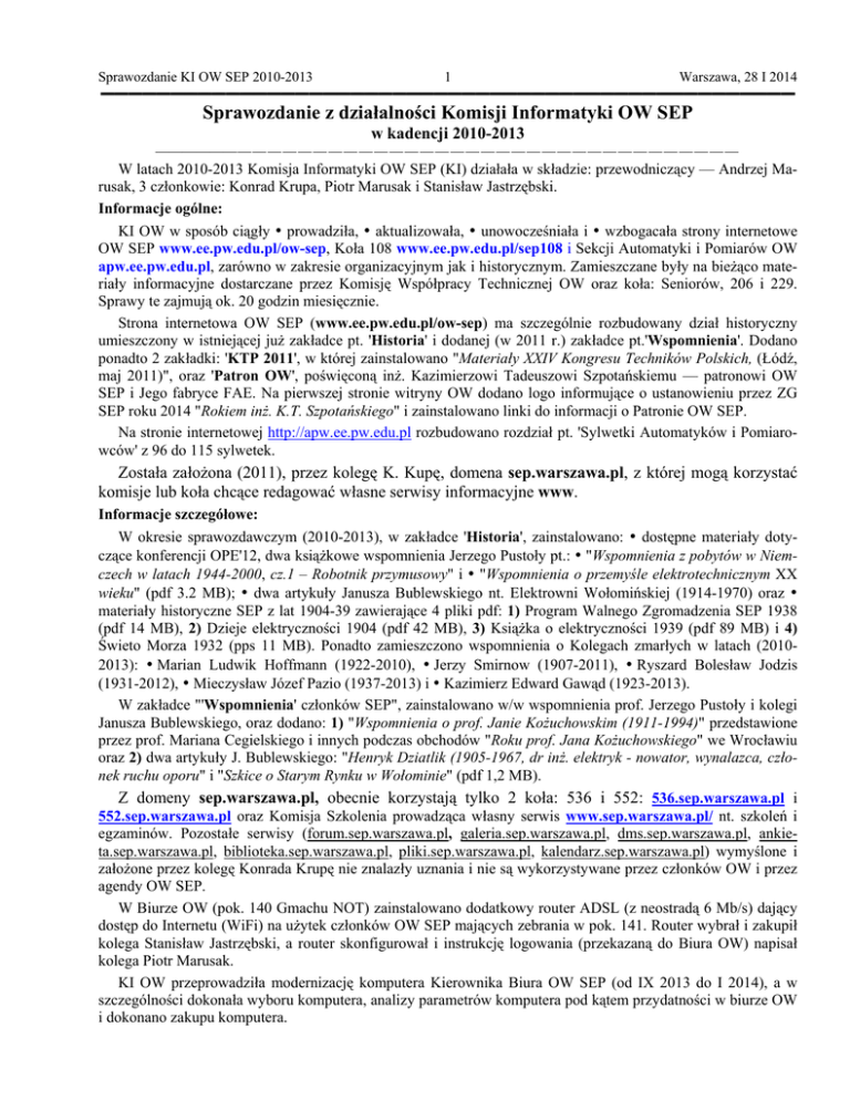 Sprawozdanie KI OW SEP 2010-2013 Warszawa, 28 I 2014 1 ▬▬▬▬▬▬▬▬▬▬▬▬▬▬▬▬▬▬▬▬▬▬▬▬▬▬▬▬▬▬▬▬▬▬▬▬▬▬▬▬▬▬▬▬▬▬▬▬▬▬ Sprawozdanie z działalności Komisji Informatyki OW SEP w kadencji 2010-2013 ————————— — — — — — — — — — — — — — — — — — — — — — — — — — — — — — — W latach 2010-2013 Komisja Informatyki OW SEP (KI) działała w składzie: przewodniczący — Andrzej Marusak, 3 członkowie: Konrad Krupa, Piotr Marusak i Stanisław Jastrzębski. Informacje ogólne: KI OW w sposób ciągły • prowadziła, • aktualizowała, • unowocześniała i • wzbogacała strony internetowe OW SEP www.ee.pw.edu.pl/ow-sep, Koła 108 www.ee.pw.edu.pl/sep108 i Sekcji Automatyki i Pomiarów OW apw.ee.pw.edu.pl, zarówno w zakresie organizacyjnym jak i historycznym. Zamieszczane były na bieżąco materiały informacyjne dostarczane przez Komisję Współpracy Technicznej OW oraz koła: Seniorów, 206 i 229. Sprawy te zajmują ok. 20 godzin miesięcznie. Strona internetowa OW SEP (www.ee.pw.edu.pl/ow-sep) ma szczególnie rozbudowany dział historyczny umieszczony w istniejącej już zakładce pt. 'Historia' i dodanej (w 2011 r.) zakładce pt.'Wspomnienia'. Dodano ponadto 2 zakładki: 'KTP 2011', w której zainstalowano "Materiały XXIV Kongresu Techników Polskich, (Łódź, maj 2011)", oraz 'Patron OW', poświęconą inż. Kazimierzowi Tadeuszowi Szpotańskiemu — patronowi OW SEP i Jego fabryce FAE. Na pierwszej stronie witryny OW dodano logo informujące o ustanowieniu przez ZG SEP roku 2014 "Rokiem inż. K.T. Szpotańskiego" i zainstalowano linki do informacji o Patronie OW SEP. Na stronie internetowej http://apw.ee.pw.edu.pl rozbudowano rozdział pt. 'Sylwetki Automatyków i Pomiarowców' z 96 do 115 sylwetek. Została założona (2011), przez kolegę K. Kupę, domena sep.warszawa.pl, z której mogą korzystać komisje lub koła chcące redagować własne serwisy informacyjne www. Informacje szczegółowe: W okresie sprawozdawczym (2010-2013), w zakładce 'Historia', zainstalowano: • dostępne materiały dotyczące konferencji OPE'12, dwa książkowe wspomnienia Jerzego Pustoły pt.: • "Wspomnienia z pobytów w Niemczech w latach 1944-2000, cz.1 – Robotnik przymusowy" i • "Wspomnienia o przemyśle elektrotechnicznym XX wieku" (pdf 3.2 MB); • dwa artykuły Janusza Bublewskiego nt. Elektrowni Wołomińskiej (1914-1970) oraz • materiały historyczne SEP z lat 1904-39 zawierające 4 pliki pdf: 1) Program Walnego Zgromadzenia SEP 1938 (pdf 14 MB), 2) Dzieje elektryczności 1904 (pdf 42 MB), 3) Książka o elektryczności 1939 (pdf 89 MB) i 4) Świeto Morza 1932 (pps 11 MB). Ponadto zamieszczono wspomnienia o Kolegach zmarłych w latach (20102013): • Marian Ludwik Hoffmann (1922-2010), • Jerzy Smirnow (1907-2011), • Ryszard Bolesław Jodzis (1931-2012), • Mieczysław Józef Pazio (1937-2013) i • Kazimierz Edward Gawąd (1923-2013). W zakładce "'Wspomnienia' członków SEP", zainstalowano w/w wspomnienia prof. Jerzego Pustoły i kolegi Janusza Bublewskiego, oraz dodano: 1) "Wspomnienia o prof. Janie Kożuchowskim (1911-1994)" przedstawione przez prof. Mariana Cegielskiego i innych podczas obchodów "Roku prof. Jana Kożuchowskiego" we Wrocławiu oraz 2) dwa artykuły J. Bublewskiego: "Henryk Dziatlik (1905-1967, dr inż. elektryk - nowator, wynalazca, członek ruchu oporu" i "Szkice o Starym Rynku w Wołominie" (pdf 1,2 MB). Z domeny sep.warszawa.pl, obecnie korzystają tylko 2 koła: 536 i 552: 536.sep.warszawa.pl i 552.sep.warszawa.pl oraz Komisja Szkolenia prowadząca własny serwis www.sep.warszawa.pl/ nt. szkoleń i egzaminów. Pozostałe serwisy (forum.sep.warszawa.pl, galeria.sep.warszawa.pl, dms.sep.warszawa.pl, ankieta.sep.warszawa.pl, biblioteka.sep.warszawa.pl, pliki.sep.warszawa.pl, kalendarz.sep.warszawa.pl) wymyślone i założone przez kolegę Konrada Krupę nie znalazły uznania i nie są wykorzystywane przez członków OW i przez agendy OW SEP. W Biurze OW (pok. 140 Gmachu NOT) zainstalowano dodatkowy router ADSL (z neostradą 6 Mb/s) dający dostęp do Internetu (WiFi) na użytek członków OW SEP mających zebrania w pok. 141. Router wybrał i zakupił kolega Stanisław Jastrzębski, a router skonfigurował i instrukcję logowania (przekazaną do Biura OW) napisał kolega Piotr Marusak. KI OW przeprowadziła modernizację komputera Kierownika Biura OW SEP (od IX 2013 do I 2014), a w szczególności dokonała wyboru komputera, analizy parametrów komputera pod kątem przydatności w biurze OW i dokonano zakupu komputera. Sprawozdanie KI OW SEP 2010-2013 Warszawa, 28 I 2014 2 ▬▬▬▬▬▬▬▬▬▬▬▬▬▬▬▬▬▬▬▬▬▬▬▬▬▬▬▬▬▬▬▬▬▬▬▬▬▬▬▬▬▬▬▬▬▬▬▬▬▬ W celu usprawnienia działania informacyjnego i komunikacji między członkami OW SEP zorganizowano 5godzinny bezpłatny kurs informatyki (VI 2010) elementarny i podstawowy, dla członków OW SEP. W kursie wzięło udział ponad 20 osób. Skorzystaliśmy gościnnie z sali komputerowej Zakładu Sterowania ISEP PW, której zgodził się nam użyczyć Kierownik Zakładu – prof. Bartłomiej Beliczyński (podobnie jak w roku 2003). Zajęcia z kursantami przeprowadzili nieodpłatnie członkowie KI OW: Konrad Krupa, Piotr Marusak i Andrzej Marusak. Początkowo planowano zorganizowanie 2 kursów informatyki – poziom elementarny i poziom podstawowy, jednakże z powodu braku dostępu do sali komputerowej kurs odbył się z trzymiesięcznym opóźnieniem i konieczne było przeprowadzenie zajęć w jednej grupie. Po tym doświadczeniu KI doszła do wniosku, że dalsze kursy należy organizować w lok. 141 Domu Technika, w grupach max. 6 osobowych, wykorzystując zainstalowane łącza WiFi, rzutnik pisma, oraz laptop, który należy zakupić specjalnie do prowadzenia szkoleń informatycznyc