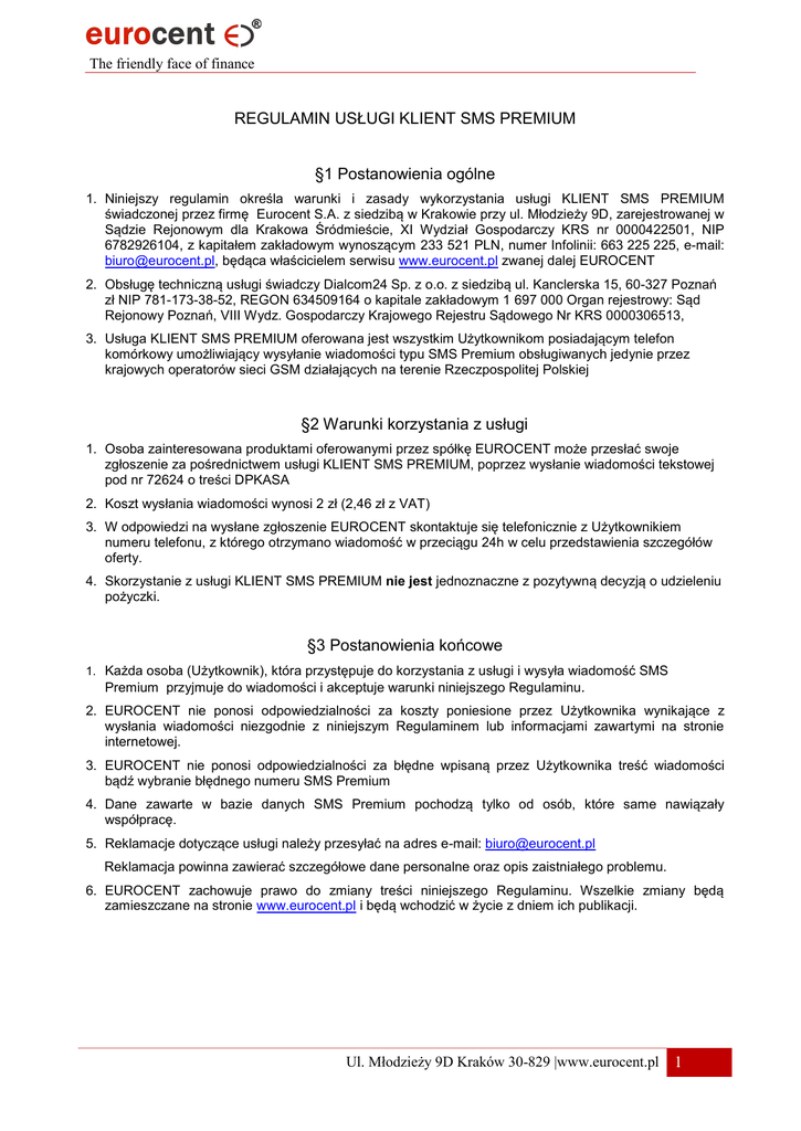 The friendly face of finance REGULAMIN USŁUGI KLIENT SMS PREMIUM §1 Postanowienia ogólne 1. Niniejszy regulamin określa warunki i zasady wykorzystania usługi KLIENT SMS PREMIUM świadczonej przez firmę Eurocent S.A. z siedzibą w Krakowie przy ul. Młodzieży 9D, zarejestrowanej w Sądzie Rejonowym dla Krakowa Śródmieście, XI Wydział Gospodarczy KRS nr 0000422501, NIP 6782926104, z kapitałem zakładowym wynoszącym 233 521 PLN, numer Infolinii: 663 225 225, e-mail: [email protected], będąca właścicielem serwisu www.eurocent.pl zwanej dalej EUROCENT 2. Obsługę techniczną usługi świadczy Dialcom24 Sp. z o.o. z siedzibą ul. Kanclerska 15, 60-327 Poznań zł NIP 781-173-38-52, REGON 634509164 o kapitale zakładowym 1 697 000 Organ rejestrowy: Sąd Rejonowy Poznań, VIII Wydz. Gospodarczy Krajowego Rejestru Sądowego Nr KRS 0000306513, 3. Usługa KLIENT SMS PREMIUM oferowana jest wszystkim Użytkownikom posiadającym telefon komórkowy umożliwiający wysyłanie wiadomości typu SMS Premium obsługiwanych jedynie przez krajowych operatorów sieci GSM działających na terenie Rzeczpospolitej Polskiej §2 Warunki korzystania z usługi 1. Osoba zainteresowana produktami oferowanymi przez spółkę EUROCENT może przesłać swoje zgłoszenie za pośrednictwem usługi KLIENT SMS PREMIUM, poprzez wysłanie wiadomości tekstowej pod nr 72624 o treści DPKASA 2. Koszt wysłania wiadomości wynosi 2 zł (2,46 zł z VAT) 3. W odpowiedzi na wysłane zgłoszenie EUROCENT skontaktuje się telefonicznie z Użytkownikiem numeru telefonu, z którego otrzymano wiadomość w przeciągu 24h w celu przedstawienia szczegółów oferty. 4. Skorzystanie z usługi KLIENT SMS PREMIUM nie jest jednoznaczne z pozytywną decyzją o udzieleniu pożyczki. §3 Postanowienia końcowe 1. Każda osoba (Użytkownik), która przystępuje do korzystania z usługi i wysyła wiadomość SMS Premium przyjmuje do wiadomości i akceptuje warunki niniejszego Regulaminu. 2. EUROCENT nie ponosi odpowiedzialności za koszty poniesione przez Użytkownika wynikające z wysłania wiadomości niezgodnie z niniejszym Regulaminem lub informacjami zawartymi na stronie internetowej. 3. EUROCENT nie ponosi odpowiedzialności za błędne wpisaną przez Użytkownika treść wiadomości bądź wybranie błędnego numeru SMS Premium 4. Dane zawarte w bazie danych SMS Premium pochodzą tylko od osób, które same nawiązały współpracę. 5. Reklamacje dotyczące usługi należy przesyłać na adres e-mail: [email protected] Reklamacja powinna zawierać szczegółowe dane personalne oraz opis zaistniałego problemu. 6. EUROCENT zachowuje prawo do zmiany treści niniejszego Regulaminu. Wszelkie zmiany będą zamieszczane na stronie www.eurocent.pl i będą wchodzić w życie z dniem ich publikacji. Ul. Młodzieży 9D Kraków 30-829 |www.eurocent.pl 1