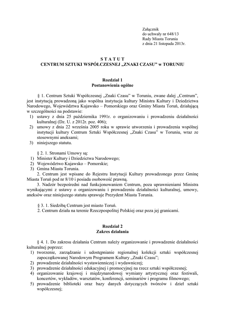 Załącznik do uchwały nr 648/13 Rady Miasta Torunia z dnia 21 listopada 2013r. STATUT CENTRUM SZTUKI WSPÓŁCZESNEJ „ZNAKI CZASU” w TORUNIU Rozdział 1 Postanowienia ogólne § 1. Centrum Sztuki Współczesnej „Znaki Czasu” w Toruniu, zwane dalej „Centrum”, jest instytucją prowadzoną jako wspólna instytucja kultury Ministra Kultury i Dziedzictwa Narodowego, Województwa Kujawsko – Pomorskiego oraz Gminy Miasta Toruń, działającą w szczególności na podstawie: 1) ustawy z dnia 25 października 1991r. o organizowaniu i prowadzeniu działalności kulturalnej (Dz. U. z 2012r. poz. 406); 2) umowy z dnia 22 września 2005 roku w sprawie utworzenia i prowadzenia wspólnej instytucji kultury Centrum Sztuki Współczesnej „Znaki Czasu” w Toruniu, wraz ze stosownymi aneksami; 3) niniejszego statutu. § 2. 1. Stronami Umowy są: 1) Minister Kultury i Dziedzictwa Narodowego; 2) Województwo Kujawsko – Pomorskie; 3) Gmina Miasta Torunia. 2. Centrum jest wpisane do Rejestru Instytucji Kultury prowadzonego przez Gminę Miasta Toruń pod nr 8/10 i posiada osobowość prawną. 3. Nadzór bezpośredni nad funkcjonowaniem Centrum, poza uprawnieniami Ministra wynikającymi z ustawy o organizowaniu i prowadzeniu działalności kulturalnej, umowy, aneksów oraz niniejszego statutu sprawuje Prezydent Miasta Torunia. § 3. 1. Siedzibą Centrum jest miasto Toruń. 2. Centrum działa na terenie Rzeczpospolitej Polskiej oraz poza jej granicami. Rozdział 2 Zakres działania § 4. 1. Do zakresu działania Centrum należy organizowanie i prowadzenie działalności kulturalnej poprzez: 1) tworzenie, zarządzanie i udostępnianie regionalnej kolekcji sztuki współczesnej zapoczątkowanej Narodowym Programem Kultury „Znaki Czasu”; 2) prowadzenie działalności wystawienniczej i wydawniczej; 3) prowadzenie działalności edukacyjnej i promocyjnej na rzecz sztuki współczesnej; 4) organizowanie krajowej i międzynarodowej wymiany artystycznej oraz festiwali, koncertów, wykładów, warsztatów, konferencji, seminariów i programu filmowego; 5) prowadzenie biblioteki oraz bazy danych dotyczących twórców i dzieł sztuki współczesnej; 6) współdziałanie ze środowiskami twórczymi oraz z polskimi i zagranicznymi podmiotami publicznymi i prywatnymi w zakresie rozwoju sztuki współczesnej. 2. Przy realizacji zadań określonych w ust. 1 Centrum współpracuje z osobami fizycznymi, osobami prawnymi i jednostkami organizacyjnymi nie posiadającymi osobowości prawnej. Rozdział 3 Organy zarządzające, nadzorujące i doradcze § 5. 1. Centrum zarządza samodzielnie dyrektor, który reprezentuje instytucję na zewnątrz i jest za nią odpowiedzialny, z zastrzeżeniem § 10. 2. Dyrektor Centrum jest odpowiedzialny za funkcjonowanie instytucji oraz za przestrzeganie postanowień niniejszego statutu. 3. Dyrektor będzie powoływany i odwoływany w trybie określonym w ustawie o organizowaniu i prowadzeniu działalności kulturalnej, z tym, że dyrektora Centrum powołuje i odwołuje Prezydent Miasta Torunia, po uzyskaniu opinii pozostałych stron umowy. 4. W przypadku powołania dyrektora w trybie konkursu strony umowy wyznaczają swoich przedstawicieli do komisji konkursowej. 5. Do zakresu działalności dyrektora należy w szczególności: 1) przygotowanie i realizacja rocznego planu finansowego; 2) opracowanie i realizacja programu działalności merytorycznej Centrum; 3) przygotowanie półrocznego i rocznego sprawozdania z przebiegu wykonania planu finansowego instytucji w trybie i terminach określonych w przepisach ustawy z dn. 27 sierpnia 2009 r. o finansach publicznych; 4) przygotowywanie półrocznego i rocznego sprawozdania z realizacji programu działalności merytorycznej Centrum; 5) przedstawianie planów, programów i sprawozdań, o których mowa w p-ktach 1-4 Prezydentowi Miasta Torunia; 6) nadzór nad mieniem i nad całością gospodarki finansowej instytucji; 7) ustalanie regulaminu pracy; 8) wydawanie instrukcji i zarządzeń wewnętrznych; 9) realizacja innych czynności powierzonych przez Prezydenta Miasta Torunia. 6. Dyrektor może powołać i odwołać jednego zastępcę dyrektora do spraw programowych, w uzgodnieniu z Prezydentem Miasta Torunia, po zasięgnięciu opinii Ministra Kultury i Dziedzictwa Narodowego oraz Województwa Kujawsko – Pomorskiego. § 6. Organizację wewnętrzną Centrum określa regulamin organizacyjny nadawany przez dyrektora, po zasięgnięciu opinii Prezydenta Miasta Torunia, Województwa KujawskoPomorskiego, Ministra Kultury i Dziedzictwa Narodowego oraz opinii działających w Centrum organizacji związkowych i stowarzyszeń twórców. § 7. 1. Organem opiniodawczo – doradczym Centrum jest rada programowa, powoływana przez Prezydenta Miasta Torunia, na czteroletnią kadencję spośród osób posiadających wysokie kwalifikacje i doświadczenie w zakresie tworzenia, upowszechniania i ochrony kultury, desygnowanych przez: 1) Ministra Kultury i Dziedzictwa Narodowego – 3 osoby; 2) Marszałka Województwa Kujawsko – Pomorskiego – 2 osoby; 3) Prezydenta Miasta Torunia – 2 osoby; 4) Stowarzyszenie Przyjaciół Sztuk Pięknych „Znaki Czasu” – 2 osoby. 2. Pracami rady programowej kieruje przewodniczący, wybrany spośród członków rady w głosowaniu tajnym. 3. Zasady i tryb działania rady programowej określa uchwalony przez nią regulamin. Rozdział 4 Gospodarka finansowa § 8. 1. Centrum gospodaruje samodzielnie przydzieloną i nabytą częścią mienia oraz prowadzi samodzielną gospodarkę w ramach posiadanych środków, kierując się zasadami gospodarności i efektywności ich wykorzystania. 2. Centrum prowadzi gospodarkę finansową na zasadach określonych w ustawie o organizowaniu i prowadzeniu działalności kulturalnej oraz w innych przepisach powszechnie obowiązujących. 3. Podstawą gospodarki finansowej Centrum jest roczny plan finansowy ustalony przez dyrektora z zachowaniem wysokości dotacji Organizatora ora
