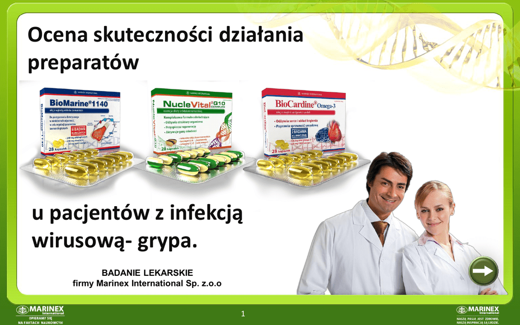 Ocena skuteczności działania preparatów u pacjentów z infekcją wirusową- grypa. BADANIE LEKARSKIE firmy Marinex International Sp. z.o.o 1 Pacjenci zostali podzieleni na dwie grupy: Badaną – stosującą leki przeciwgorączkowe, przeciwzapalne i suplementy diety: Kontrolną – stosującą leki przeciwgorączkowe, przeciwzapalne i antybiotyki (standardową kurację) 2 2 Szczegóły techniczne badania Badanie prowadzono w 2 ośrodkach podstawowej opieki zdrowotnej w Łodzi. Cel badania: Ocena skuteczności działania preparatów , i stosowanych równocześnie, u pacjentów z infekcją wirusową - grypa. Czas trwania badania: Ośrodek nr 1 – 6 miesięcy Ośrodek nr 2 – 5 miesięcy 3 UCZESTNICY: W badaniu lekarskim uczestniczyło 80 osób w przedziale wiekowym 19-65 lat. Ośrodek nr 1 – 40 osób Grupa kontrolna 20 osób Ośrodek nr 2 – 40 osób Grupa badana Grupa kontrolna 20 osób 20 osób Grupa badana 20 osób Pacjenci zgłaszali się do lekarza z objawami: wysoka gorączka, bóle głowy, bóle mięśniowe, katar, zapalenie spojówek, kaszel, złe samopoczucie, uczucie rozbicia, bezsenność. 4 Stosowane leczenie: • Grupa kontrolna: antybiotyki i leki objawowe • Grupa badana: leki objawowe i suplementy firmy Marinex. Bez stosowania antybiotyków (stosowane tylko w razie konieczności) TABELA PODZIAŁU ODPOWIEDNICH DAWEK PREPARATU RANO 4 Kapsułki 2 Kapsułki 2 Kapsułki PRZED POŁUDNIEM 3 Kapsułki 1 Kapsułka 3 Kapsułki PO POŁUDNIU 4 Kapsułki 2 Kapsułki 2 Kapsułki WIECZÓR 3 Kapsułki 1 Kapsułka 3 Kapsułki Pierwsza wizyta po 7 dniach stosowania druga po 14 dniach. 5 Wyniki: W grupie badanej już po tygodniu u 90% chorych nastąpiła zdecydowana poprawa stanu zdrowia: • ustąpiły objawy chorobowe, • okres rekonwalescencji został skrócony do minimum, • w znaczący sposób odbudowana została siła organizmu. 6 Wyniki: Dodatkowo osoby z grupy badanej zauważyły znaczącą poprawę ogólnego stanu zdrowia, zwłaszcza: • • • • wyostrzenie wzroku, polepszenie ruchu w stawach, spłycenie zmarszczek, zmniejszenie problemów z trądzikiem. 7 Wyniki cd.: W grupie kontrolnej aż u co trzeciego z chorych dolegliwości nie minęły po okresie 7 dni, a co więcej, zaobserwowano nawrót infekcji, co spowodowało konieczność przedłużenia leczenia o kolejne 7-12 dni. Zaobserwowano również większą liczbę powikłań pochorobowych (zapalenie oskrzeli, ucha angina). 8 Wnioski: 1. Stosowanie preparatów , , zwiększa skuteczność kuracji zdrowotnej i skraca do minimum proces rekonwalescencji po infekcji. Czyli krócej chorujemy. 2. W trakcie infekcji jest bardzo zasadne stosowanie dużych dawek preparatów (14+6+8 dziennie/14 dni), ponieważ organizm otrzymuje zastrzyk substancji budulcowych uruchamiający jego mechanizmy obronno-regeneracyjne. 9 Wnioski cd.: 3. Preparaty , , przynoszą dodatkowe efekty zdrowotne, dlatego powinniśmy je stosować w ilościach profilaktycznych codziennie nawet gdy jesteśmy zdrowi. Odżywienie organizmu właściwymi ilościami substancji budulcowych podczas infekcji wirusowej jest niezastąpionym elementem skutecznej terapii. 10 Kliknij i przejdź do serwisu grypowego >> 11 11
