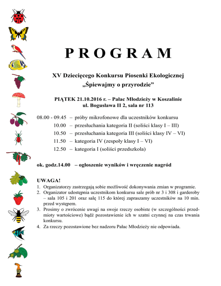 PROGRAM XV Dziecięcego Konkursu Piosenki Ekologicznej „Śpiewajmy o przyrodzie” PIĄTEK 21.10.2016 r. – Pałac Młodzieży w Koszalinie ul. Bogusława II 2, sala nr 113 08.00 - 09.45 – próby mikrofonowe dla uczestników konkursu 10.00 – przesłuchania kategoria II (soliści klasy I – III) 10.50 – przesłuchania kategoria III (soliści klasy IV – VI) 11.50 – kategoria IV (zespoły klasy I – VI) 12.50 – kategoria I (soliści przedszkola) ok. godz.14.00 – ogłoszenie wyników i wręczenie nagród UWAGA! 1. Organizatorzy zastrzegają sobie możliwość dokonywania zmian w programie. 2. Organizator udostępnia uczestnikom konkursu sale prób nr 3 i 308 i garderoby – sala 105 i 201 oraz salę 115 do której zapraszamy uczestników na 10 min. przed występem. 3. Prosimy o zwrócenie uwagi na swoje rzeczy osobiste (w szczególności przedmioty wartościowe) bądź pozostawienie ich w szatni czynnej na czas trwania konkursu. 4. Za rzeczy pozostawione bez nadzoru Pałac Młodzieży nie odpowiada. KOLEJNOŚĆ PREZENTACJI GODZ. 10.00 Kategoria II – soliści klasy I – III 1. 2. 3. 4. 5. 6. 7. 8. 9. 10. Maja Stencel Joanna Rybczyńska Kamila Świątkiewicz Aniela Kowalska Julia Ciesielska Anna Zawiska Milena Bogucka Lilia Hnat Anna Puława Gracjana Bielak – – – – – – – – – – „Kolorowa zagadka” „Ziemia, wyspa zielona” „Duszki Leśne” „Pięknie żyć” „Piosenka Biedronki” „Moja Planeta” „Puszek okruszek” „Do słońca leć” „Ekoskrzat” „Rudy rydz” GODZ. 10.50 Kategoria III – klasy IV– VI 1. 2. 3. 4. 5. 6. 7. 8. 9. 10. 11. 12. Julia Knop Zuzanna Jastrzębska Maja Popiołek Agnieszka Herman Zuzanna Ostaszewska Karina Kępa Maja Sobieraj Julia Olejarz Julia Rybka Zofia Tymna Agata Brandenburger Piotr Hałasa – – – – – – – – – – – – „Kociopieska piosenka” „Nadzieja ma kolor zielony” „Walczyk z liściem na 3/4” „Pszczoły na wrotkach” „Śmieszna piosenka” „Koci wesoły świat” „Kocham cały świat” „Kochaj czworonogi” „Gołębi song” „Pieski małe dwa” „Wesoły pociąg” „Zacznij od Bacha” 1. 2. 3. 4. 5. 6. 7. 8. 9. 10. GODZ. 11.50 Kategoria IV – zespoły wokalne do 13 lat (max 8 osób) Zespół ARTBUZKI – „Zielone żabki” Zespół RAZEM – „Do słońca leć” Zespół SZÓSTECZKA – „Pióreczko” Martyna Burak z chórkiem – „Otwórz oczy” Cezary Białas z chórkiem – „Bardzo smutna piosenka w stylu retro” Zespół TAKT – „Tańcz, tańcz” Duet MAJA – NATALIA – „Deszczyk MINI STUDIO POEZJI I PIOSENKI – „Powrót Wiosny” Zespół DO-RE-MI – „Pory roku” Zespół ŚPIEWAJĄCE NUTKI – „Świat bez wody” GODZ. 12.50 Kategoria I – soliści przedszkola 1. Julia Pałuczak – „Gdzieś nad łąką mądre pszczółki” 2. Zuzanna Odrowęź-Petrykowska – „Rozśpiewany las” 3. Wiktoria Kulicz – „Wiewióreczka” 4. Antonina Wojciul – „Posprzątaj świat” 5. Natalia Jankowska – „Była sobie żabka mała” 6. Paweł Bielak – „Kolorowa Jesień” 7. Hanna Stawska – „Kolorowy wiatr” OKOŁO GODZ. 14.00 - OGŁOSZENIE WYNIKÓW I WRĘCZENIE NAGRÓD