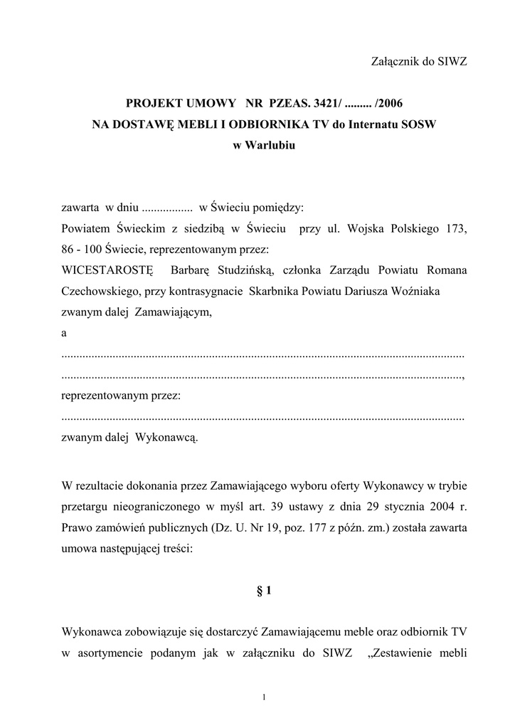 Załącznik do SIWZ PROJEKT UMOWY NR PZEAS. 3421/ ......... /2006 NA DOSTAWĘ MEBLI I ODBIORNIKA TV do Internatu SOSW w Warlubiu zawarta w dniu ................. w Świeciu pomiędzy: Powiatem Świeckim z siedzibą w Świeciu przy ul. Wojska Polskiego 173, 86 - 100 Świecie, reprezentowanym przez: WICESTAROSTĘ Barbarę Studzińską, członka Zarządu Powiatu Romana Czechowskiego, przy kontrasygnacie Skarbnika Powiatu Dariusza Woźniaka zwanym dalej Zamawiającym, a ...................................................................................................................................... ....................................................................................................................................., reprezentowanym przez: ...................................................................................................................................... zwanym dalej Wykonawcą. W rezultacie dokonania przez Zamawiającego wyboru oferty Wykonawcy w trybie przetargu nieograniczonego w myśl art. 39 ustawy z dnia 29 stycznia 2004 r. Prawo zamówień publicznych (Dz. U. Nr 19, poz. 177 z późn. zm.) została zawarta umowa następującej treści: §1 Wykonawca zobowiązuje się dostarczyć Zamawiającemu meble oraz odbiornik TV w asortymencie podanym jak w załączniku do SIWZ 1 „Zestawienie mebli i odbiornika TV” a Zamawiający zobowiązuje się odebrać meble i odbiornik TV, zapłacić Wykonawcy umówione wynagrodzenie. §2 1. Dostarczenie mebli i odbiornika TV nastąpi, w terminie: do 29.09.2006 r., po podpisaniu umowy przez obie strony. 2. Dostawa zamówionych mebli i odbiornika nastąpi do Internatu Specjalnego Ośrodka Szkolno - Wychowawczego w Warlubiu przy ul. Szkolnej 8. 3. Meble i odbiornik TV dostarczone będą transportem Wykonawcy. Koszt dowozu jest wliczony w cenę końcową za całe zamówienie. Cena końcowa zawiera podatek VAT. §3 1. Zamawiający dokona odbioru dostarczonych mebli i odbiornika TV pod względem ilościowym i jakościowym w dniu dostarczenia ich do Internatu Specjalnego Ośrodka Szkolno - Wychowawczego w Warlubiu. 2. Dostawca obowiązany jest powiadomić Zamawiającego o terminie dowiezienia mebli i odbiornika TV do Internatu Specjalnego Ośrodka Szkolno - Wychowawczego w Warlubiu, na 3 dni przed planowanym terminem ich dostarczenia. §4 1. Dostawca powinien na fakturze za dostarczone meble i odbiornik TV wpisać nazwę: Powiat Świecki, 86 - 100 Świecie, ul. Wojska Polskiego 173, NIP 559 - 187 - 68 - 20. 2. Za dostarczone meble i odbiornik TV Wykonawca wystawi fakturę adresowaną jw. wg ilości i asortymentu wskazanego w SIWZ. 2 3. Strony ustalają termin płatności przelewem do 30 dni od chwili dostarczenia faktury. §5 Zamawiający zapłaci za dostarczone meble i odbiornik TV cenę ustaloną na podstawie ilości podanej w SIWZ i cen jednostkowych brutto podanych w ofercie: 1) Wartość dostawy netto: ......................................................... złotych (słownie: ................................................................. 00/100) 2) NaleŜny podatek VAT: .................................................... (słownie: ...................................................................... złotych 00/100) 3) Wartość dostawy brutto: .......................................................... złotych (słownie: ...................................................................................... 00/100) §6 1. Jakość dostarczonych mebli i odbiornika TV powinna odpowiadać wymogom podanym w SIWZ. 2. W razie stwierdzenia złej jakości dostarczonych mebli i odbiornika TV Zamawiający prześle reklamację do Wykonawcy, który udzieli pisemnej odpowiedzi na nią w ciągu 3 dni od dnia jej otrzymania. 3. Wykonawca zobowiązuje się do przestrzegania Polskich Norm oraz do sprzedaŜy Zamawiającemu mebli i odbiornika TV odpowiednio oznaczonego, posiadającego zezwolenie dopuszczające do stosowania w szkolnictwie specjalnym. §7 1. W razie wystąpienia opóźnienia w dostarczeniu mebli i odbiornika TV Wykonawca zobowiązuje się do zapłaty Zamawiającemu kary umownej w wysokości 1 % od wartości umowy za kaŜdy dzień opóźnienia, nie więcej niŜ 20 % wartości zamówienia. 3 2. W przypadku nie uiszczenia w terminie zapłaty naleŜności za dostarczone meble i odbiornik TV Zamawiający zapłaci ustawowe odsetki. §8 Wszelkie zmiany niniejszej umowy wymagają formy pisemnej pod rygorem niewaŜności. §9 W sprawach nieuregulowanych w niniejszej umowie stosuje się przepisy kodeksu cywilnego. § 10 Niniejszą umowę sporządzono w trzech jednobrzmiących egzemplarzach z czego jeden egzemplarz dla Wykonawcy i dwa egzemplarze dla Zamawiającego. ZAMAWIAJĄCY WYKONAWCA 4