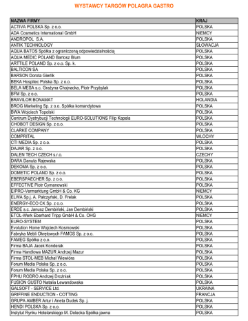 WYSTAWCY TARGÓW POLAGRA GASTRO NAZWA FIRMY ACTIVA POLSKA Sp. z o.o. ADA Cosmetics International GmbH ANDROPOL S.A. ANTIK TECHNOLOGY AQUA BATOS Spółka z ograniczoną odpowiedzialnością AQUA MEDIC POLAND Bartosz Blum ARTTILE POLAND Sp. z o.o. Sp. k. BALTICON SA BARSON Dorota Gierlik BEKA Hospitec Polska Sp. z o.o. BELA MESA s.c. Grażyna Chojnacka, Piotr Przybylak BFM Sp. z o.o. BRAVILOR BONAMAT BROG Marketing Sp. z o.o. Spółka komandytowa BWA Wojciech Topolski Centrum Dystrybucji Technologii EURO-SOLUTIONS Filip Kapela CHOBOT DESIGN Sp. z o.o. CLARKE COMPANY COMPRITAL CTI MEDIA Sp. z o.o. DAJAR Sp. z o.o. DALEN TECH CZECH s.r.o. DARA Danuta Rajewska DEKOMA Sp. z o.o. DOMETIC POLAND Sp. z o.o. EBERSPAECHER Sp. z o.o. EFFECTIVE Piotr Cymanowski EIPRO-Vermarktung GmbH & Co. KG ELWA Sp.j. A. Pałczyński, D. Frelak ENERGY-ECO CK Sp. z o.o. ERDE s.c. Janusz Dembiński, Jan Dembiński ETOL-Werk Eberhard Tripp GmbH & Co. OHG EURO-SYSTEM Evolution Home Wojciech Kosmowski Fabryka Mebli Okrętowych FAMOS Sp. z o.o. FAMEG Spółka z o.o. Firma BAJA Jacek Konderak Firma Handlowa MAZUR Andrzej Mazur Firma STOL-MEB Michał Wiewióra Forum Media Polska Sp. z o.o. Forum Media Polska Sp. z o.o. FPHU RODRO Andrzej Drożniak FUSION GUSTO Natalia Lewandowska GALSOFT - SERVICE Ltd. GRIFFINE ENDUCTION - COTTING GRUPA AMBER Artur i Aneta Dudek Sp. j. HENDI POLSKA Sp. z o.o. Instytut Rynku Hotelarskiego M. Dolecka Spółka jawna KRAJ POLSKA NIEMCY POLSKA SŁOWACJA POLSKA POLSKA POLSKA POLSKA POLSKA POLSKA POLSKA POLSKA HOLANDIA POLSKA POLSKA POLSKA POLSKA POLSKA WŁOCHY POLSKA POLSKA CZECHY POLSKA POLSKA POLSKA POLSKA POLSKA NIEMCY POLSKA POLSKA POLSKA NIEMCY POLSKA POLSKA POLSKA POLSKA POLSKA POLSKA POLSKA POLSKA POLSKA POLSKA POLSKA UKRAINA FRANCJA POLSKA POLSKA POLSKA INTER-PLAST Z.Bodziachowska-Kluza Sp.j. JMB Spółka z o.o. KASO Tadeusz Krawczyk KOMAT Mieczysław Kozłowski KOMI Michał Kopczyński KOREE Sp. z o.o. KROSNO METAL Sp. z o.o. Krośnieńskie Huty Szkła KROSNO S.A. MAGOD Łukasz Karolak MaisondeRome INTERIOR DESIGN MARATHON Barbara Jakubowska MM BROWN POLSKA Sp. z o.o Sp.k. MM-PREMIUM Małgorzata Mrówczyńska MODERN LIGHTING Krzysztof Szyszka Morello Forni S.a.s. MULTIVAC Sp. z o.o. MR.HASH Piotr Terlikowski Nakielskie Zakłady Maszyn i Urządzeń Gastronomicznych SPOMASZ - NAKŁO Sp. z o.o. NORDZUCKER POLSKA SA NOTI Sp. z o.o. P.H.U. INTERSUN Rafał Marut PAGED MEBLE S.A. Petit Forestier Polska Sp. z o.o. PFLEIDERER GRAJEWO S.A. PHU DAMAT Dariusz Orzeł PHUP Wiesław Zajączek PLASTMET Spółka z ograniczoną odpowiedzialnością spółka komandytowa Polskie Wydawnictwa Specjalistyczne PROMEDIA Sp. z o.o. PRIMULATOR Sp. z o.o. PRO ASCOBLOC Sp. z o.o. PROFITROOM Sp. z o.o. Przedsiębiorstwo Budowlane SPEC - BUD Sp. z o.o. Przedsiębiorstwo Handlowo-Usługowe CHEMAN Anna Rogozińska RATIONAL Sp. z o.o. RIDEX DEKORACJA Sp. z o.o. Sp.k. RM GASTRO POLSKA Sp. z o.o. ROBOT-COUPE ROTR Spółdzielnia Mleczarska w Rypinie RTM Sport Sp. z o.o. ScanBox Thermo Products AB SCM sp. z o.o. SETART WNĘTRZA SIGIS Grzegorz Sikora SIMCOM Maciej Idaszak SOFTECH Sp. z o.o. SPA Sp. z o.o. STALGAST Sp. z o.o. TECH Sp. z o.o. TENZI Sp. z o.o. UAB ASA PREKYBA UAB SOFTLINES UNILEVER POLSKA Sp. z o.o. POLSKA POLSKA POLSKA POLSKA POLSKA POLSKA POLSKA POLSKA POLSKA POLSKA POLSKA POLSKA POLSKA POLSKA WŁOCHY POLSKA POLSKA POLSKA POLSKA POLSKA POLSKA POLSKA POLSKA POLSKA POLSKA POLSKA POLSKA POLSKA POLSKA POLSKA POLSKA POLSKA POLSKA POLSKA POLSKA POLSKA FRANCJA POLSKA POLSKA SZWECJA POLSKA POLSKA POLSKA POLSKA POLSKA POLSKA POLSKA POLSKA POLSKA LITWA LITWA POLSKA VFP Communications Ltd Sp. z o.o. WINTERHALTER GASTRONOM POLSKA Sp. z o.o. WIPETECH POLSKA Sp. z o.o. Spółka Komandytowa Władysław Brzeziński Ma Foi! WODA BONART-POZNAŃ Anita Dyzert POLSKA POLSKA POLSKA POLSKA POLSKA