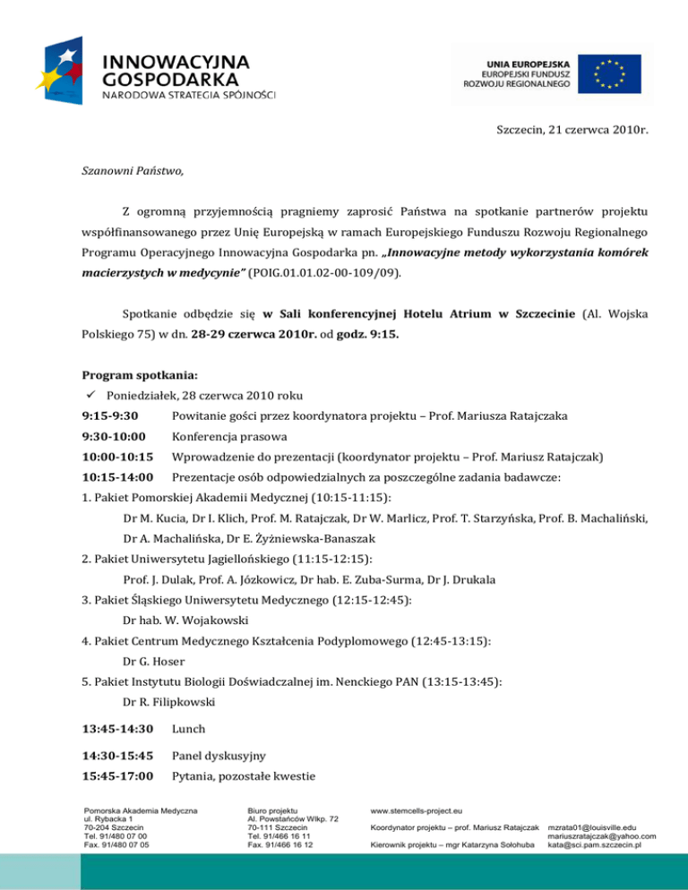 Szczecin, 21 czerwca 2010r. Szanowni Państwo, Z ogromną przyjemnością pragniemy zaprosić Państwa na spotkanie partnerów projektu współfinansowanego przez Unię Europejską w ramach Europejskiego Funduszu Rozwoju Regionalnego Programu Operacyjnego Innowacyjna Gospodarka pn. „Innowacyjne metody wykorzystania komórek macierzystych w medycynie” (POIG.01.01.02-00-109/09). Spotkanie odbędzie się w Sali konferencyjnej Hotelu Atrium w Szczecinie (Al. Wojska Polskiego 75) w dn. 28-29 czerwca 2010r. od godz. 9:15. Program spotkania: Poniedziałek, 28 czerwca 2010 roku 9:15-9:30 Powitanie gości przez koordynatora projektu – Prof. Mariusza Ratajczaka 9:30-10:00 Konferencja prasowa 10:00-10:15 Wprowadzenie do prezentacji (koordynator projektu – Prof. Mariusz Ratajczak) 10:15-14:00 Prezentacje osób odpowiedzialnych za poszczególne zadania badawcze: 1. Pakiet Pomorskiej Akademii Medycznej (10:15-11:15): Dr M. Kucia, Dr I. Klich, Prof. M. Ratajczak, Dr W. Marlicz, Prof. T. Starzyńska, Prof. B. Machaliński, Dr A. Machalińska, Dr E. Żyżniewska-Banaszak 2. Pakiet Uniwersytetu Jagiellońskiego (11:15-12:15): Prof. J. Dulak, Prof. A. Józkowicz, Dr hab. E. Zuba-Surma, Dr J. Drukala 3. Pakiet Śląskiego Uniwersytetu Medycznego (12:15-12:45): Dr hab. W. Wojakowski 4. Pakiet Centrum Medycznego Kształcenia Podyplomowego (12:45-13:15): Dr G. Hoser 5. Pakiet Instytutu Biologii Doświadczalnej im. Nenckiego PAN (13:15-13:45): Dr R. Filipkowski 13:45-14:30 Lunch 14:30-15:45 Panel dyskusyjny 15:45-17:00 Pytania, pozostałe kwestie Pomorska Akademia Medyczna ul. Rybacka 1 70-204 Szczecin Tel. 91/480 07 00 Fax. 91/480 07 05 Biuro projektu Al. Powstańców Wlkp. 72 70-111 Szczecin Tel. 91/466 16 11 Fax. 91/466 16 12 www.stemcells-project.eu Koordynator projektu – prof. Mariusz Ratajczak Kierownik projektu – mgr Katarzyna Sołohuba [email protected] [email protected] [email protected] Wtorek, 29 czerwca 2010 roku 9:00-9:15 Powitanie gości przez koordynatora projektu – Prof. Mariusza Ratajczaka 9:15-11:30 Prezentacja osób odpowiedzialnych za sprawy administracyjne jednostek 1. Pakiet Pomorskiej Akademii Medycznej 2. Pakiet Uniwersytetu Jagiellońskiego: 3. Pakiet Śląskiego Uniwersytetu Medycznego 4. Pakiet Centrum Medycznego Kształcenia Podyplomowego 5. Pakiet Instytutu Biologii Doświadczalnej im. Nenckiego PAN 11:30-13:00 Panel dyskusyjny 13:00-13:45 Lunch 13:45-15:00 Pozostałe kwestie, zakończenie spotkania. Z poważaniem, Koordynator projektu – Prof. Mariusz Ratajczak Pomorska Akademia Medyczna ul. Rybacka 1 70-204 Szczecin Tel. 91/480 07 00 Fax. 91/480 07 05 Biuro projektu Al. Powstańców Wlkp. 72 70-111 Szczecin Tel. 91/466 16 11 Fax. 91/466 16 12 www.stemcells-project.eu Koordynator projektu – prof. Mariusz Ratajczak Kierownik projektu – mgr Katarzyna Sołohuba [email protected] [email protected] [email protected]